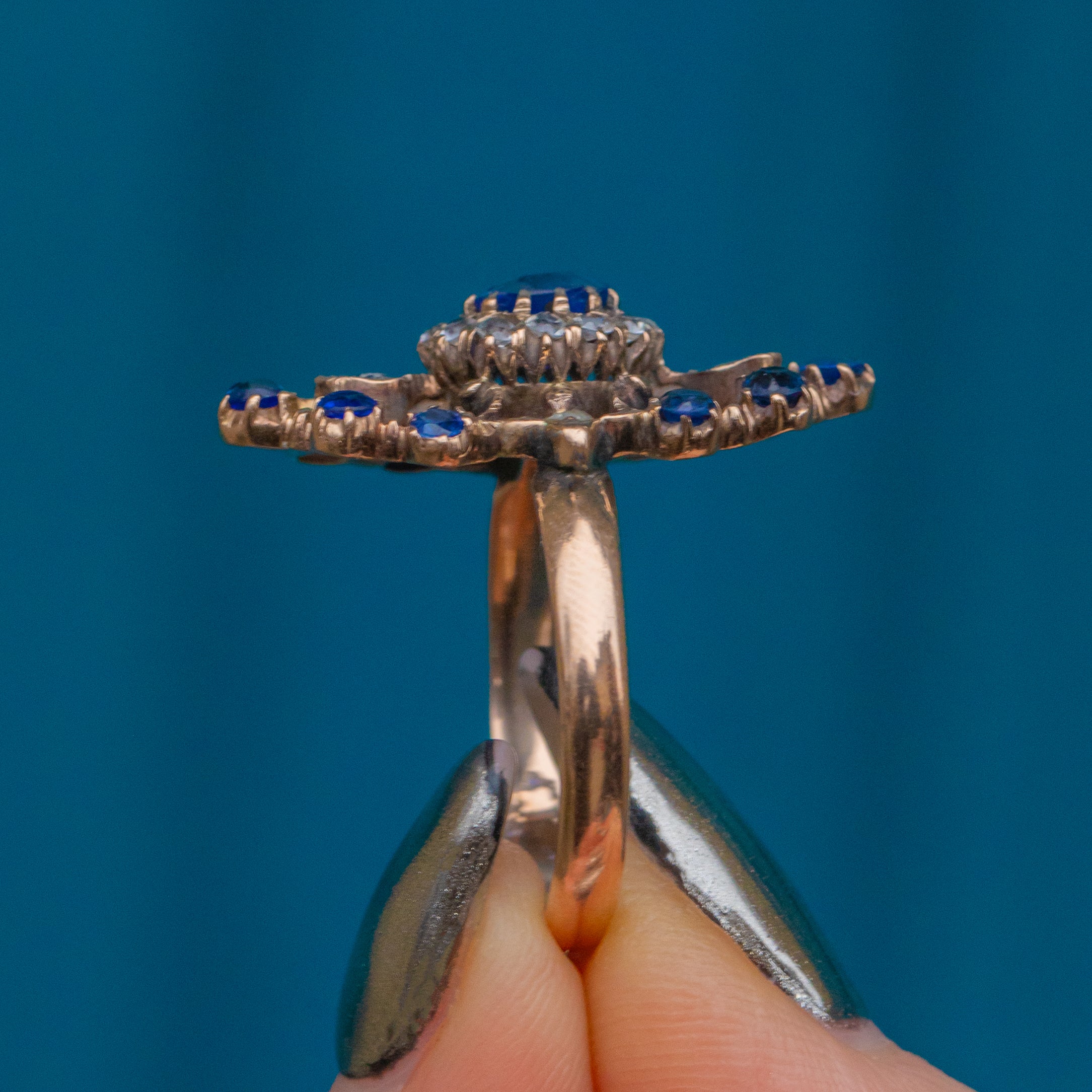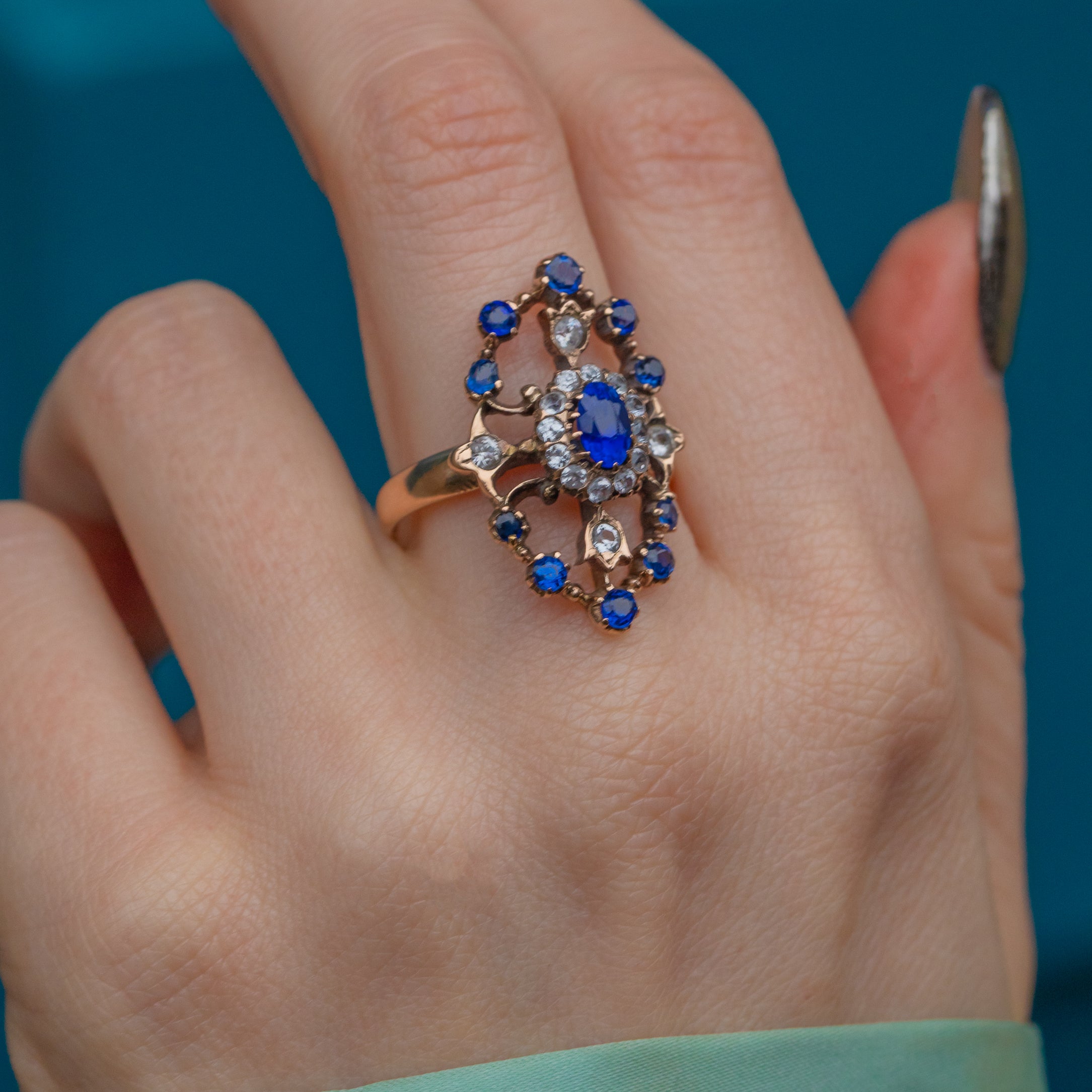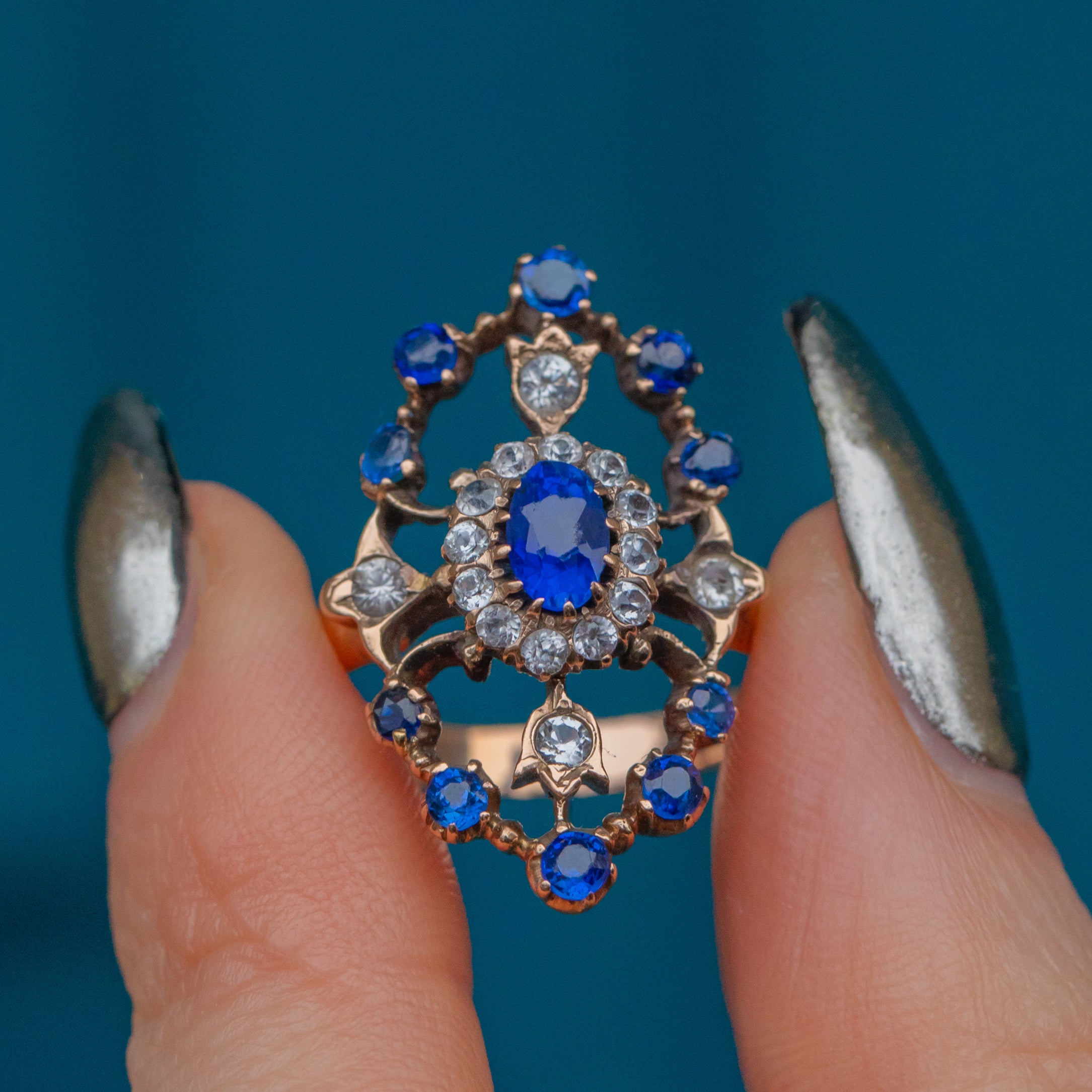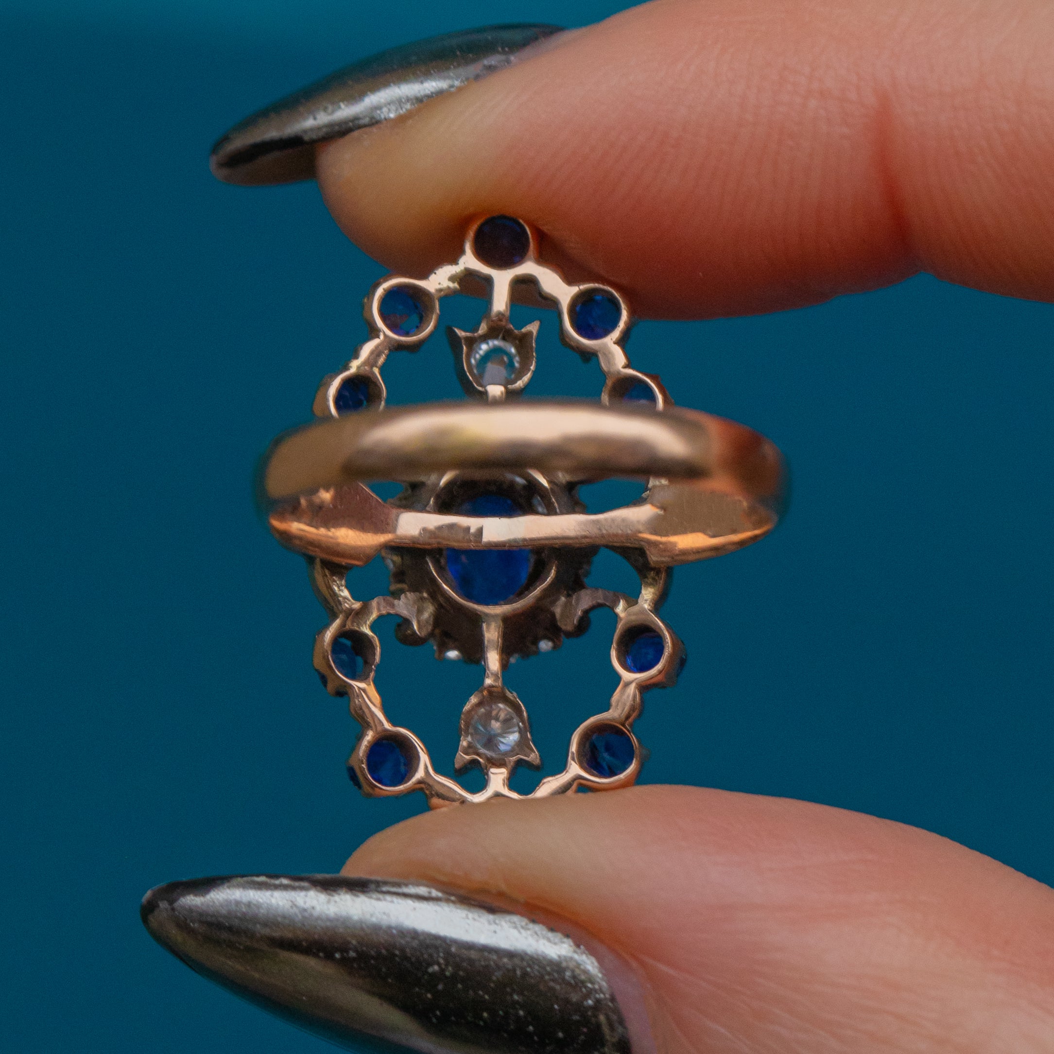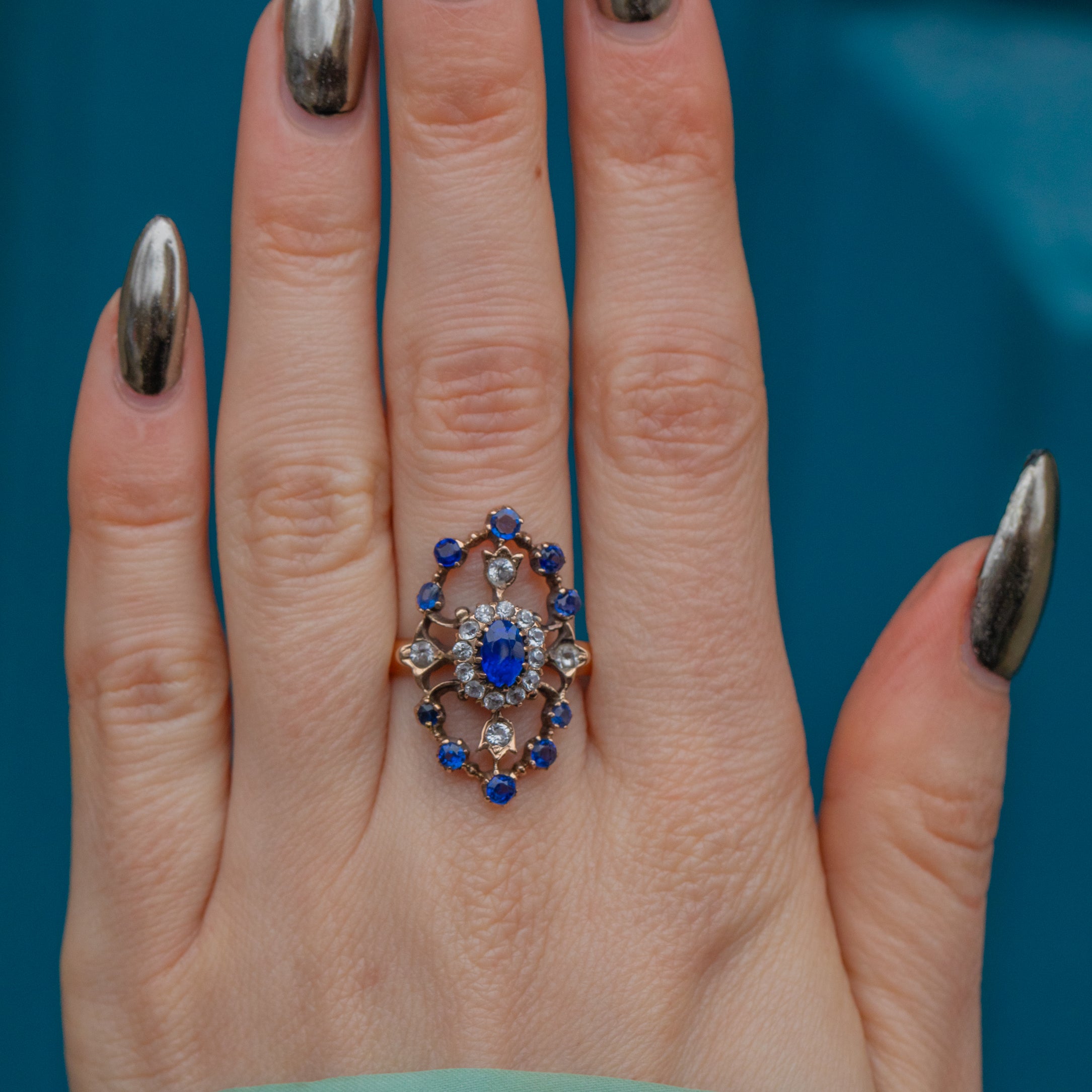 This antique ring is a true celebration of the exquisite craftsmanship of the Victorian era, with its ornately formed 15ct Gold and the decorative cluster of natural Sapphires that come to life under the light! If you are looking for a unique engagement ring or simply love resplendent jewels, this Victorian Sapphire ring is a must-have!