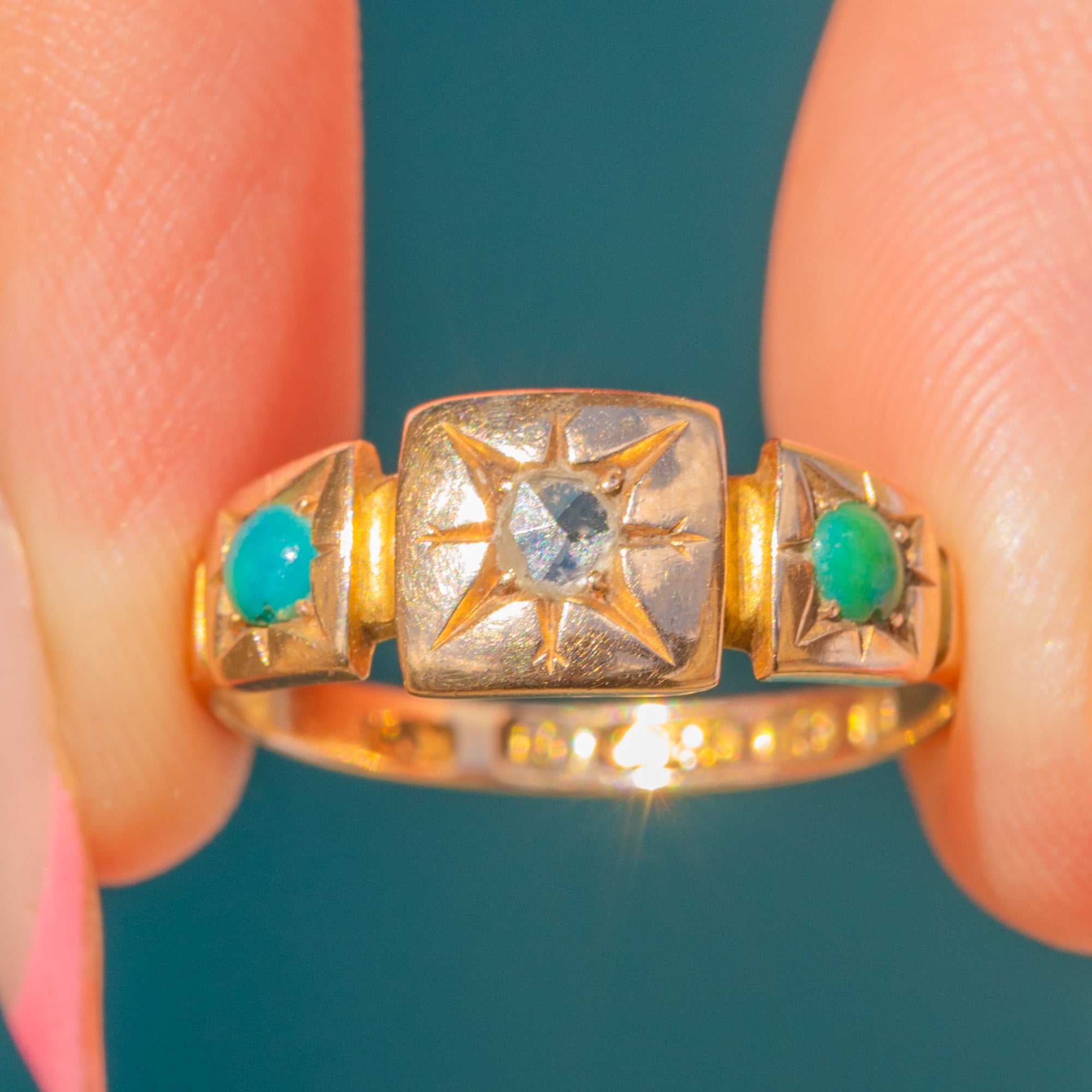 Antique 15ct Gold Turquoise Diamond Star Set Gypsy Ring c.1900