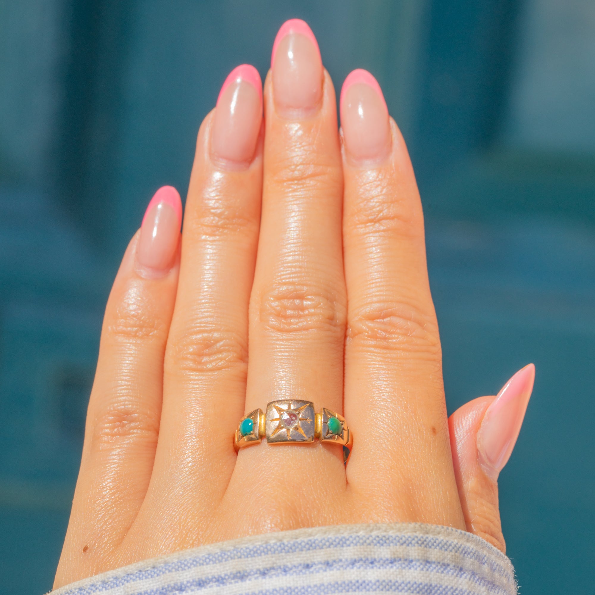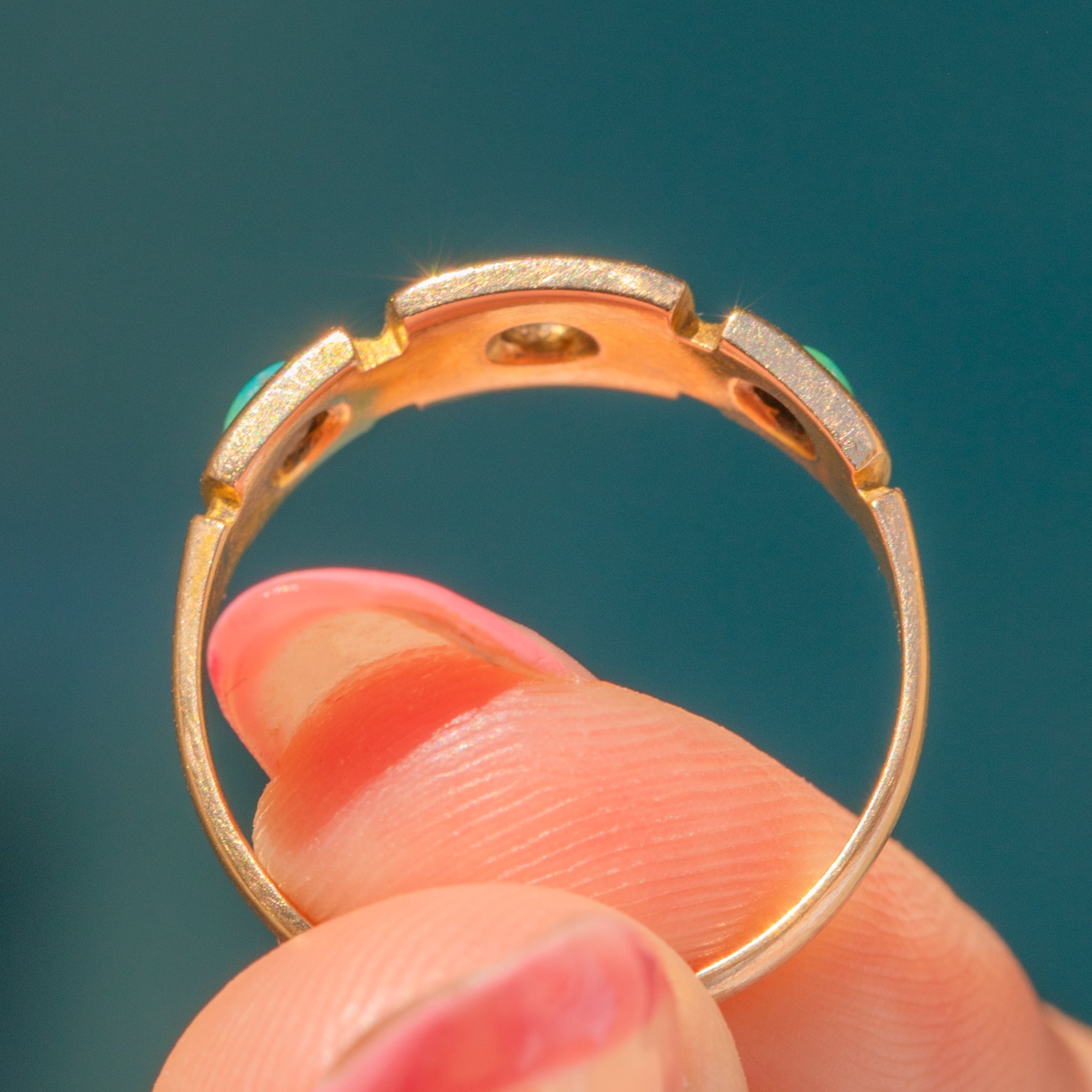 At her heart lies a sparkling star-set rose-cut Diamond, flanked by a vivid blue and verdant green Turquoise stone, all flush set for a sleek, comfortable fit ideal for daily wear.