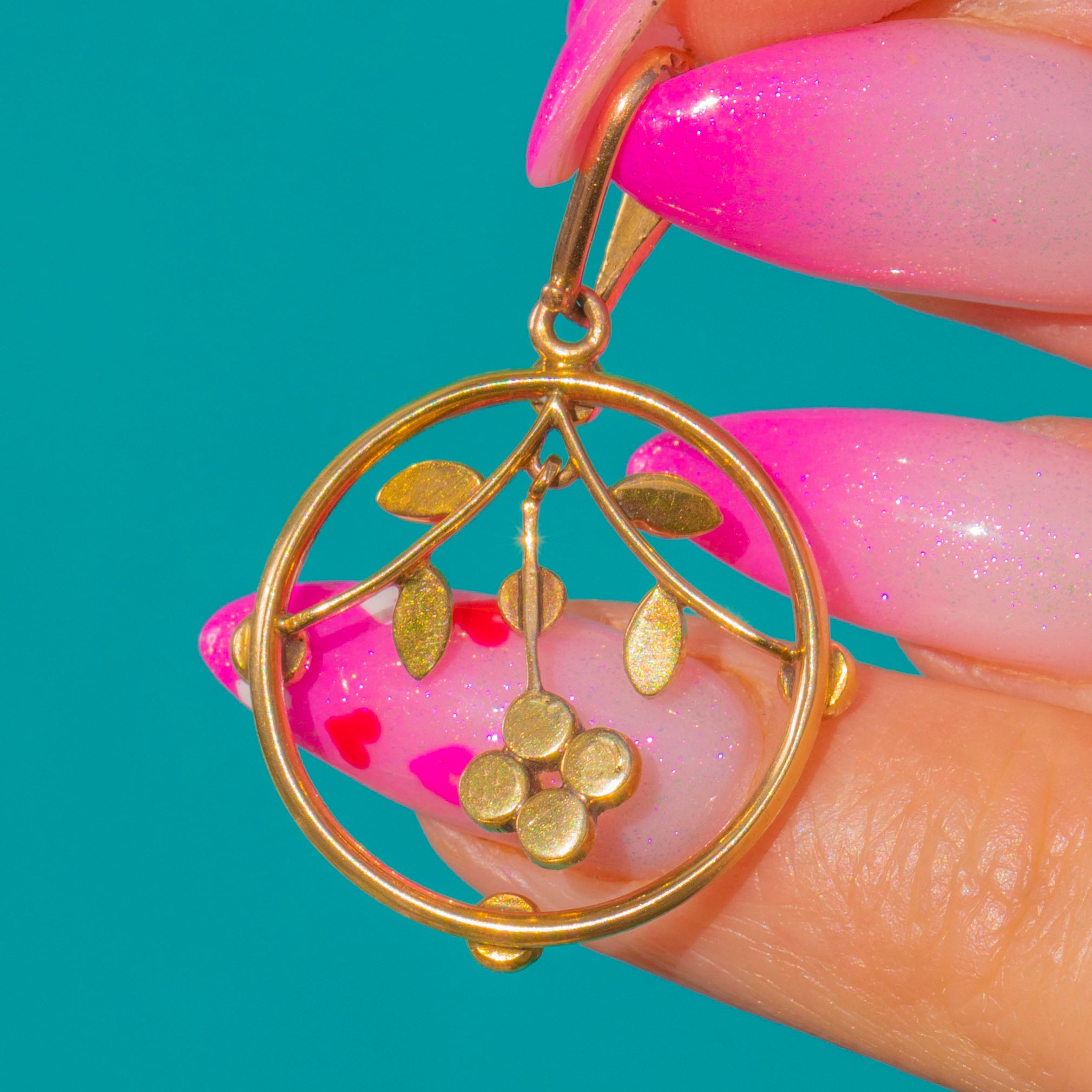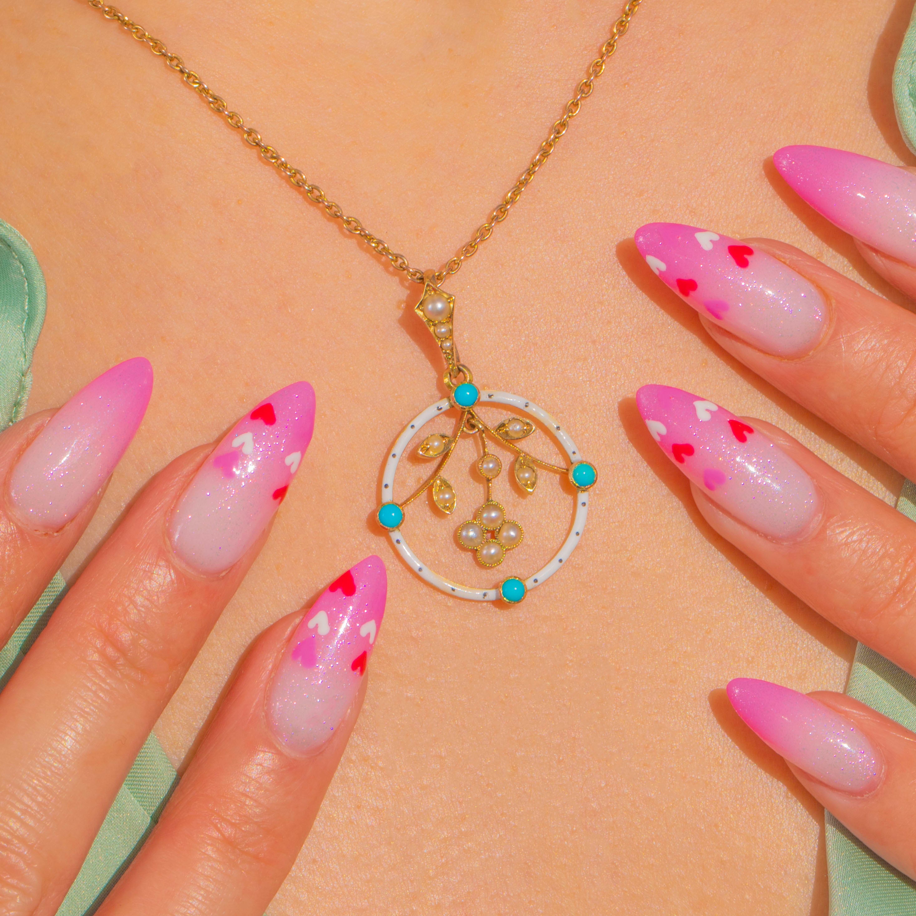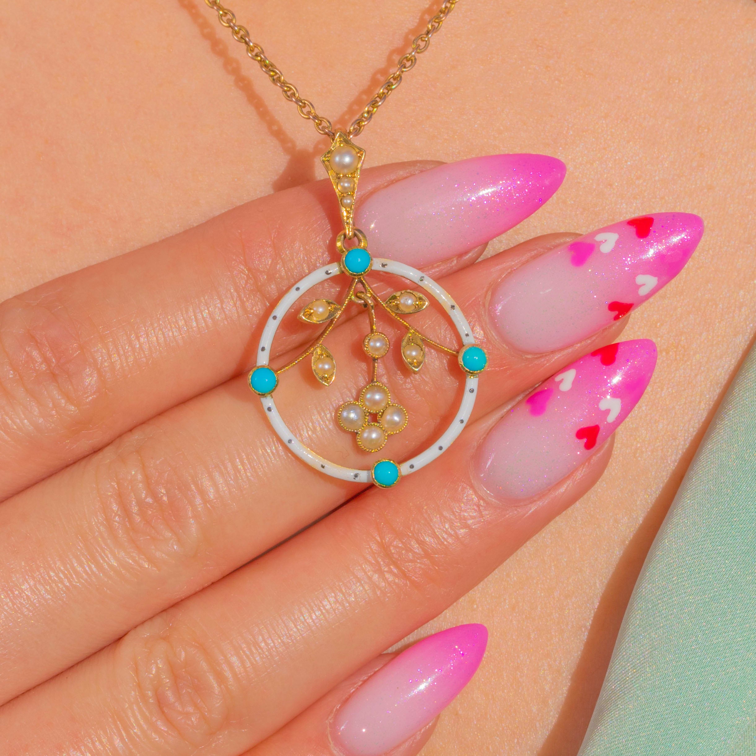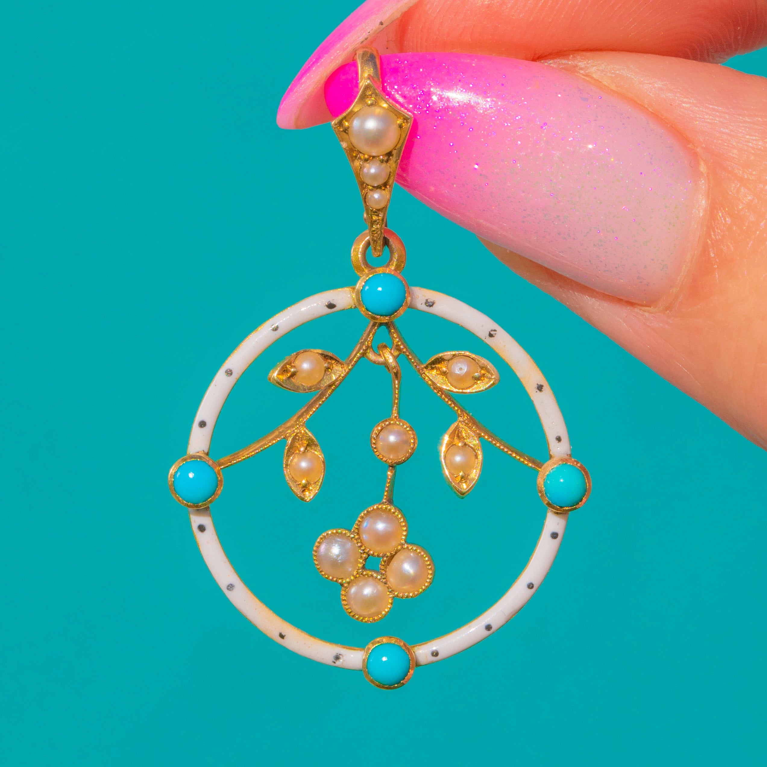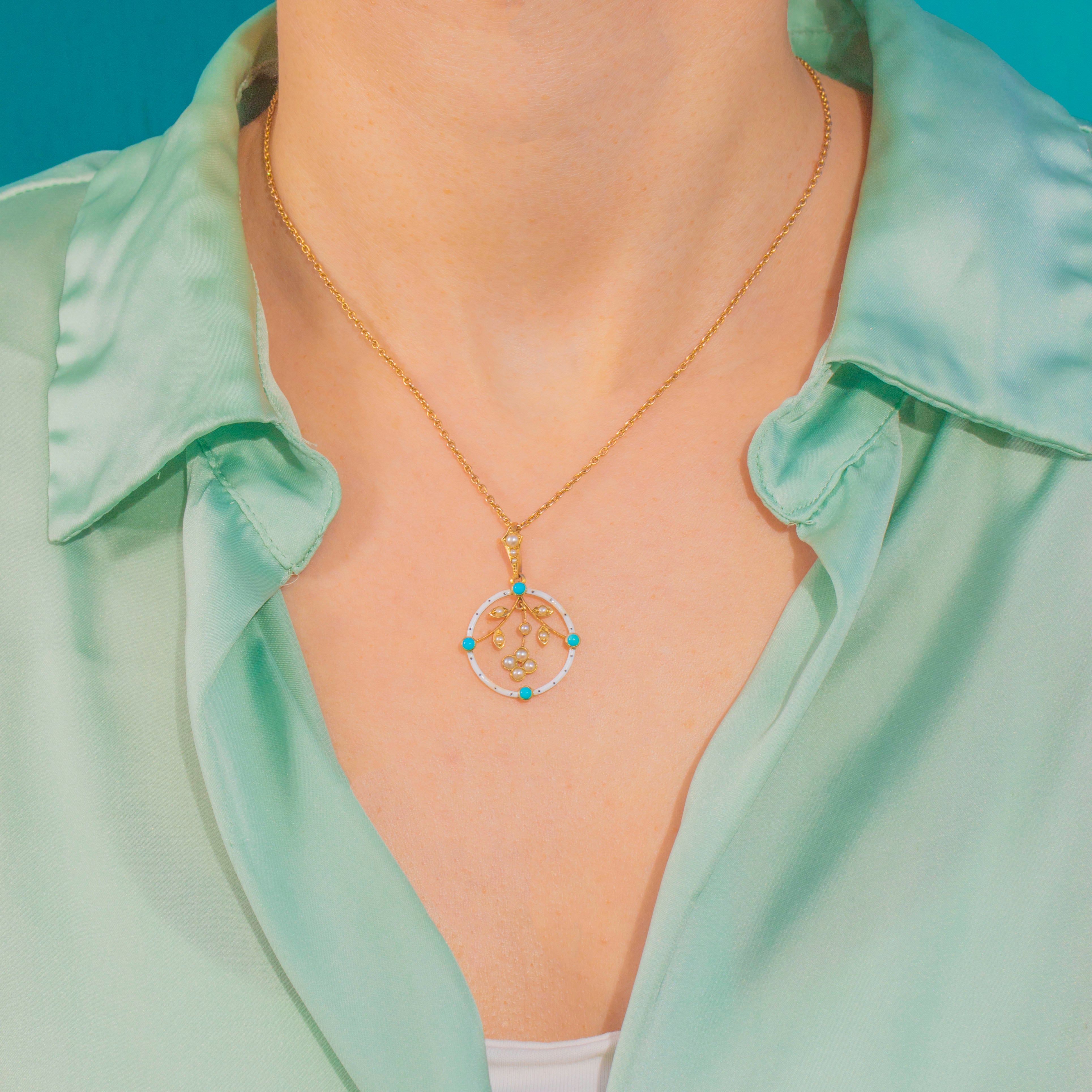 A delicate Victorian treasure, this openwork pendant marries crisp white Enamel with vivid Turquoise and luminous Seed Pearls in 15ct Gold. A circular Enamelled hoop is peppered with bright Turquoise cabochons, while a finely modelled foliate sprig suspends within, its tiny Pearls lending a soft, romantic glow. The airy silhouette, milgrain-style settings and botanical detailing capture the refined elegance of Victorian design.
