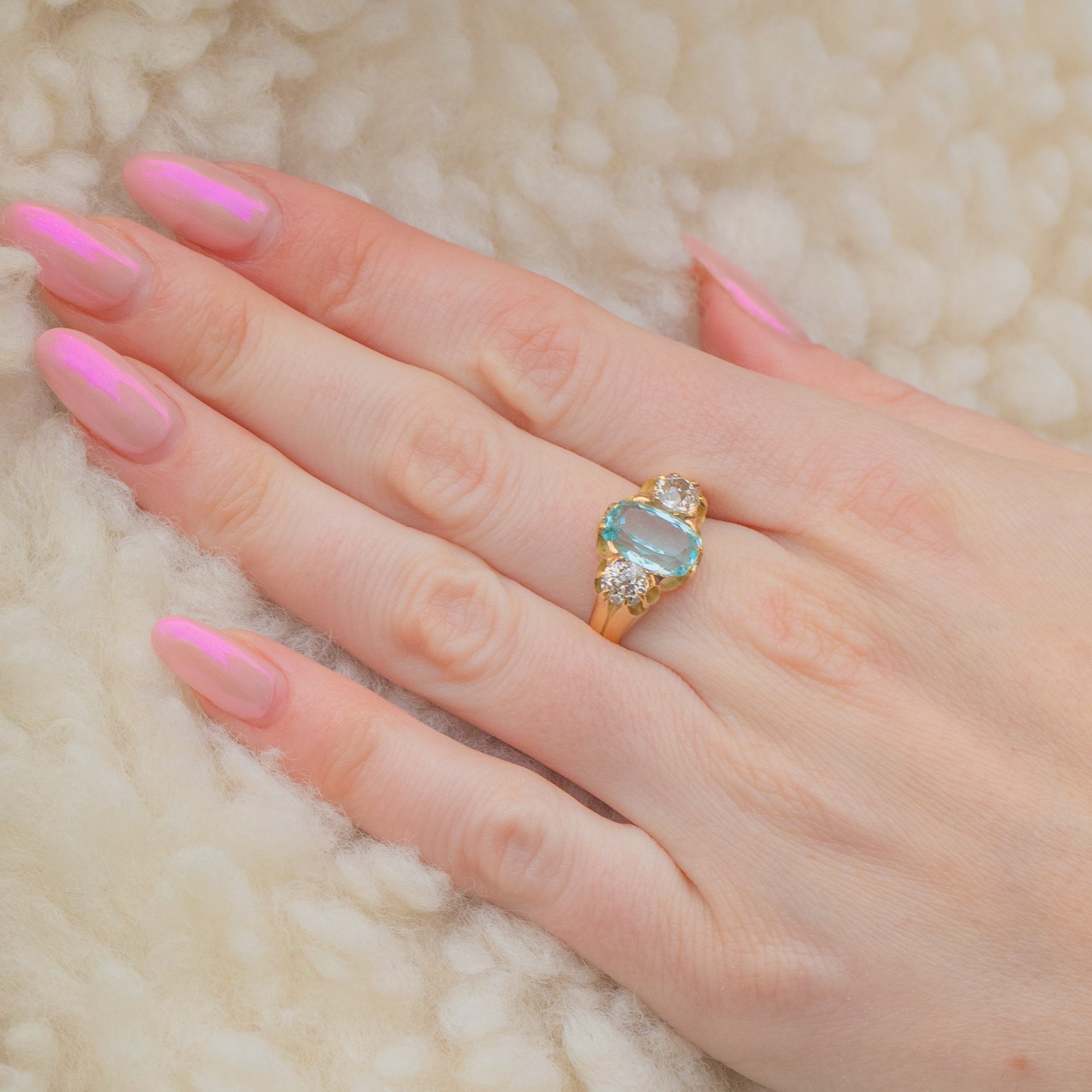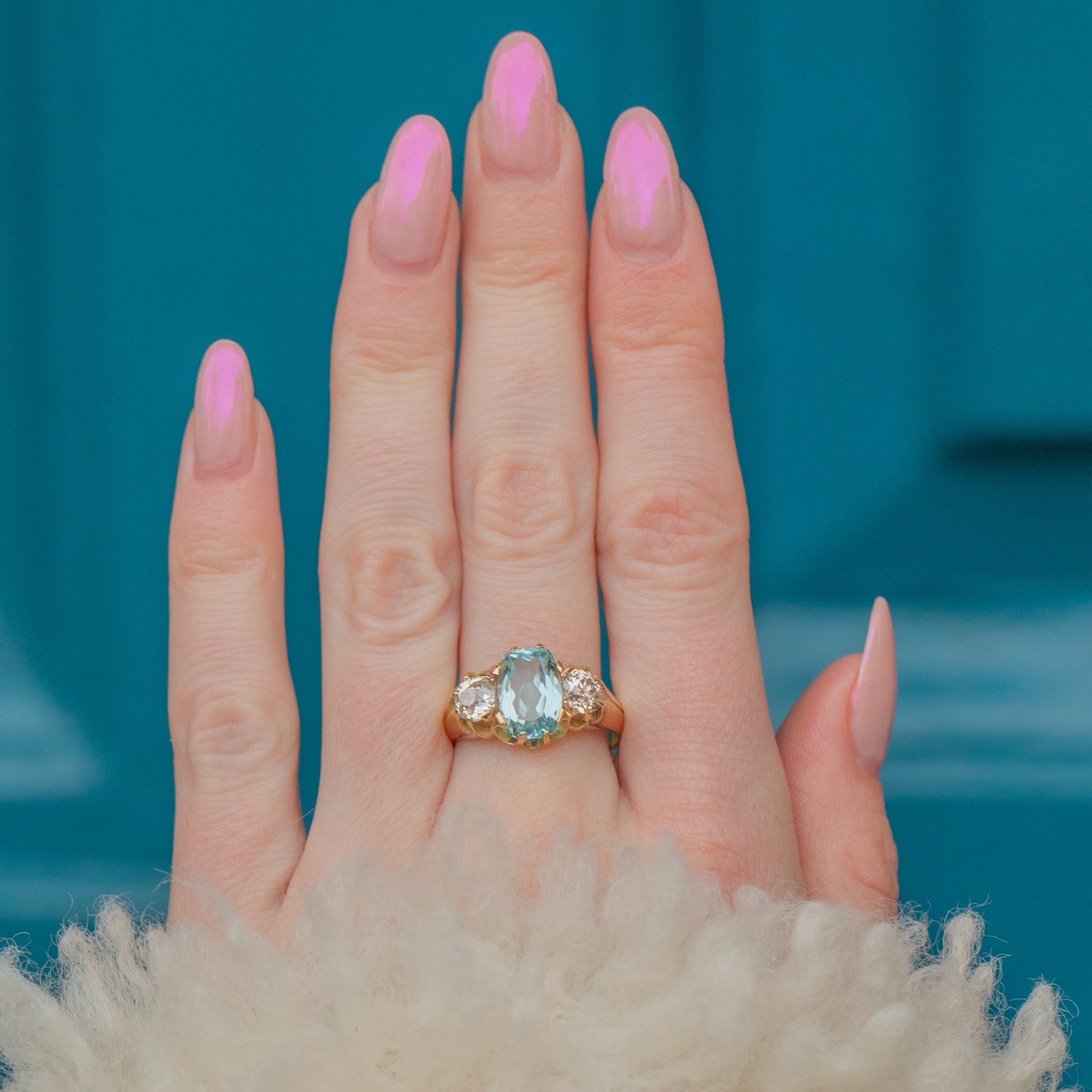 Simply stunning, her trio of gemstones glisten in the light, effortlessly complementing one another. Her central stone, a gleaming faceted Aquamarine, radiates gorgeous calming pastel blue hues. She is adorned by two crisp twinkling Diamonds either side, boasting 1.00ct combined. Each Diamond has a wonderful colour (graded as I-J) and sparkle beautifully.