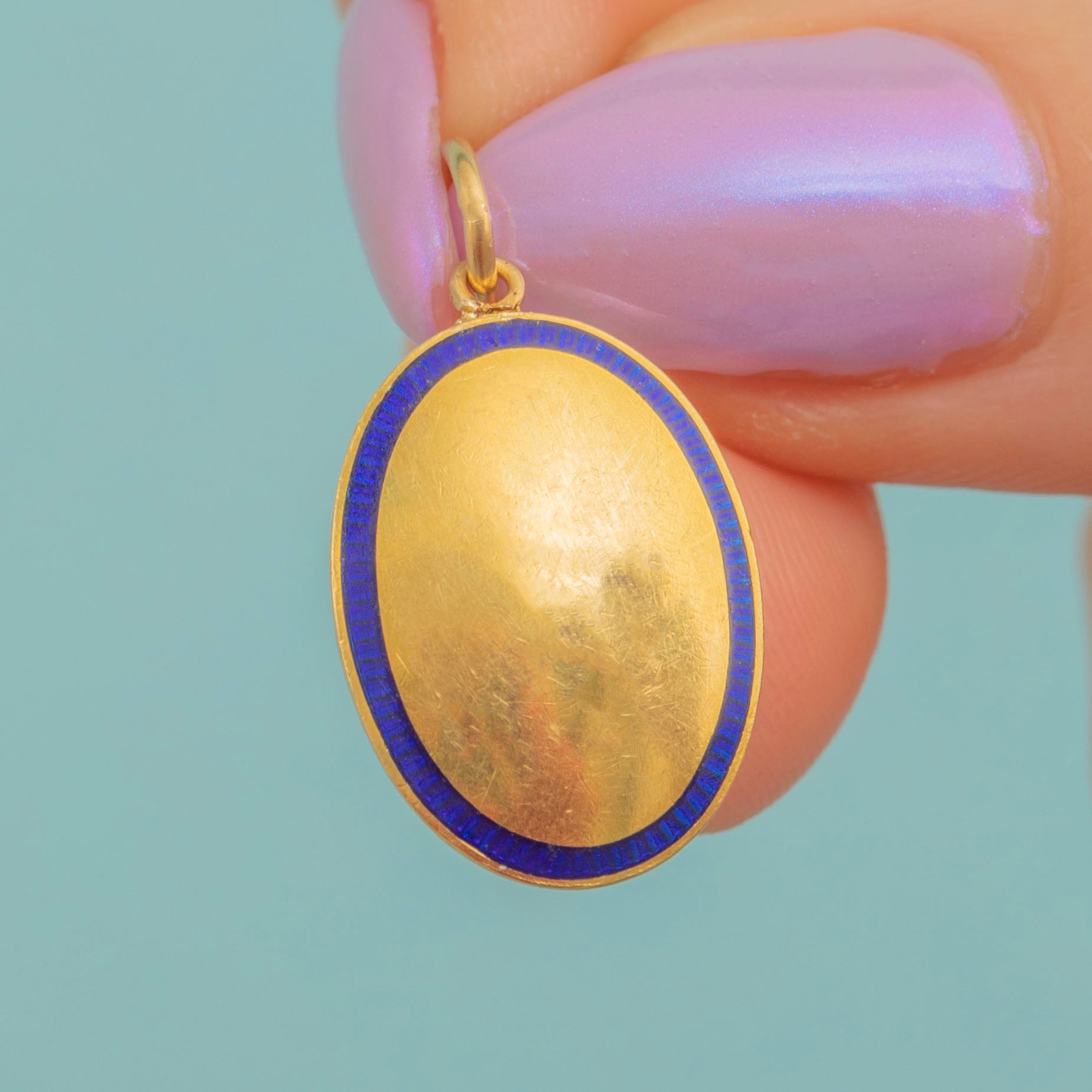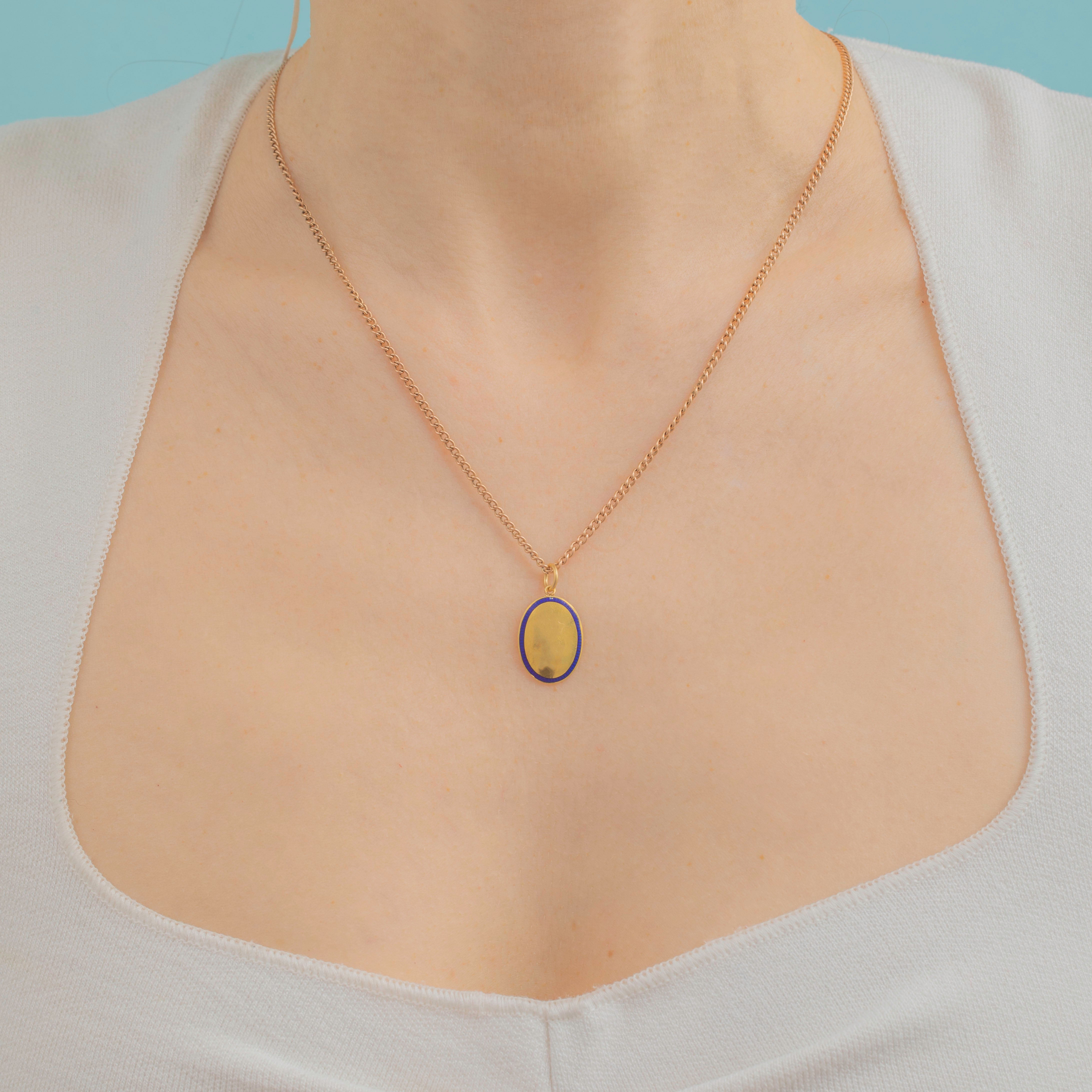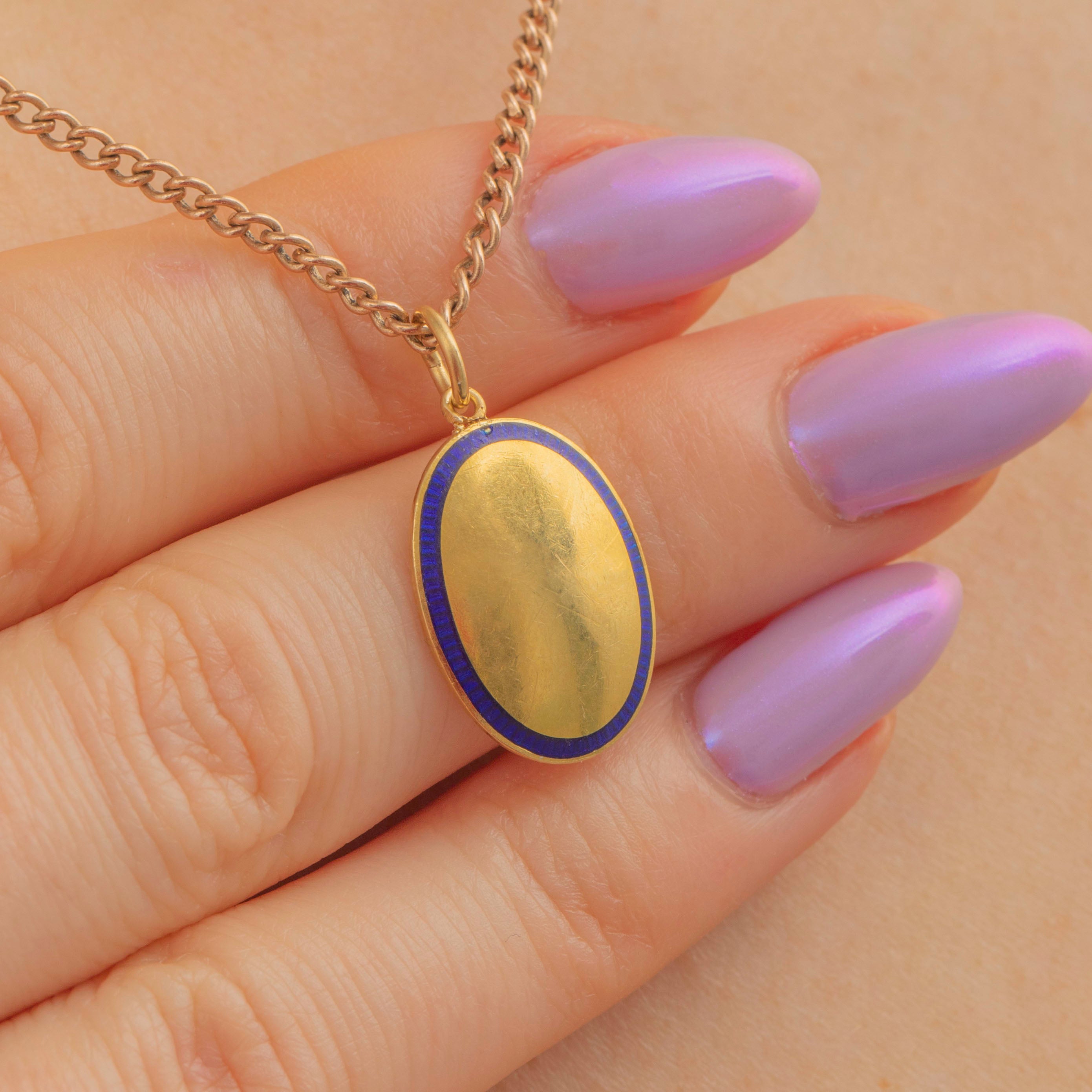 This antique 18ct Gold Blue Enamel oval pendant will suspend elegantly from a skinny Gold chain! The smooth oval form is crafted from brightly saturated 18ct Gold and has wonderful reflective qualities as its domed surface catches the light.