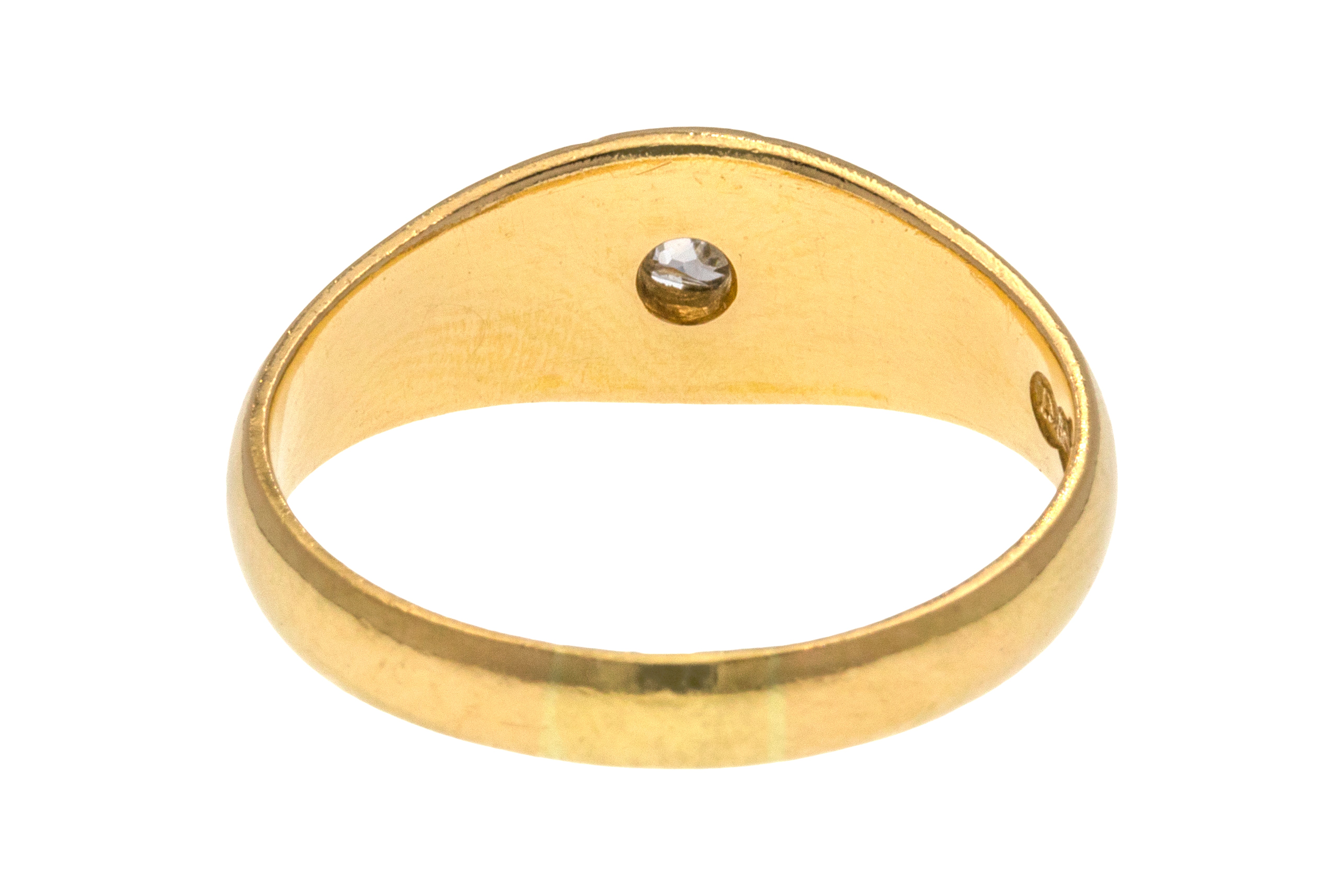 VERY GOOD-EXCELLENT. This antique 18ct Gold Diamond "gypsy" ring is in wonderful condition throughout. Her Diamond is securely set and sparkles to perfection, the star settings remaining crisp and clear. The grooved engravings are also beautiful, and there is only the odd very small scratch to the band to note, commensurate with age.