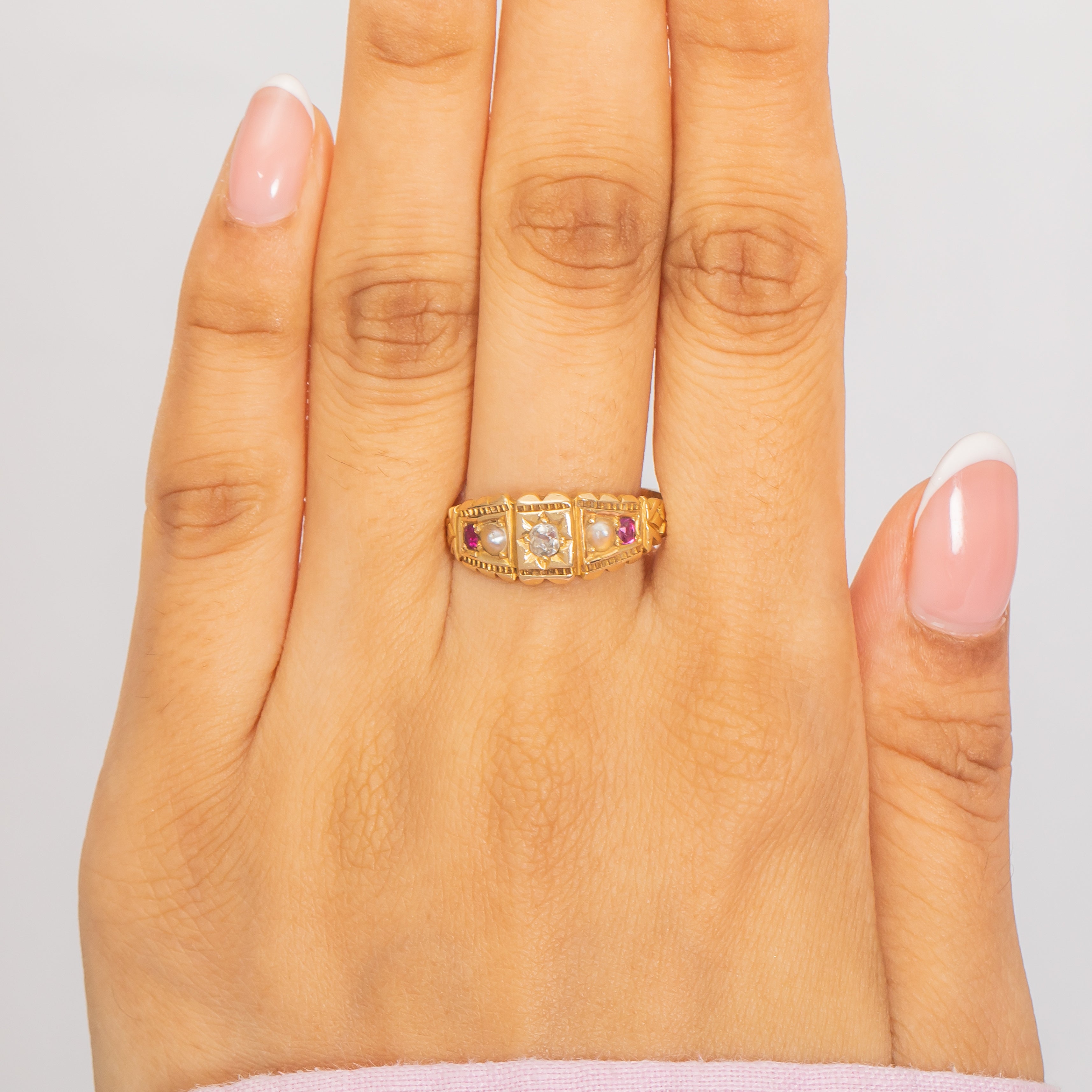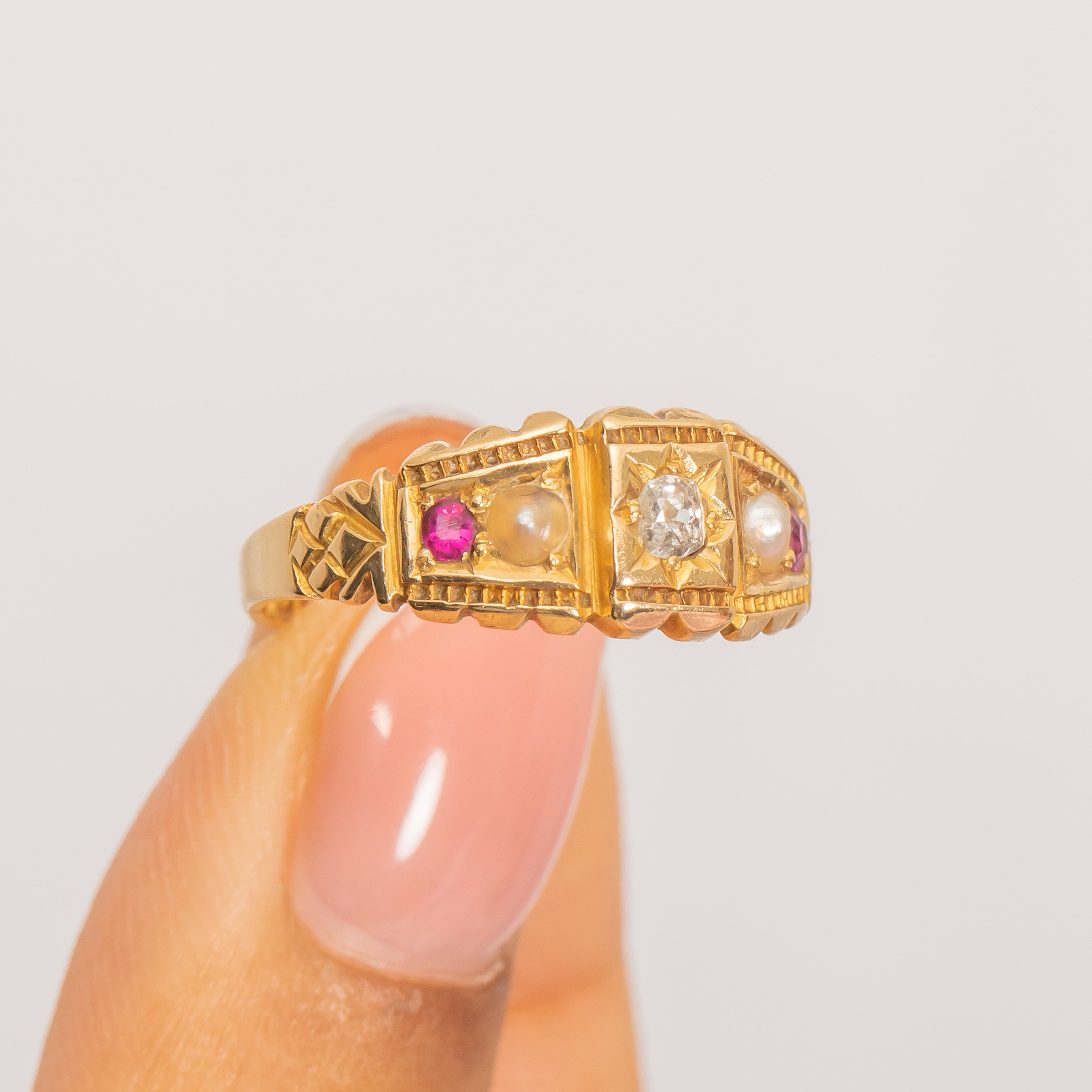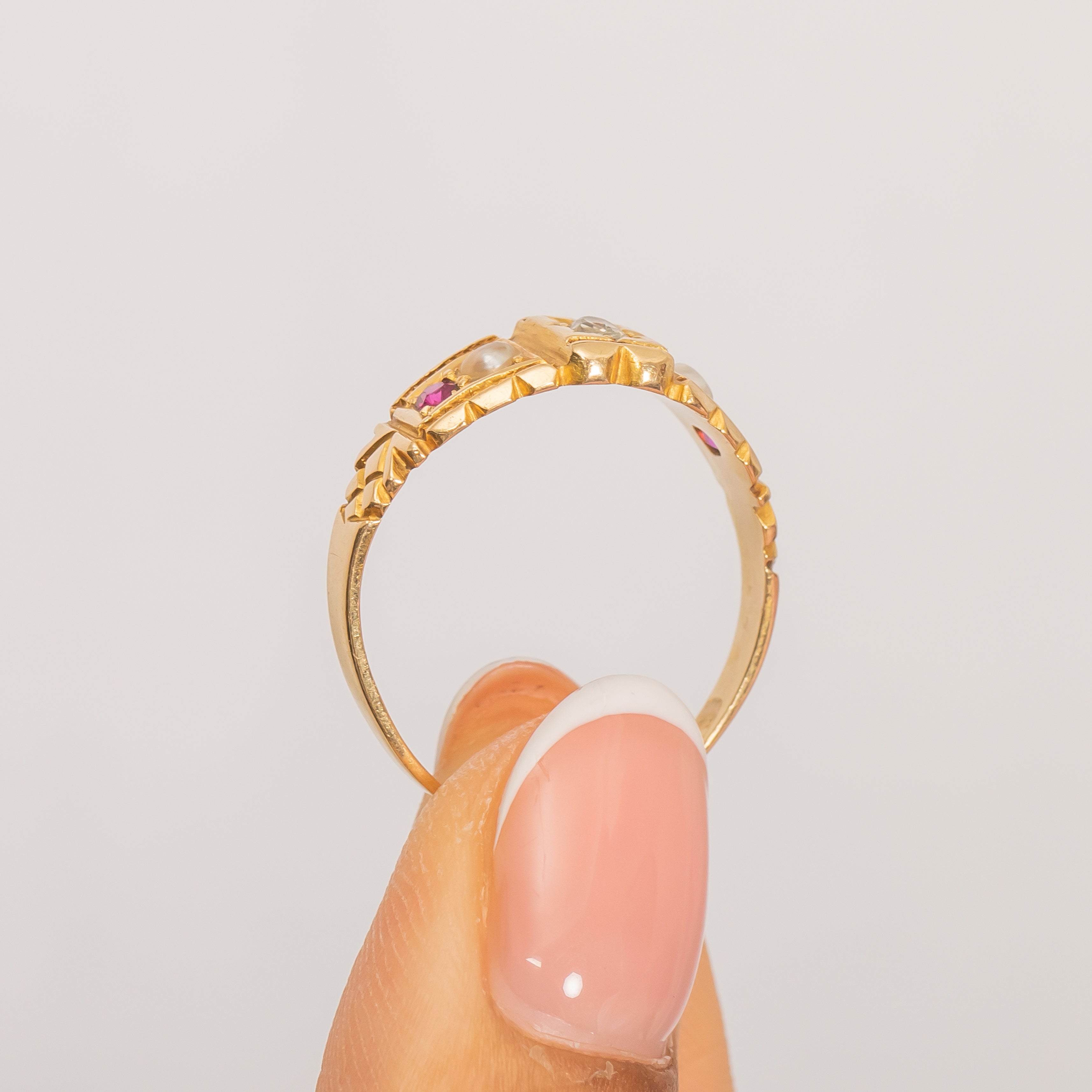 Add some Victorian charm to your ring stack with this delightful antique 18ct Gold Diamond Ruby gypsy ring! The ornately formed Gold band displays a delectable row of gemstones, with a twinkling Diamond taking centre stage flanked by plump Pearls and fuchsia hued Rubies.