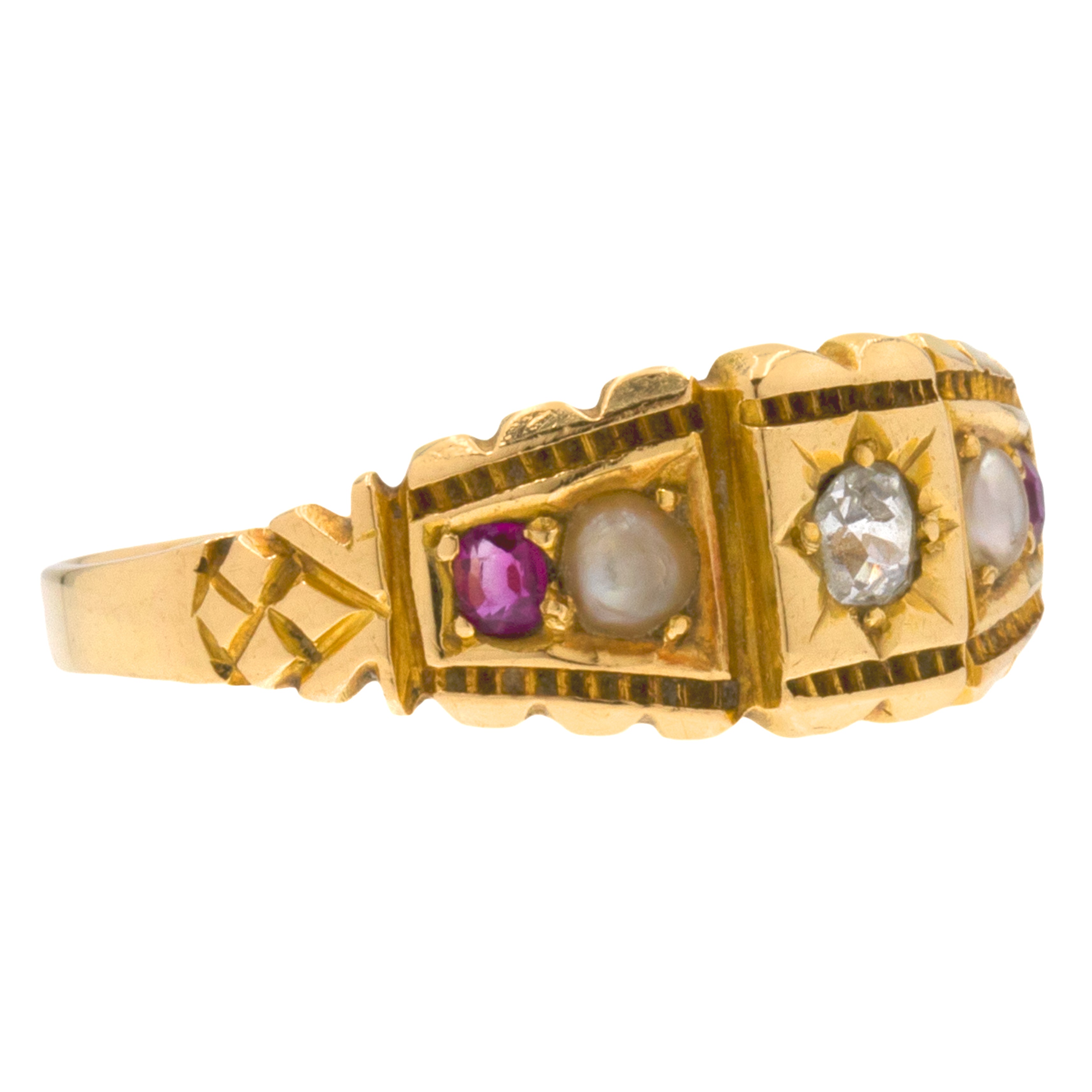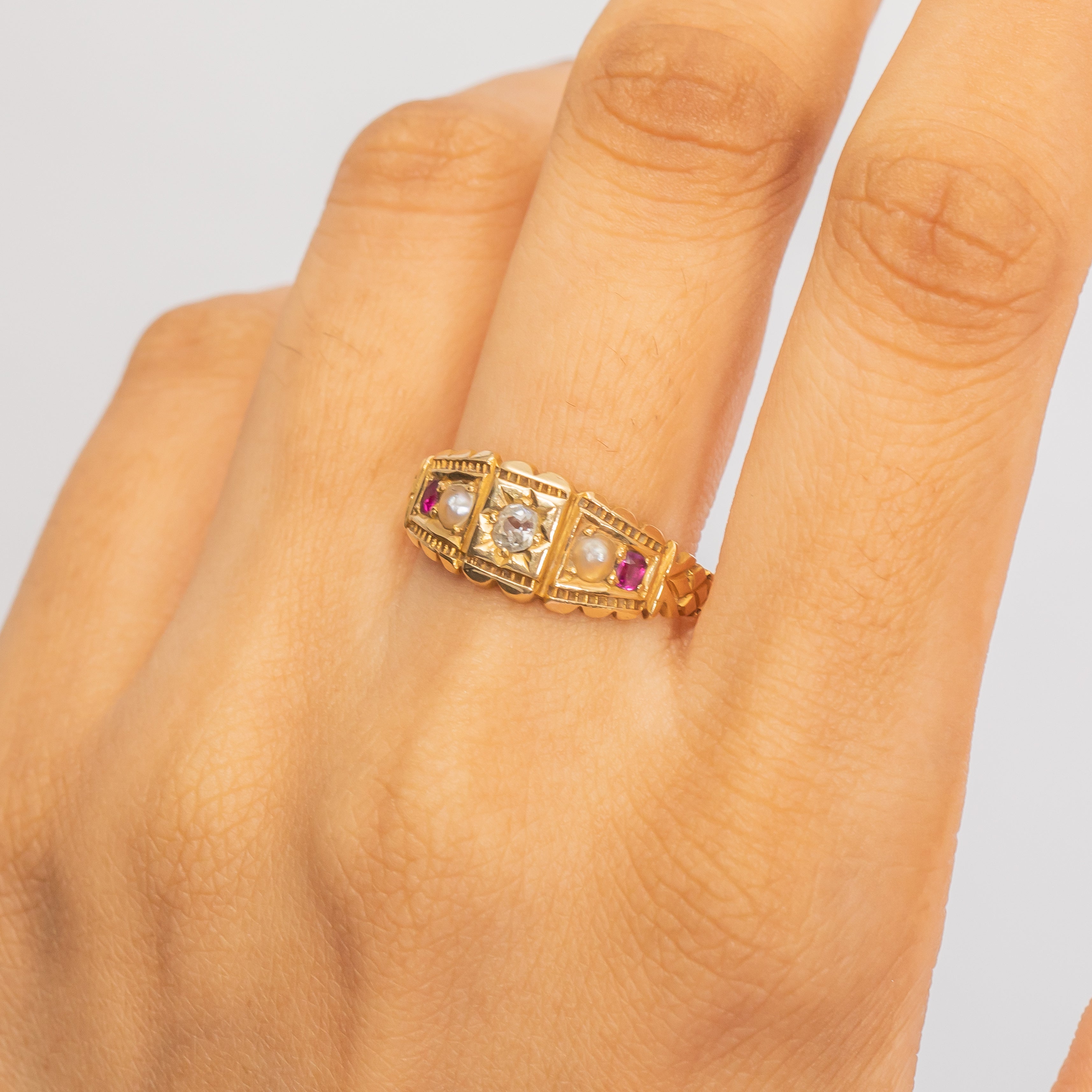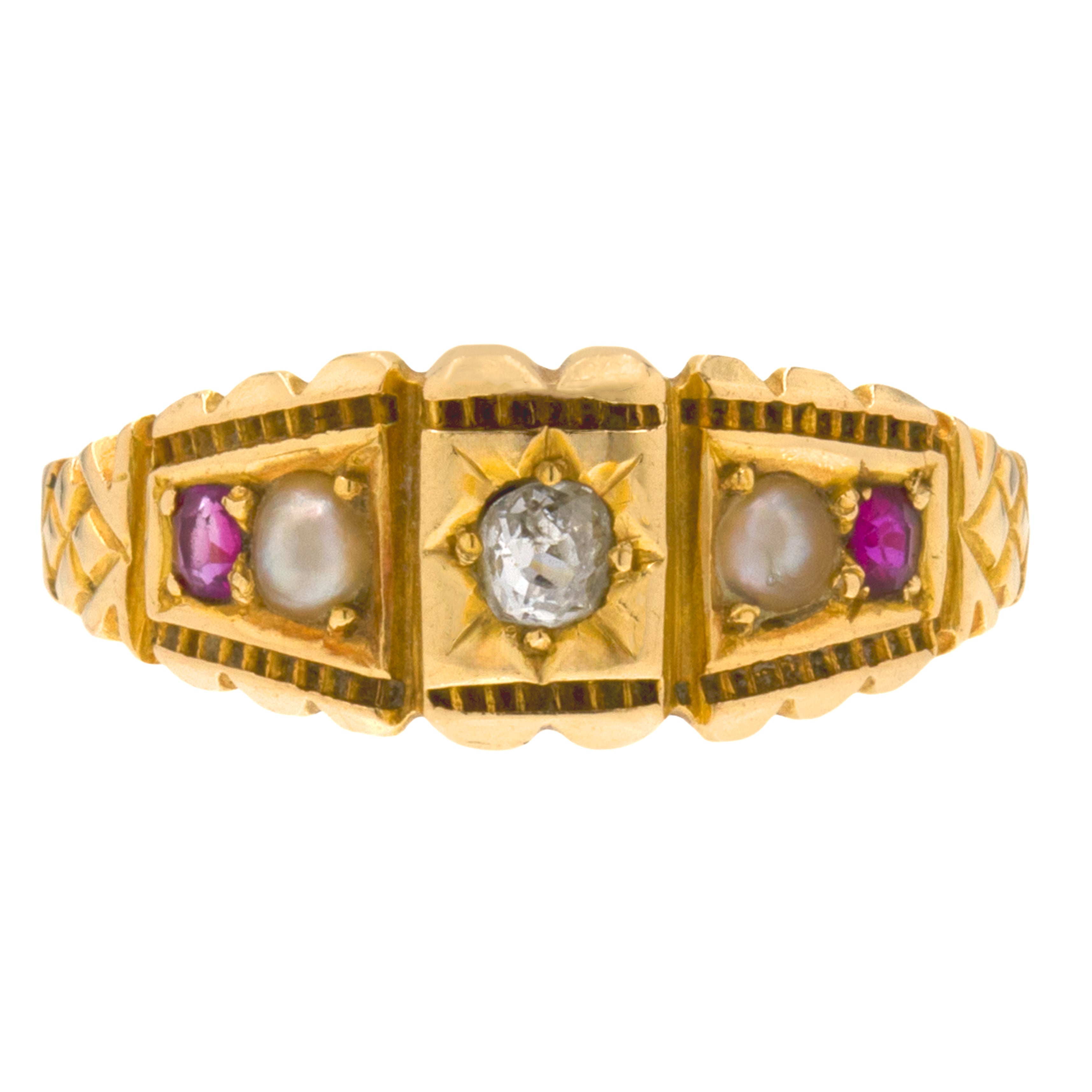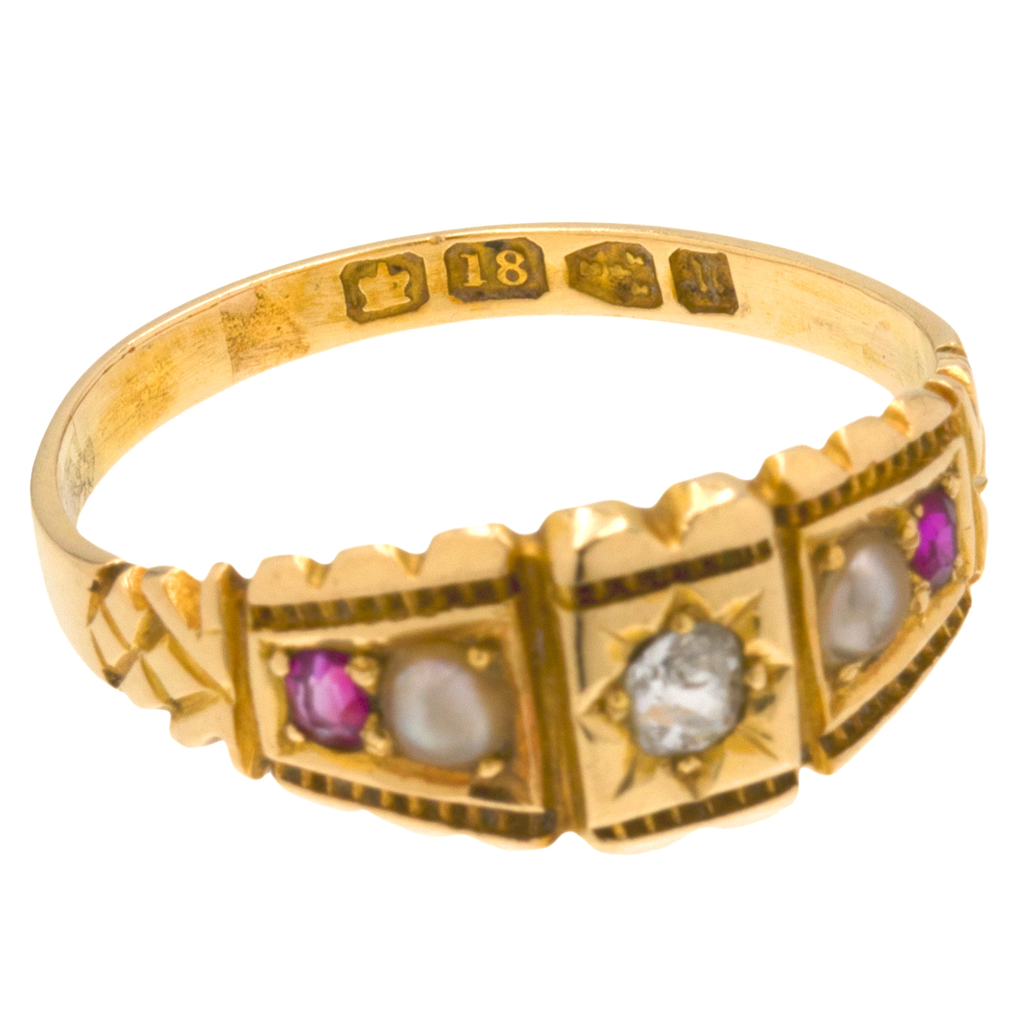 Add some Victorian charm to your ring stack with this delightful antique 18ct Gold Diamond Ruby gypsy ring! The ornately formed Gold band displays a delectable row of gemstones, with a twinkling Diamond taking centre stage flanked by plump Pearls and fuchsia hued Rubies.