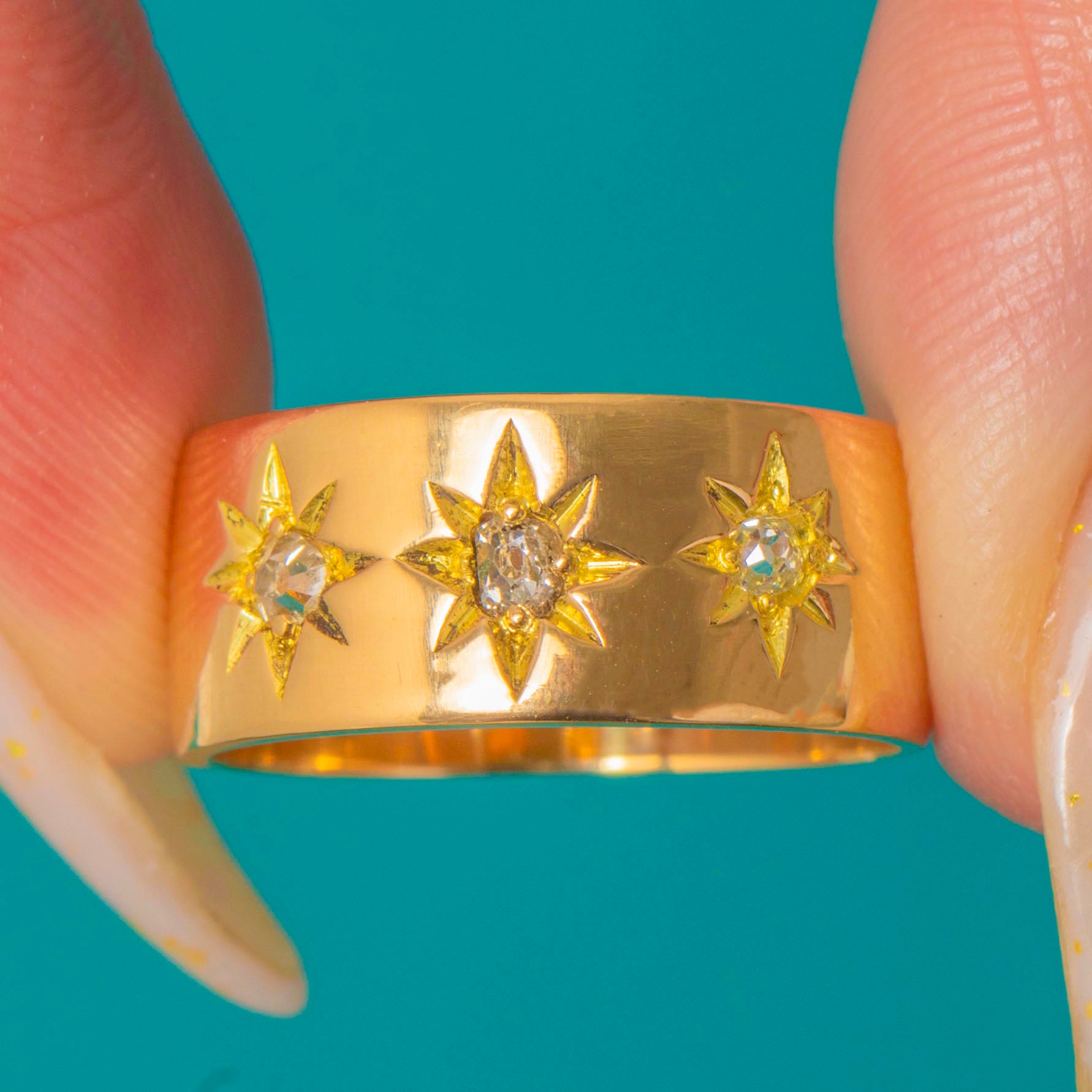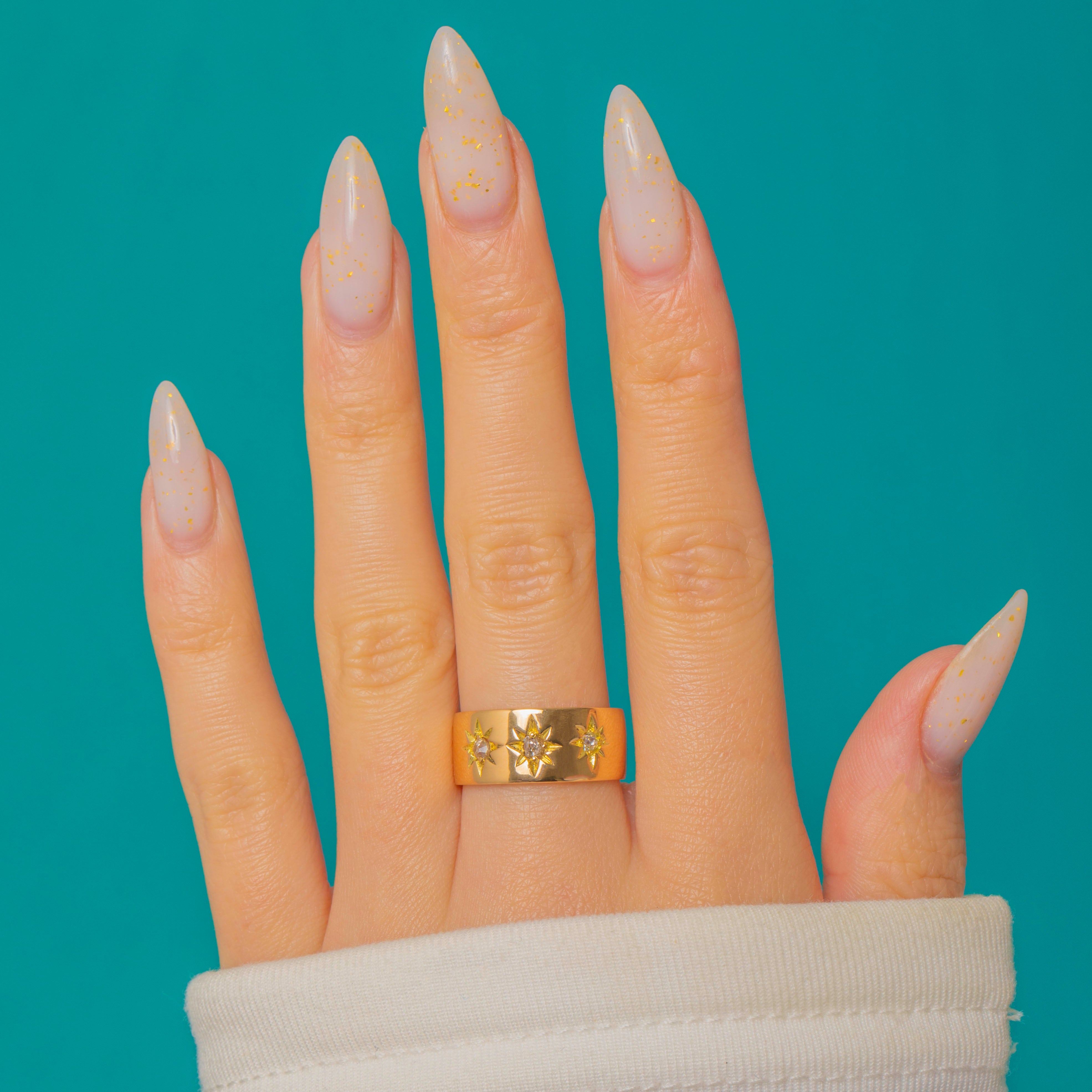 A quintessential Victorian treasure, this 18ct Gold three-stone gypsy ring is star-set with Old Mine-Cut Diamonds that glitter with a soft, celestial twinkle. The flush, starburst settings lend a sleek, low-profile silhouette, while the rich 18ct Gold brings luxurious warmth to the hand.