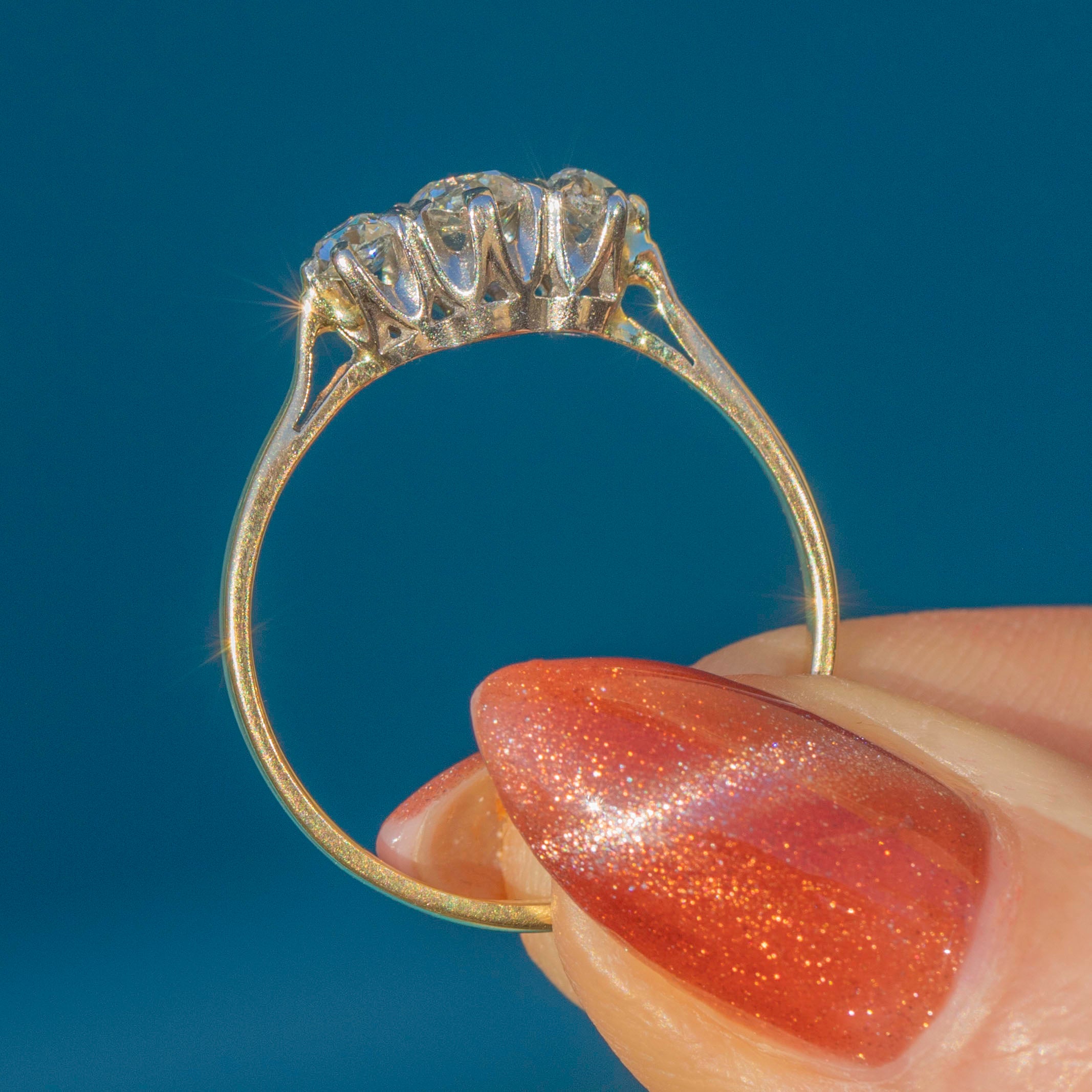 VERY GOOD-EXCELLENT. This antique 18ct Gold Diamond trilogy ring is in wonderful condition. Each Diamond is set securely and has a dazzling brilliance as they catch the light. There are some small fleabites to the Diamonds, however, this is commensurate with age and difficult to spot without a jeweller's loupe. In great condition, she is a must-have!