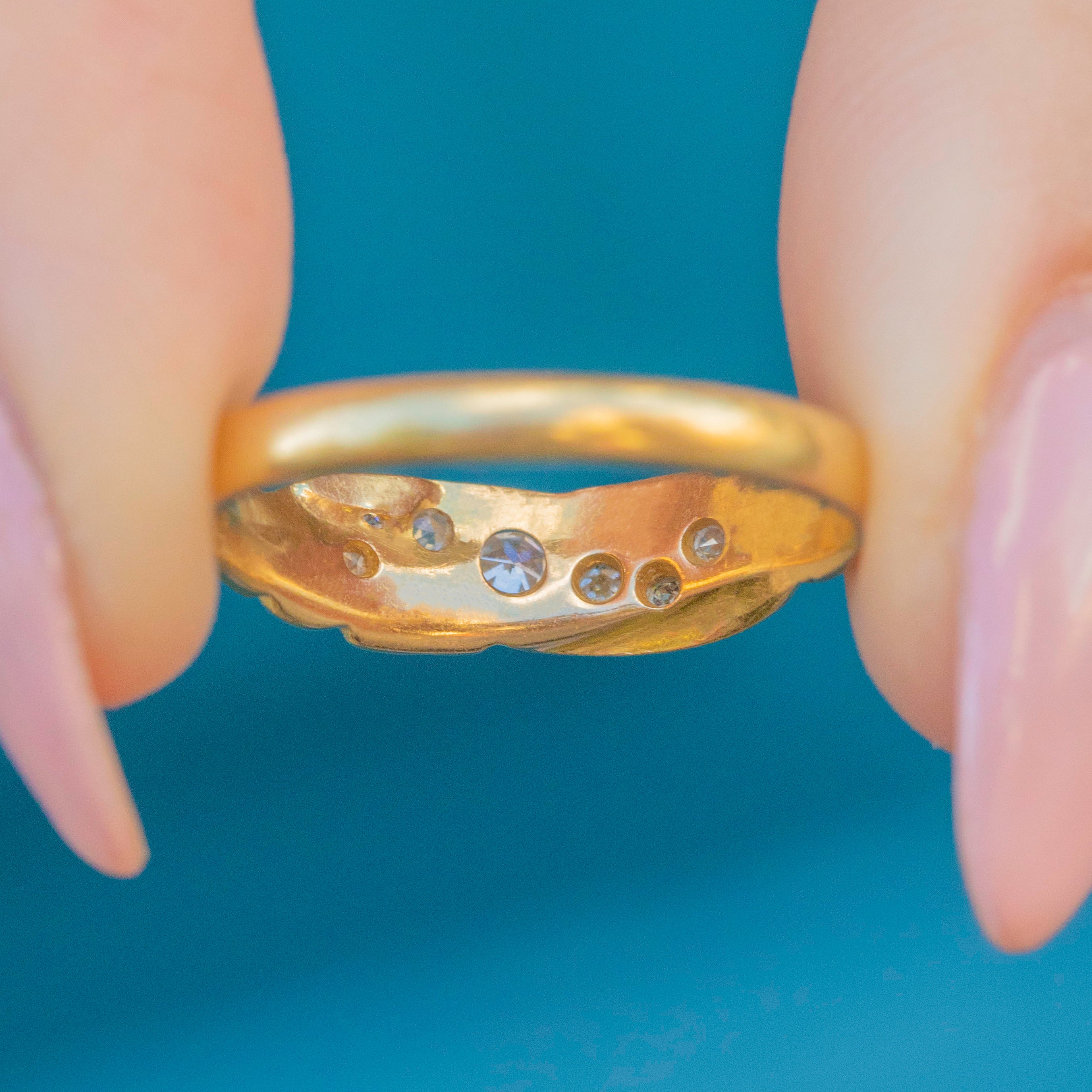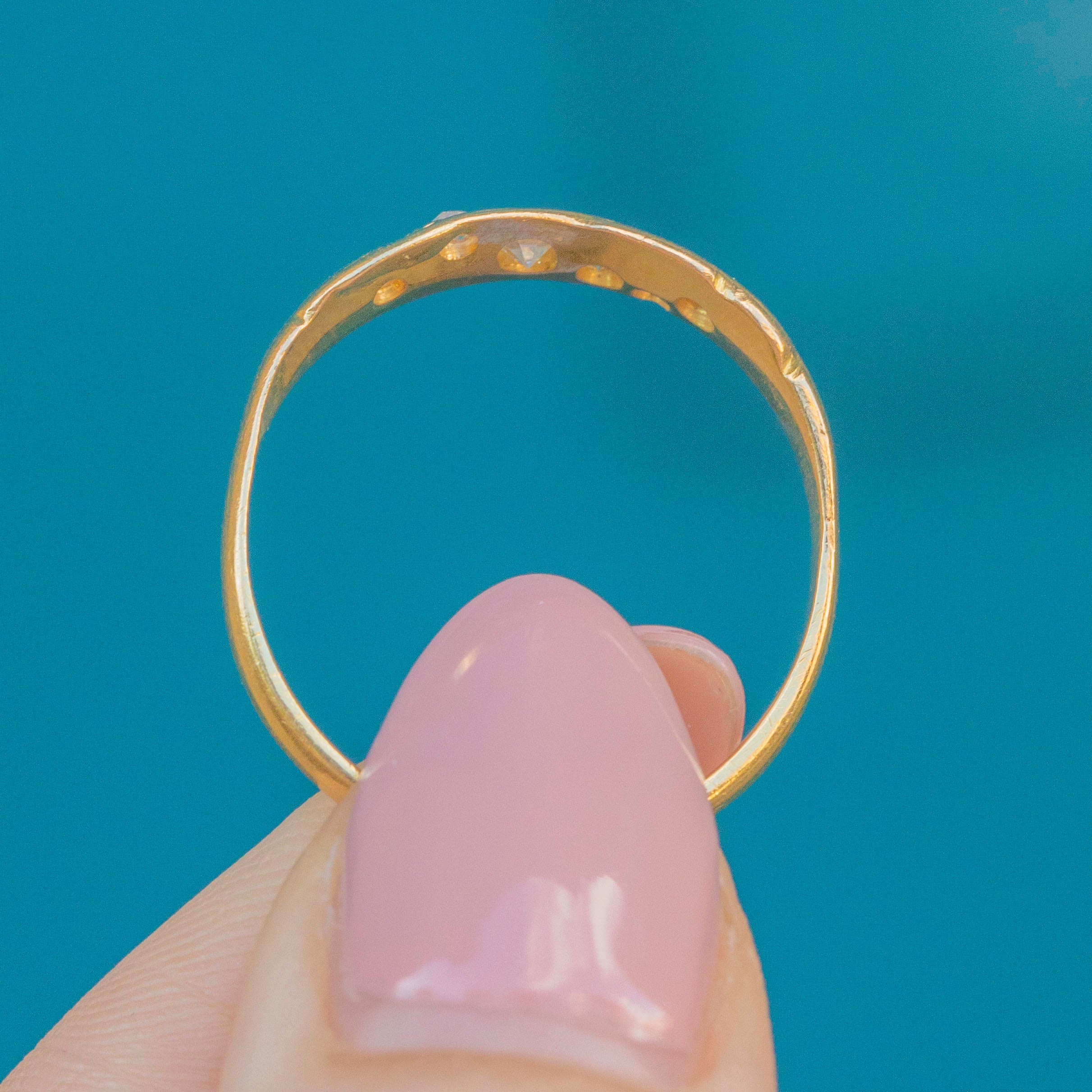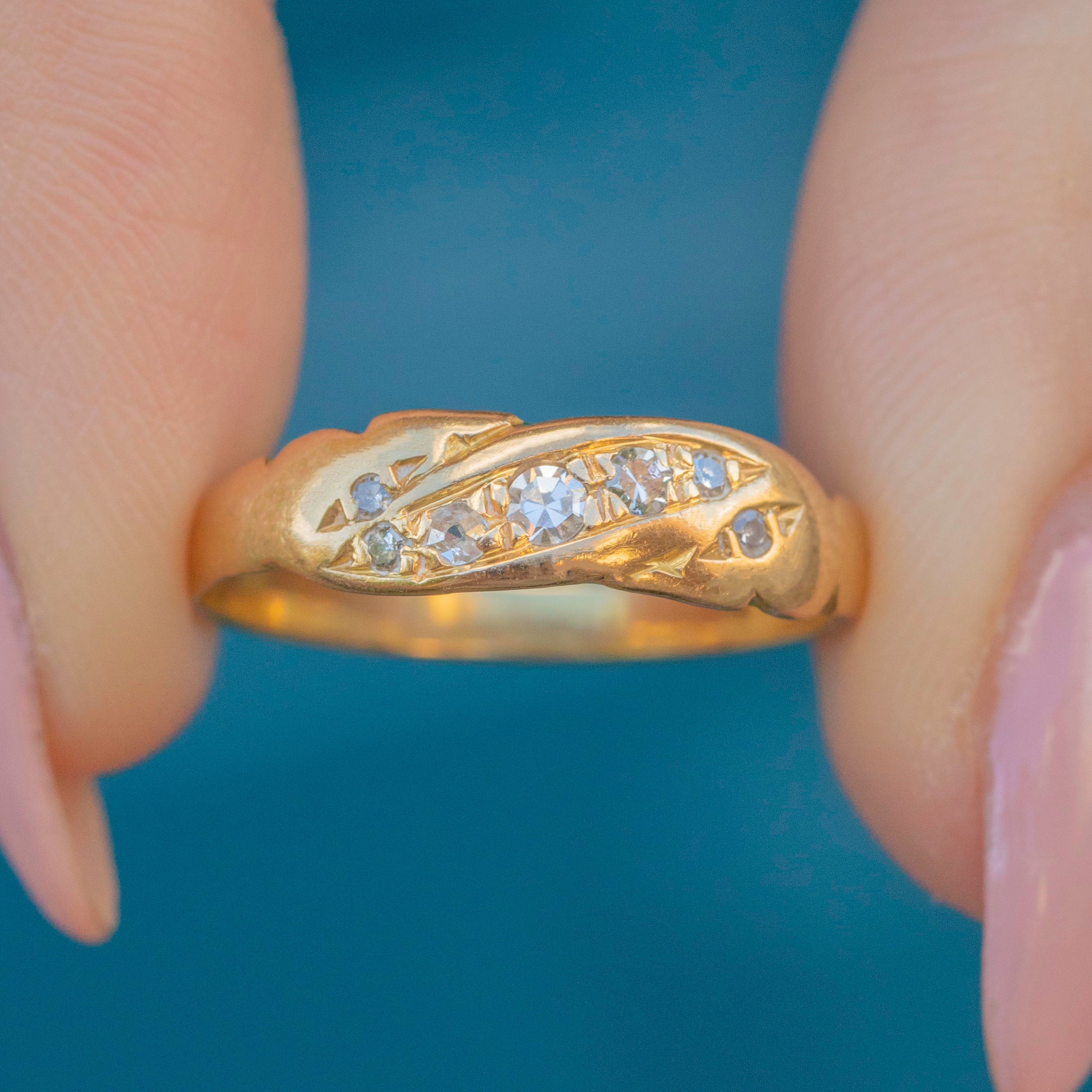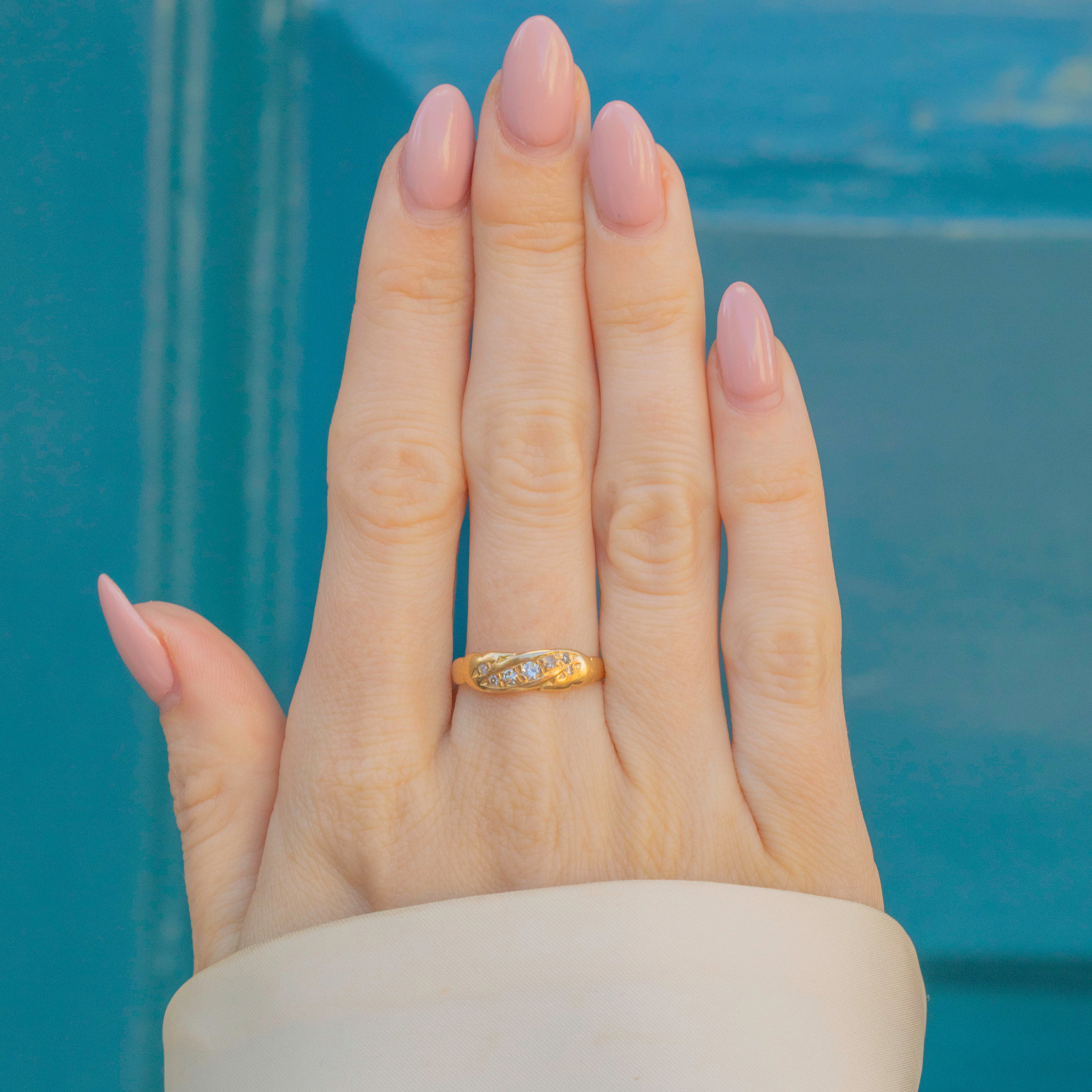 EXCELLENT. This lovely antique 18ct Gold Diamond twist ring is in perfect condition throughout. The Diamonds are clean and bright and set securely in tidy settings. The Gold is buttery and the band is smooth, feeling comfortable and robust.