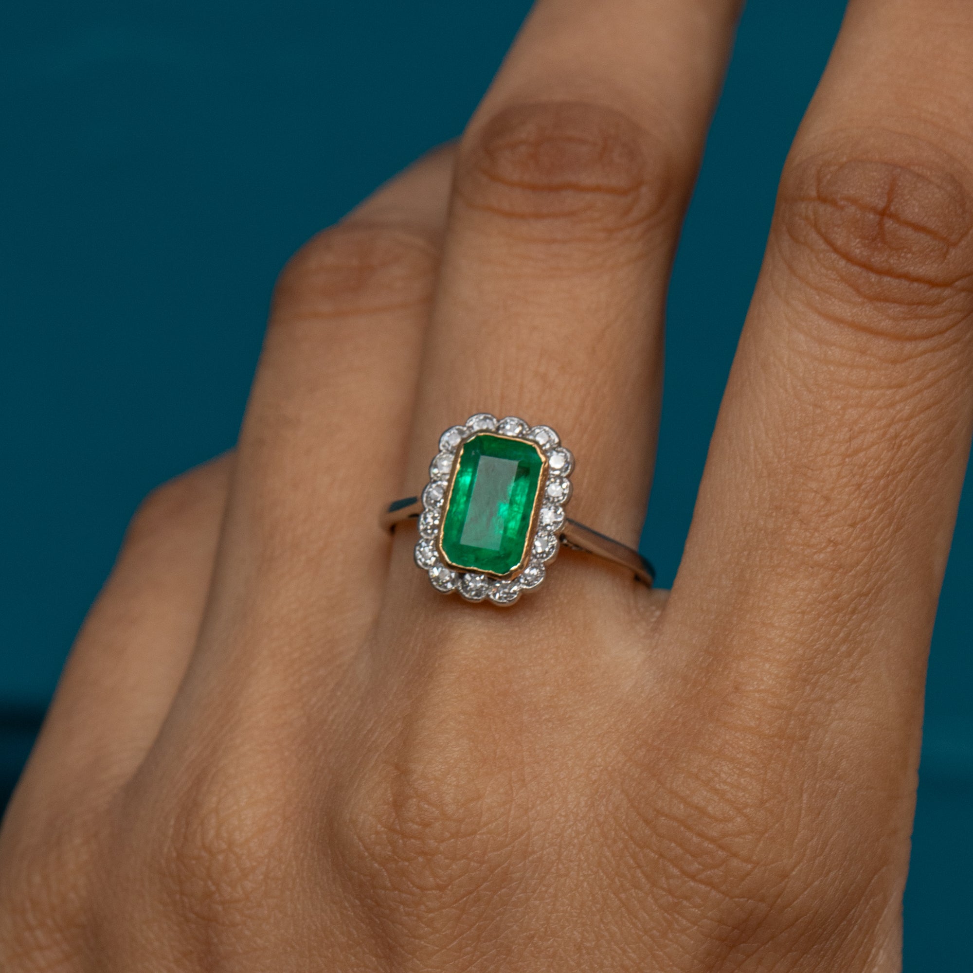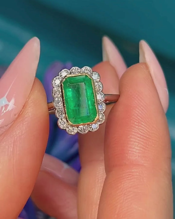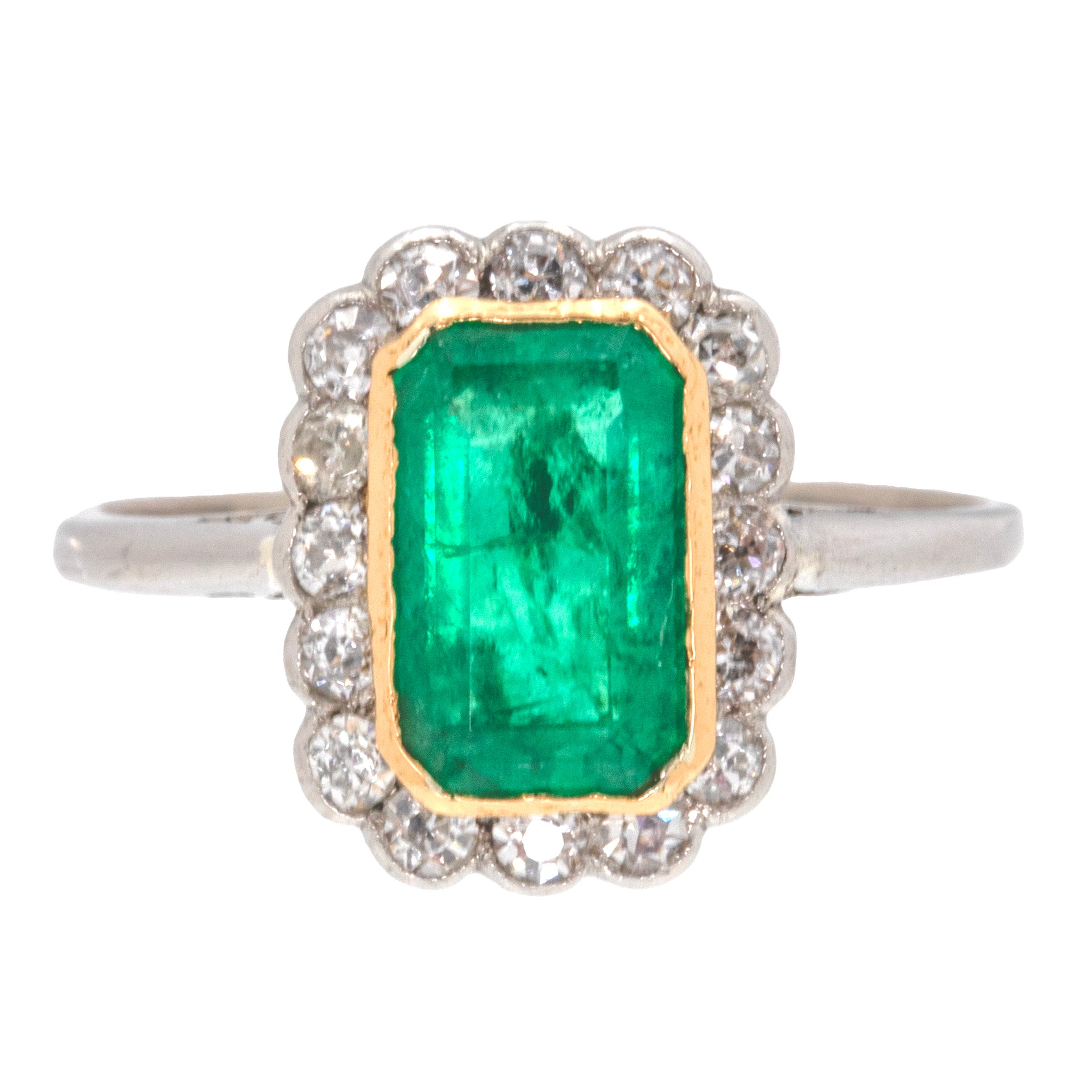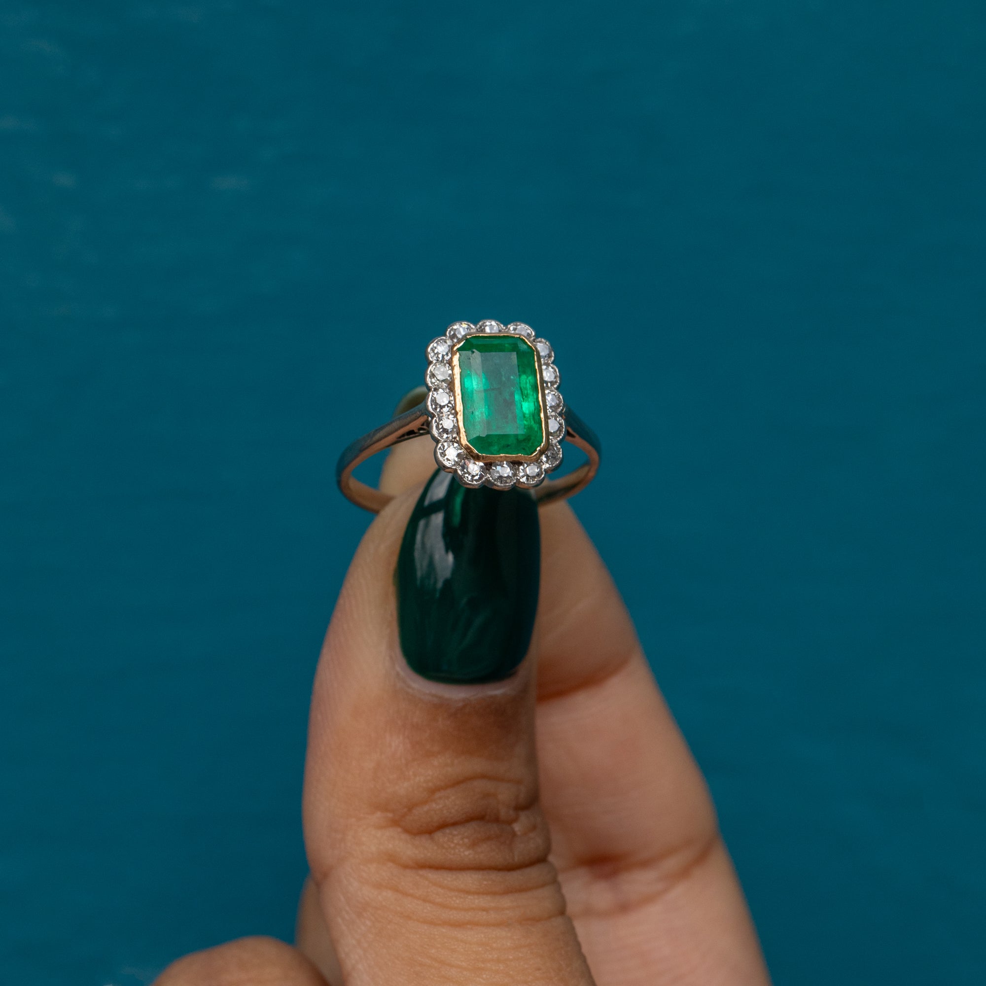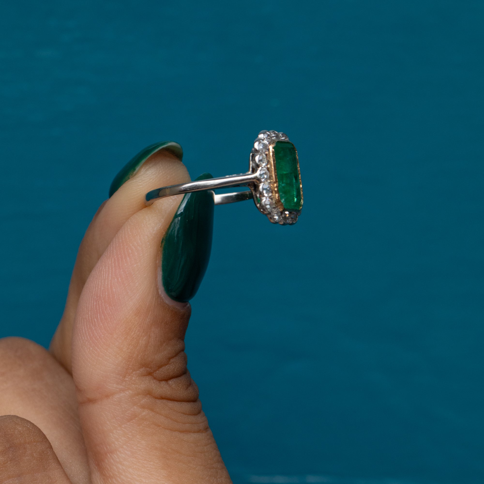 Antique 18ct Gold Emerald Diamond Cluster Ring, 1.16ct Natural Emerald