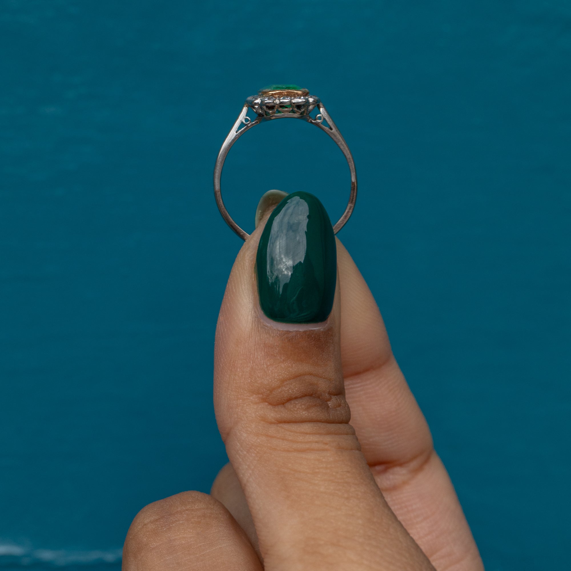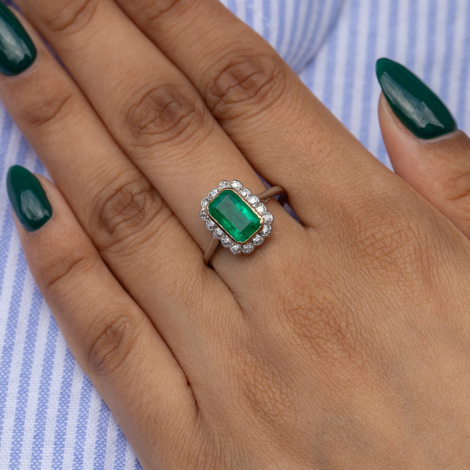 EXCELLENT. This antique 18ct Gold Emerald Diamond cluster ring is in mint condition, we simply cannot fault her! Each gemstone is securely nestled within its setting and retains a brilliant vibrance. The White and Yellow Gold are glossy and bright and free from any dings, dents, scratches or signs of resizing! She is a gorgeous piece for you to cherish for many years to come.