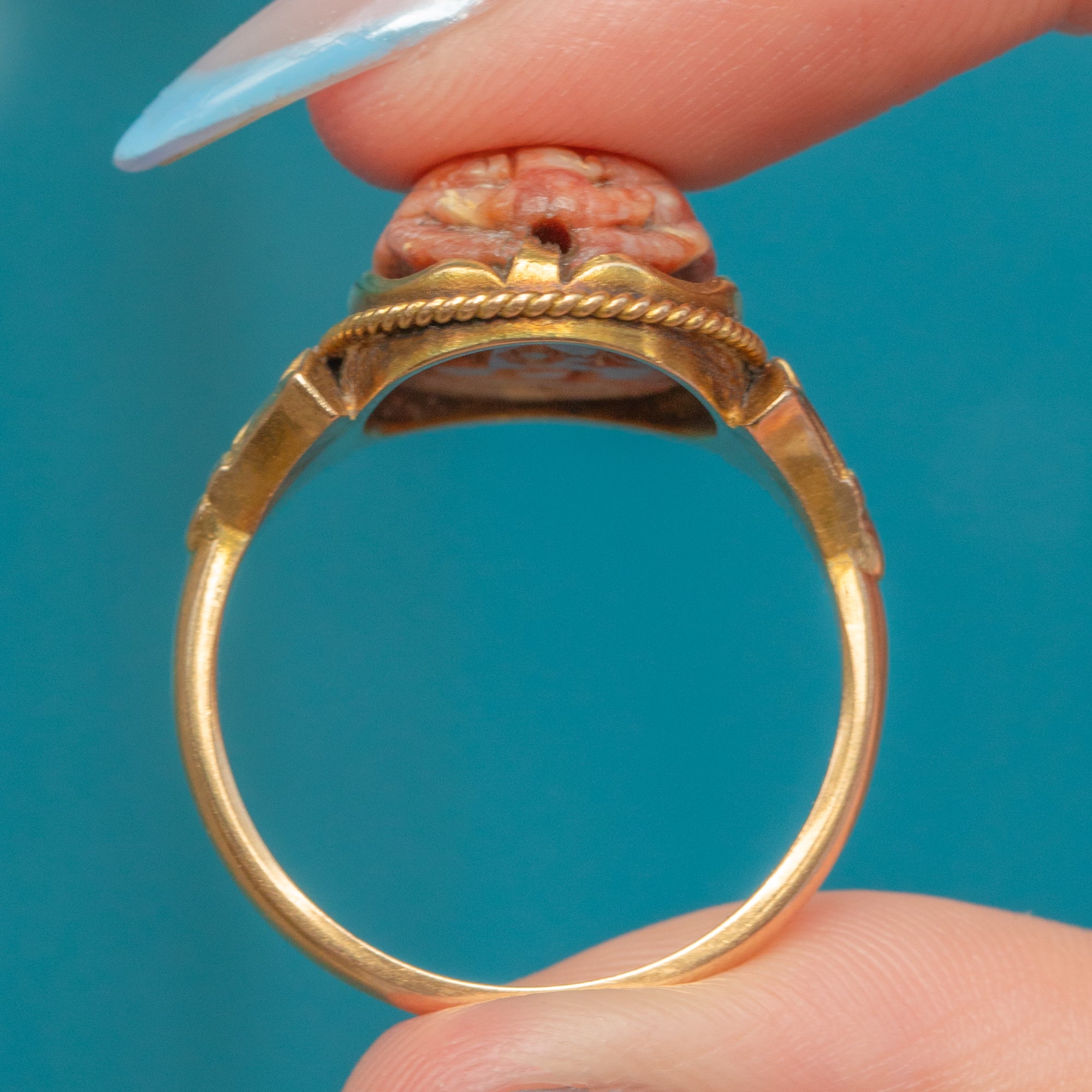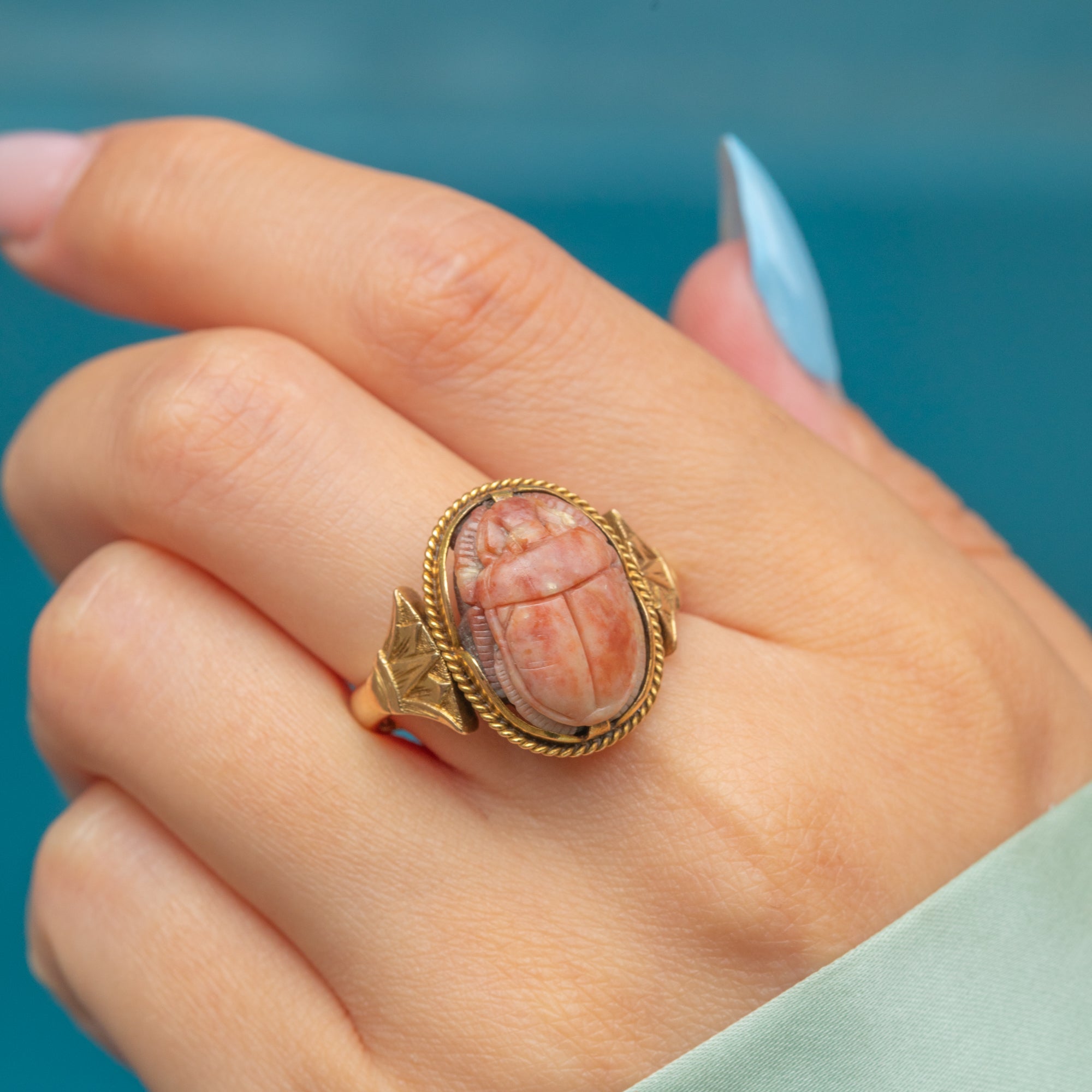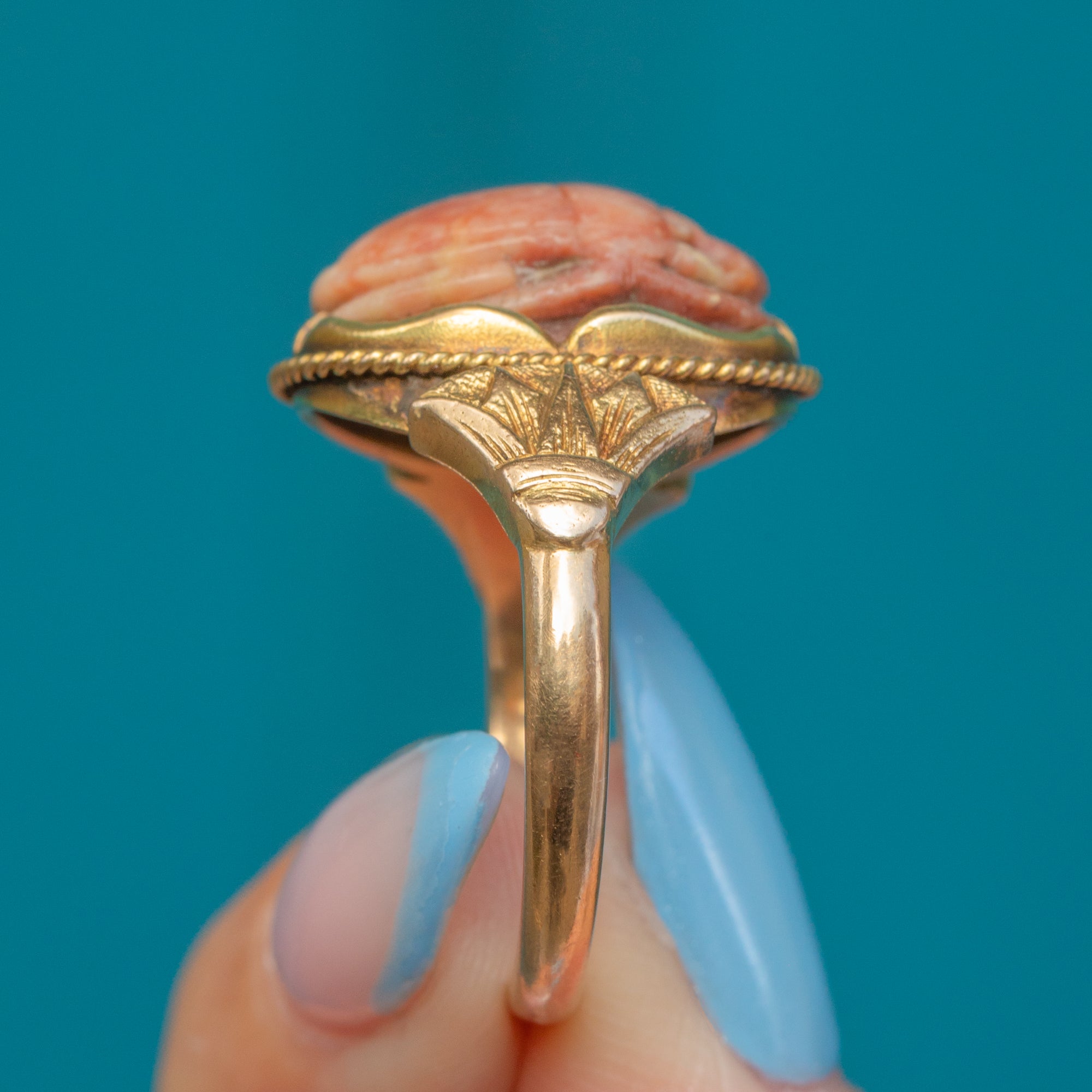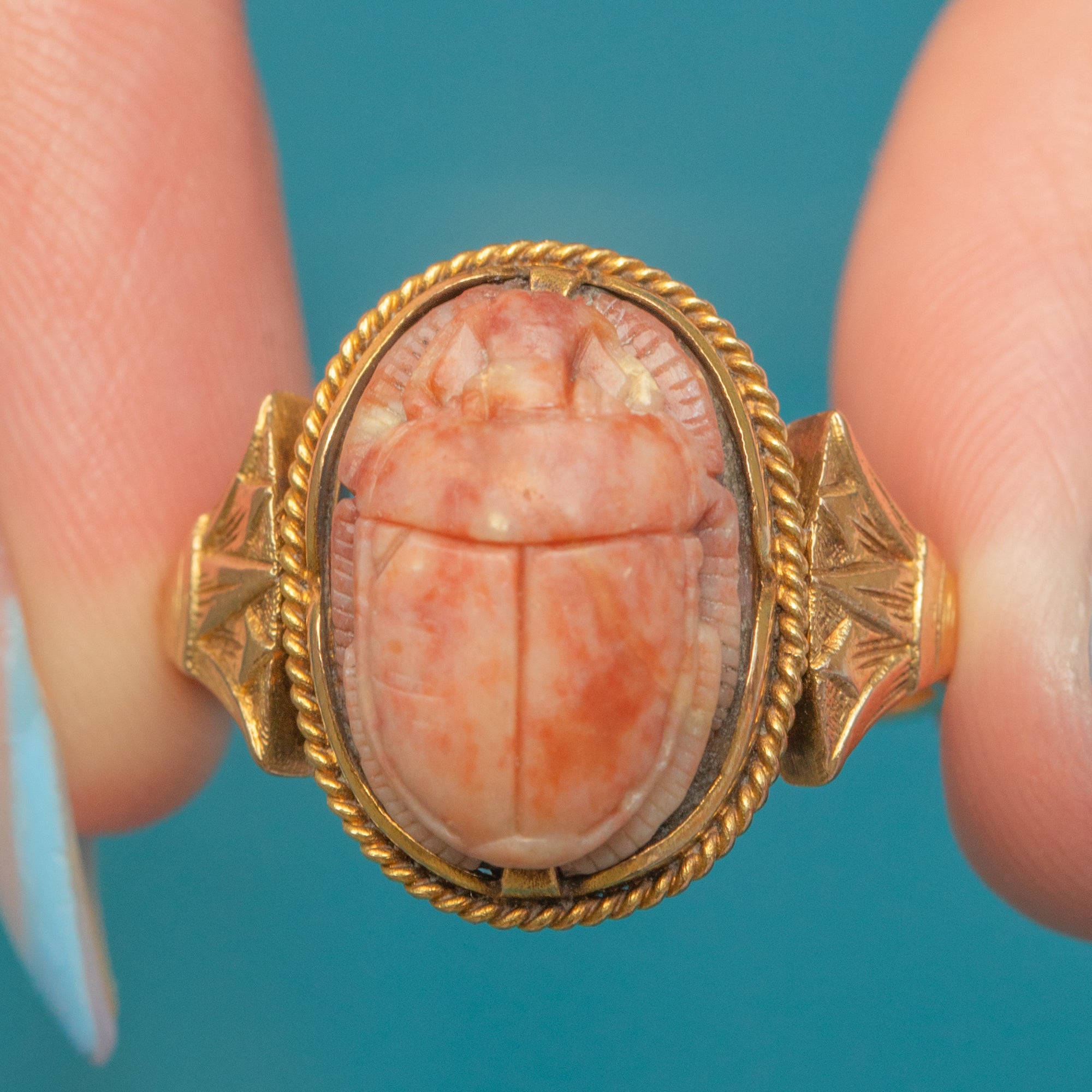 A rare and unique find, this Art Deco ring is crafted from solid 18ct Gold and displays an intricately carved Faience scarab, symbolising rebirth and eternal life, framed by a neat rope border and classically Deco geometric, fan-shaped shoulders.