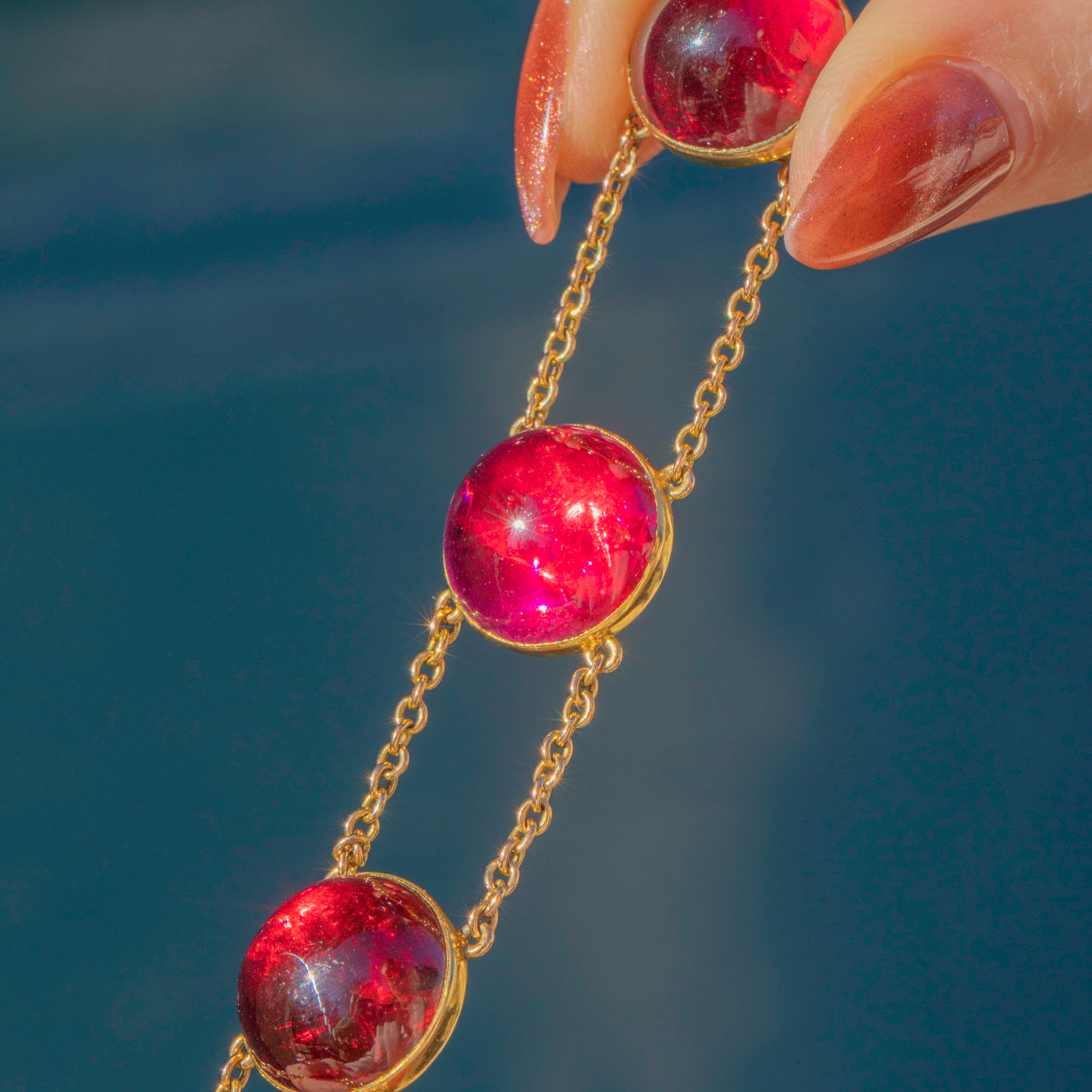 EXCELLENT: This antique 18ct Gold Garnet cabochon bracelet is in excellent condition. This 89.00ct Garnet bracelet wears uber comfortably, closing with a secure clasp. The Garnets are smooth, and secure in a bezel setting. There are some nibbles to the surface of some of the cabochons, but this isn't obvious to the naked eye! The chain links are all secure so you can wear this beauty confidently.