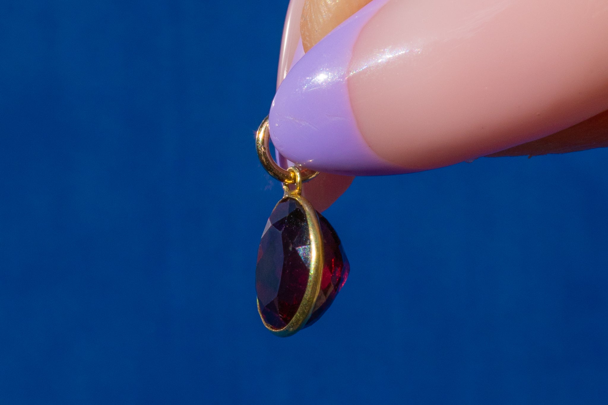 Add an instant pop of colour to your attire with this antique 18ct Gold Garnet charm, flaunting a pool of plum hues dancing between her hand-cut facets!
