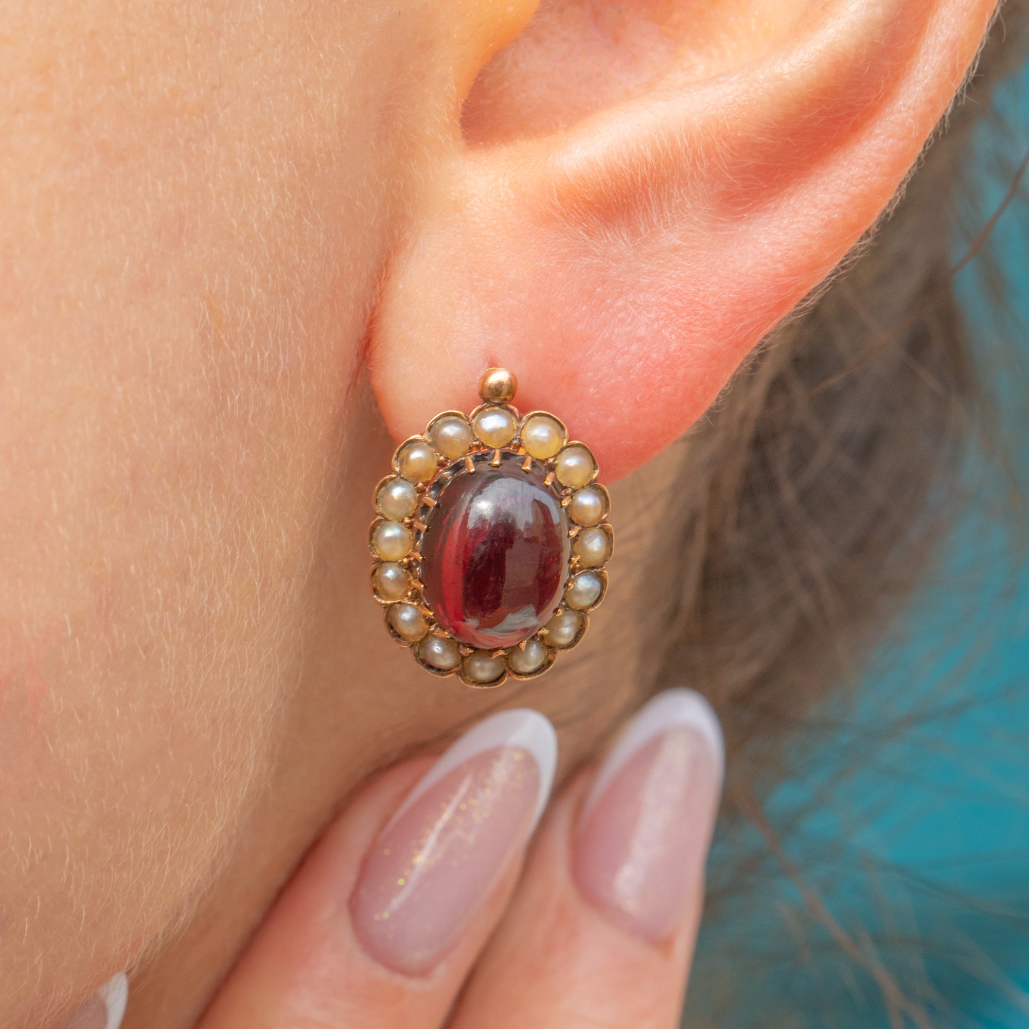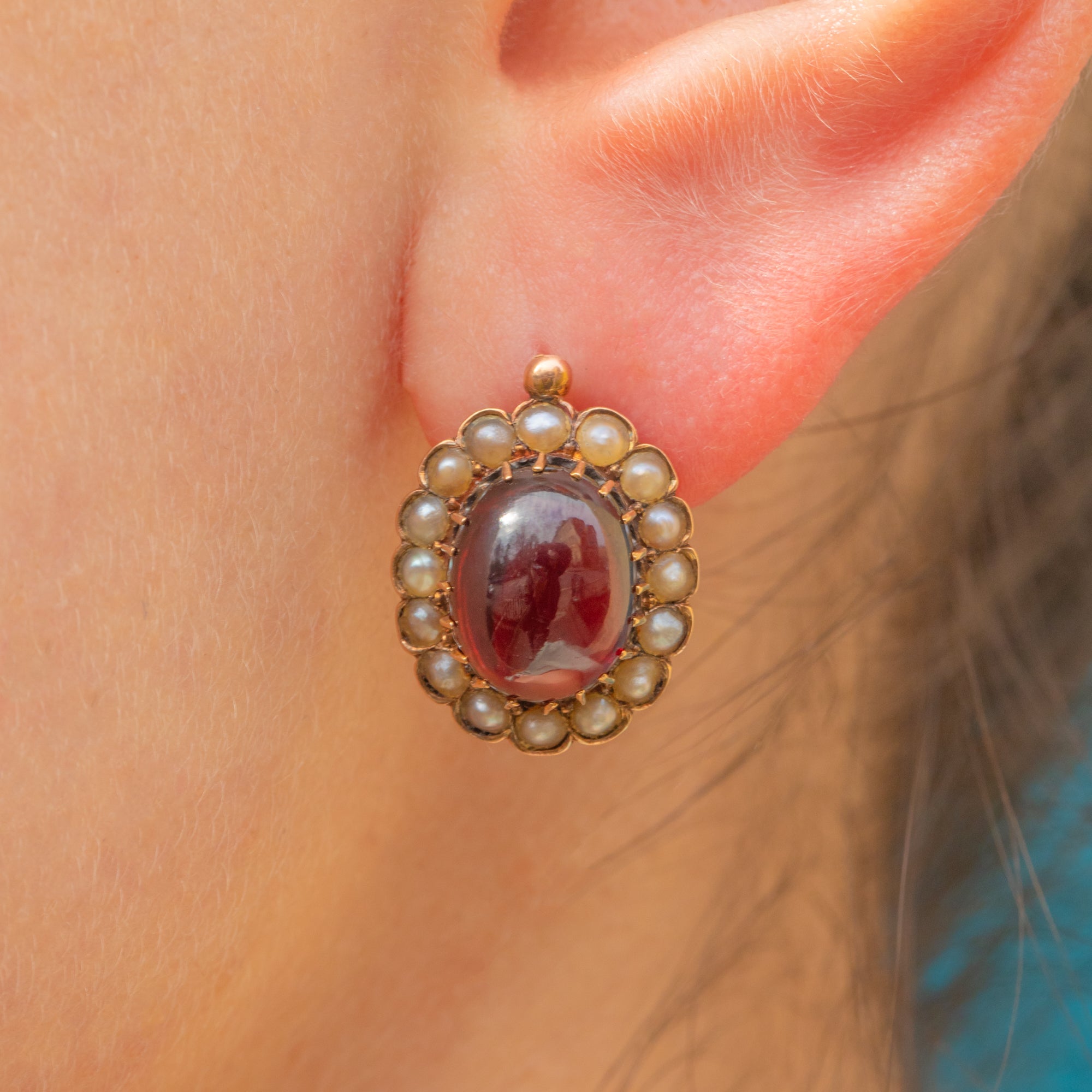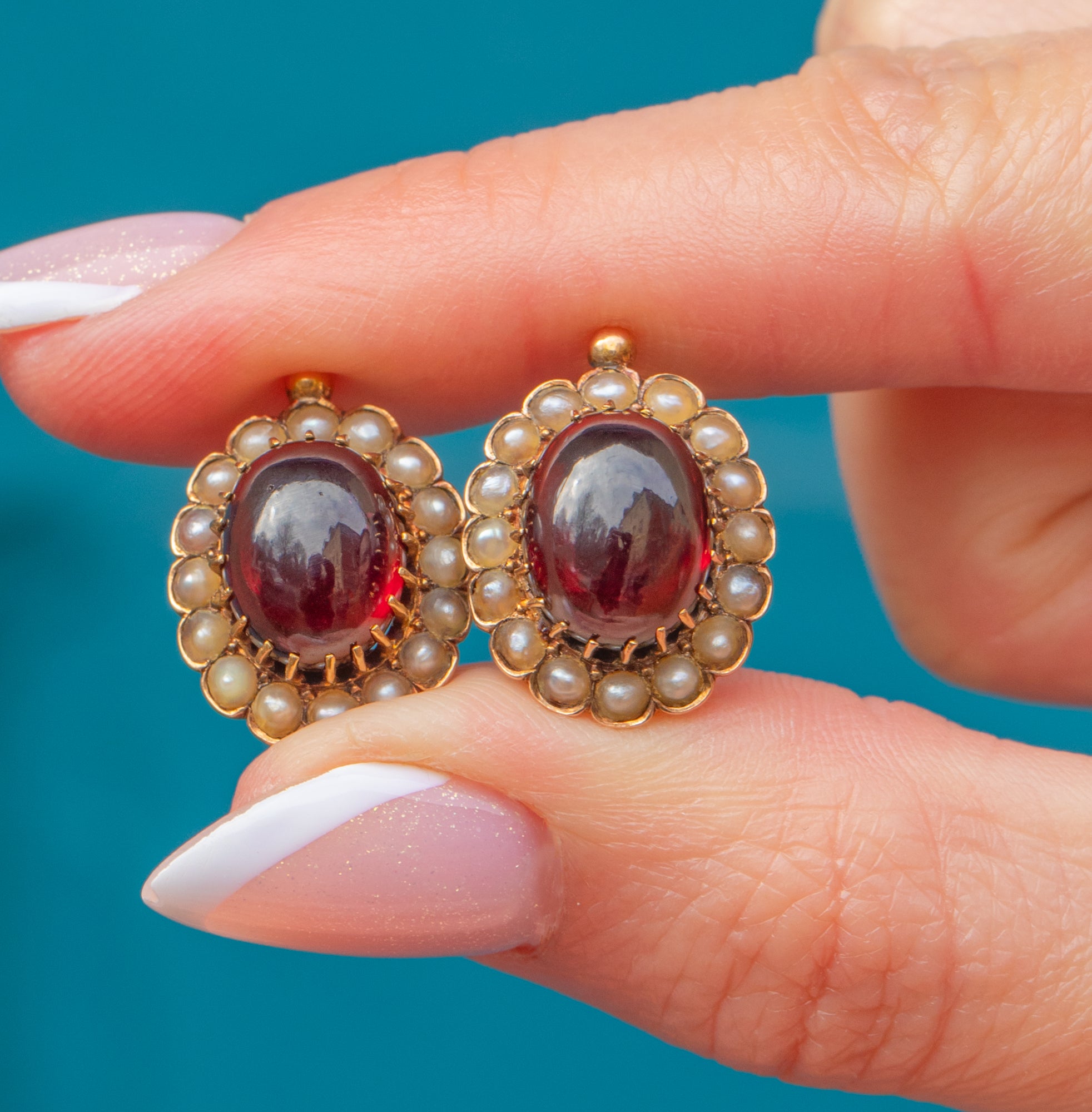 These impressive antique 18ct Gold Garnet Pearl cluster earrings exude Victorian charm from every angle! Crafted from brightly saturated 18ct Gold, each stud earring boasts a juicy 4.23ct Garnet displayed within stylistic claws, revealing deep crimson hues as their highly-domed cabochons move in the light.