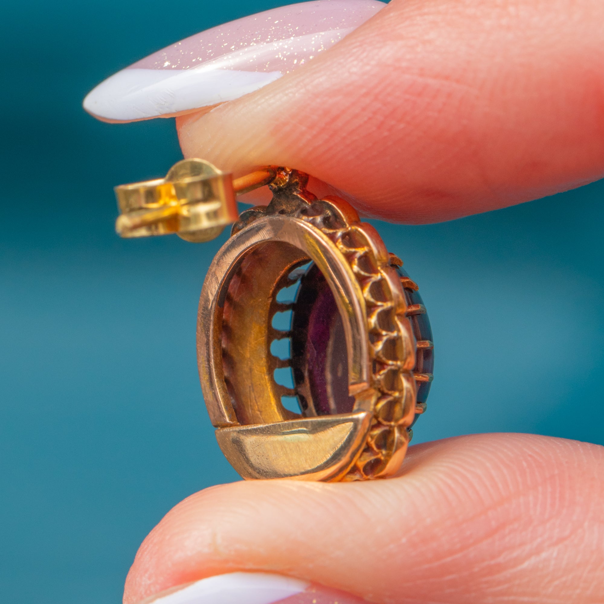 Garnets are 10.5mm long x 8mm wide, weighing approx. 8.46ct combined.
