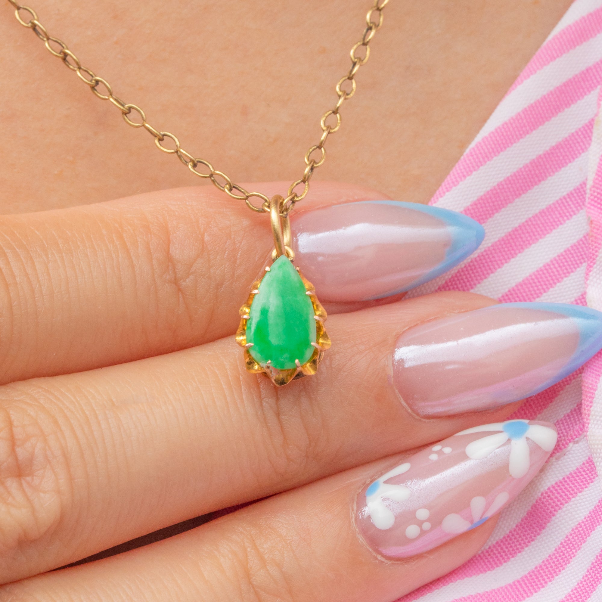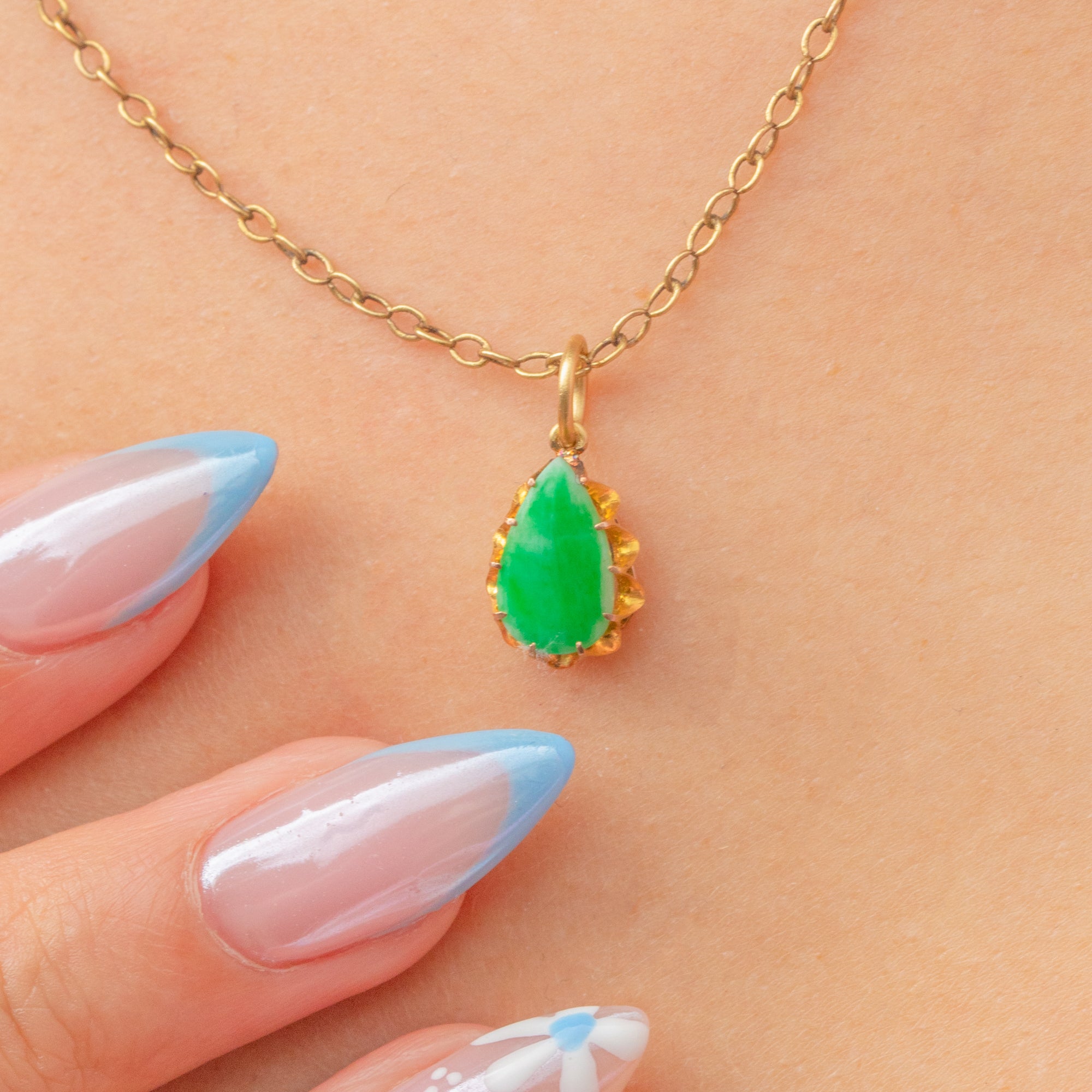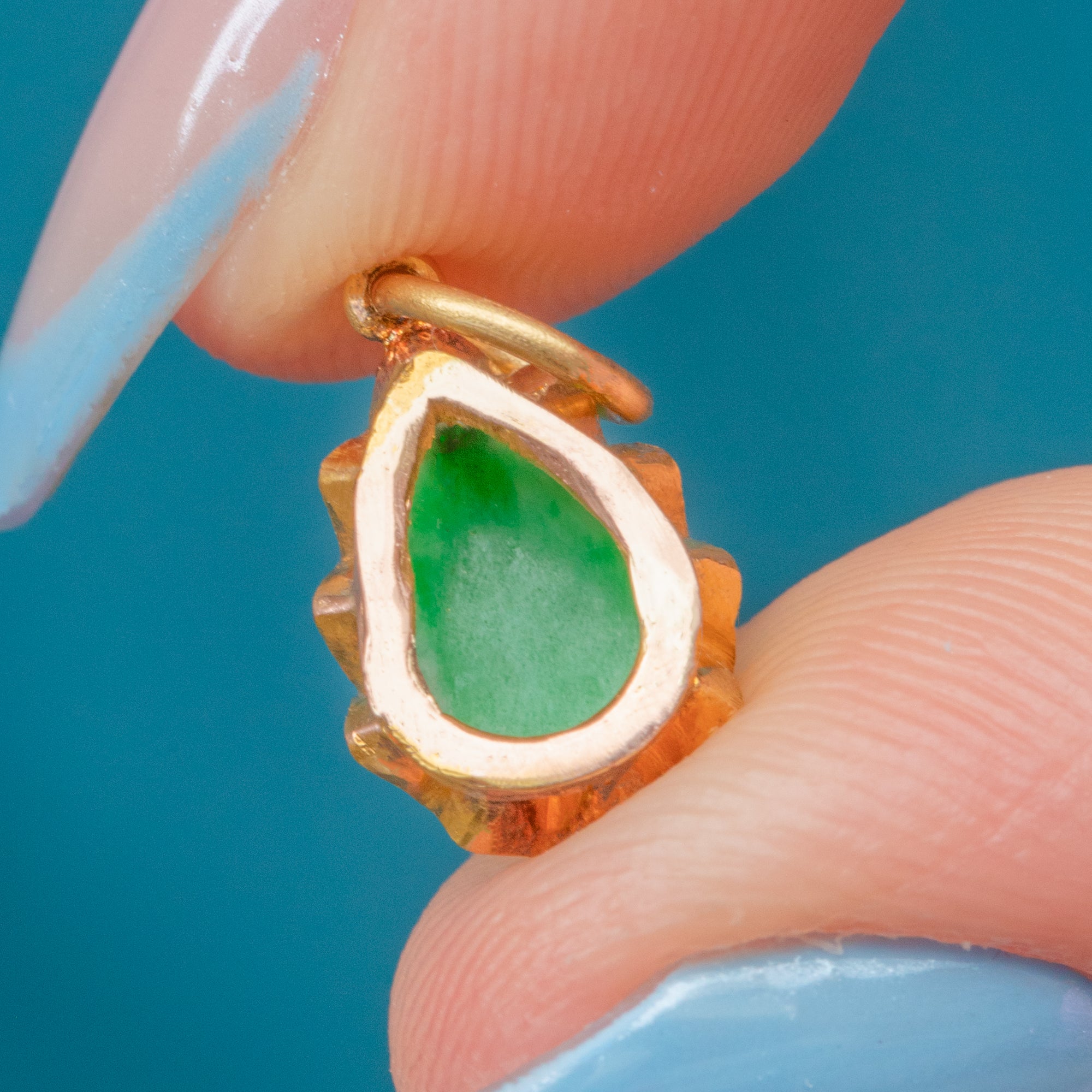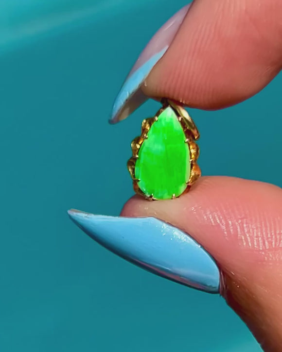 This Victorian 18ct Gold charm will bring a vibrant pop of colour to your attire! Centred by a glossy pear-shaped Jade cabochon, this antique charm projects a saturated green vibrancy from the stone, known for its spiritual healing qualities.