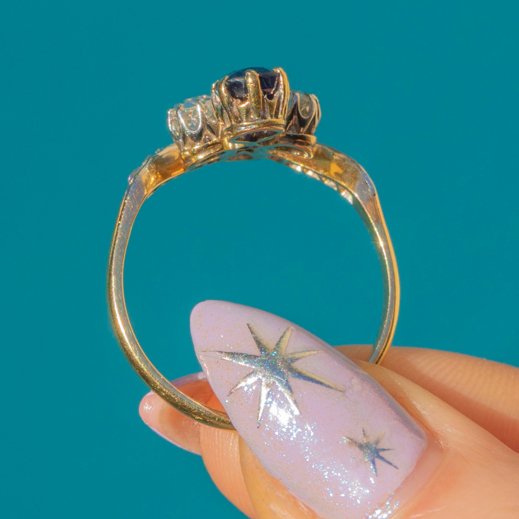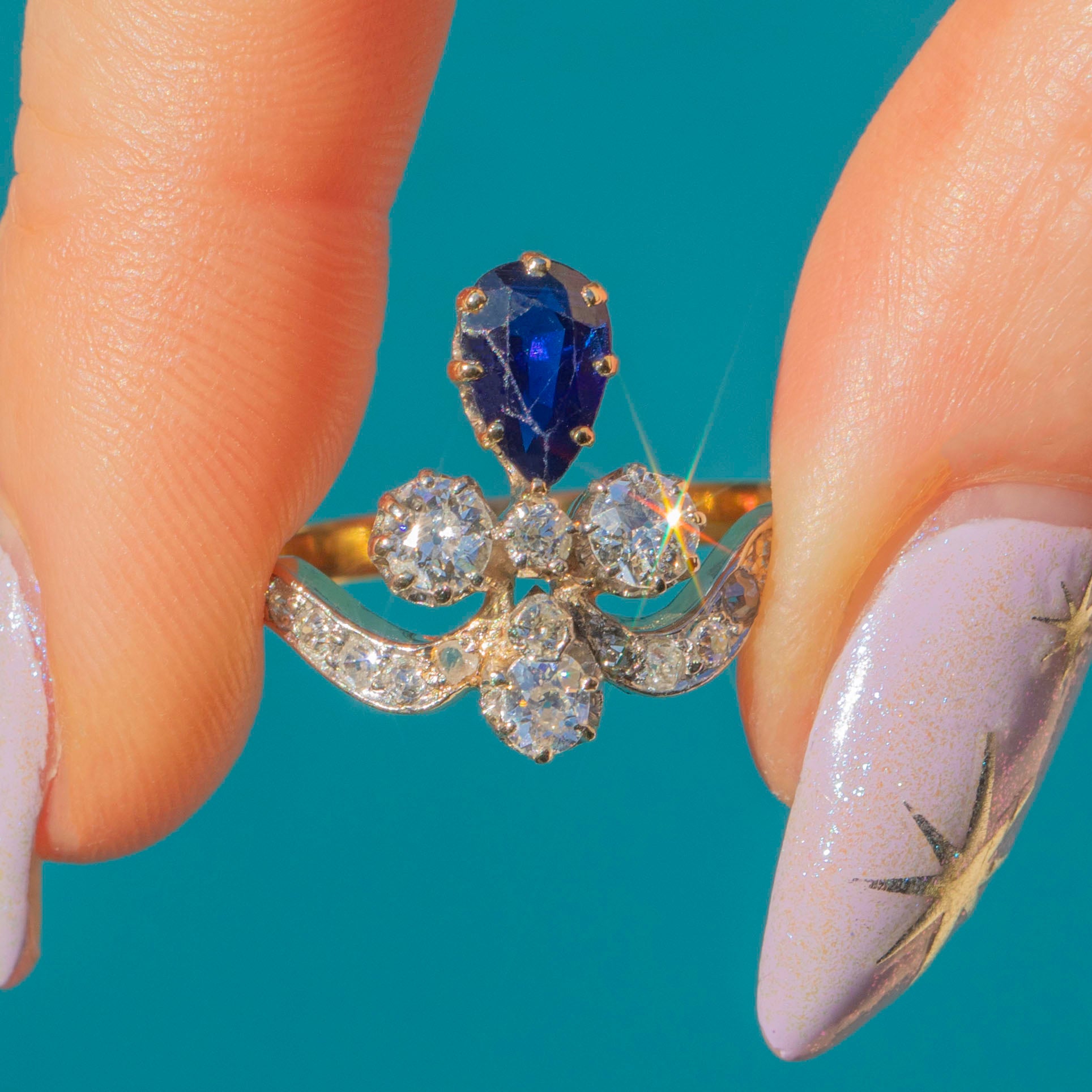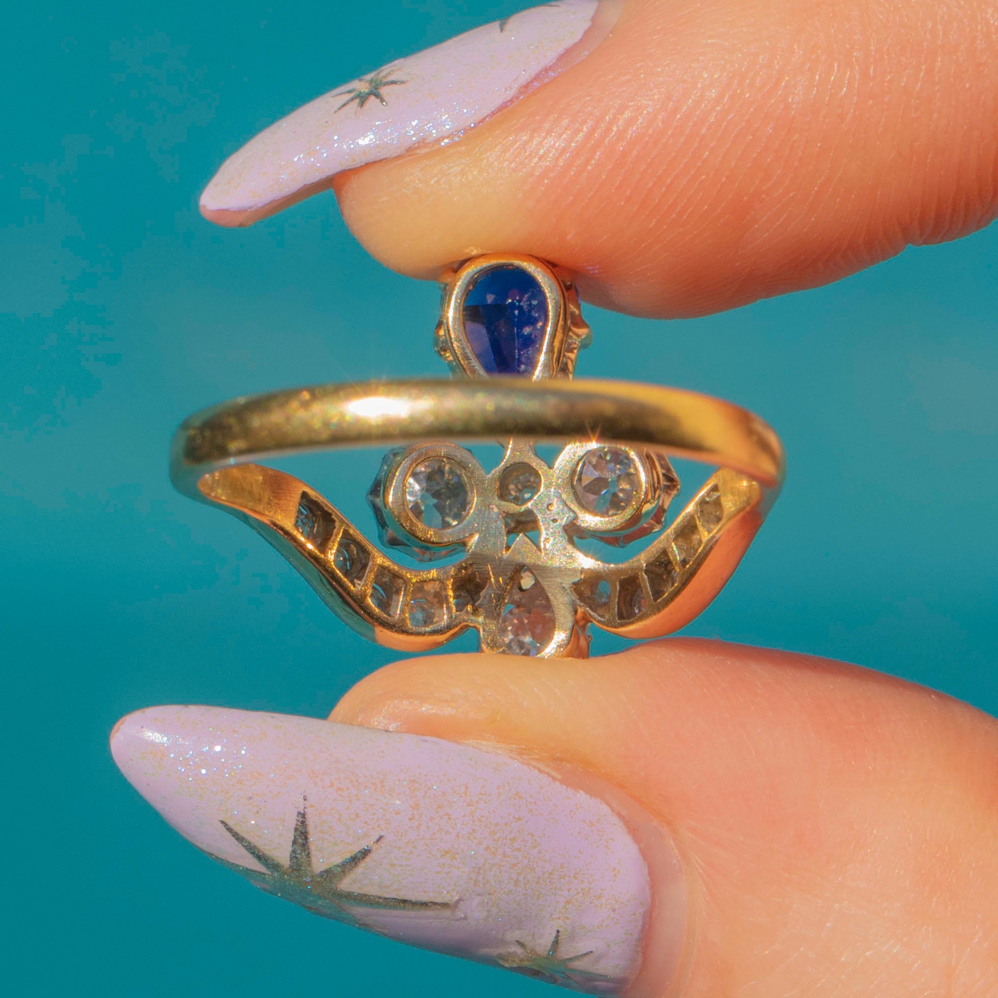 This exquisite antique 18ct Gold Sapphire & Diamond tiara ring is a true treasure, crafted in 18ct yellow Gold with elegant curves and intricate detailing. At her heart sits a stunning pear-cut 0.45ct Sapphire, her deep blue hue beautifully complemented by a sparkling array of Diamonds, totalling 0.75ct.
