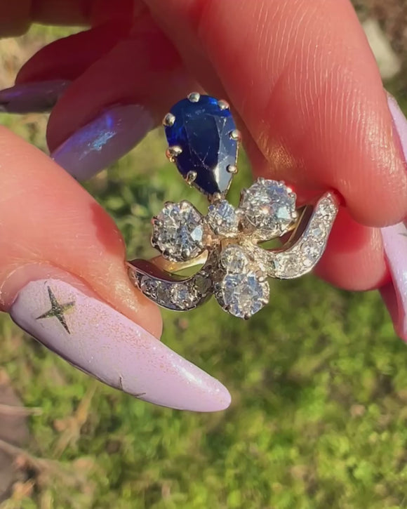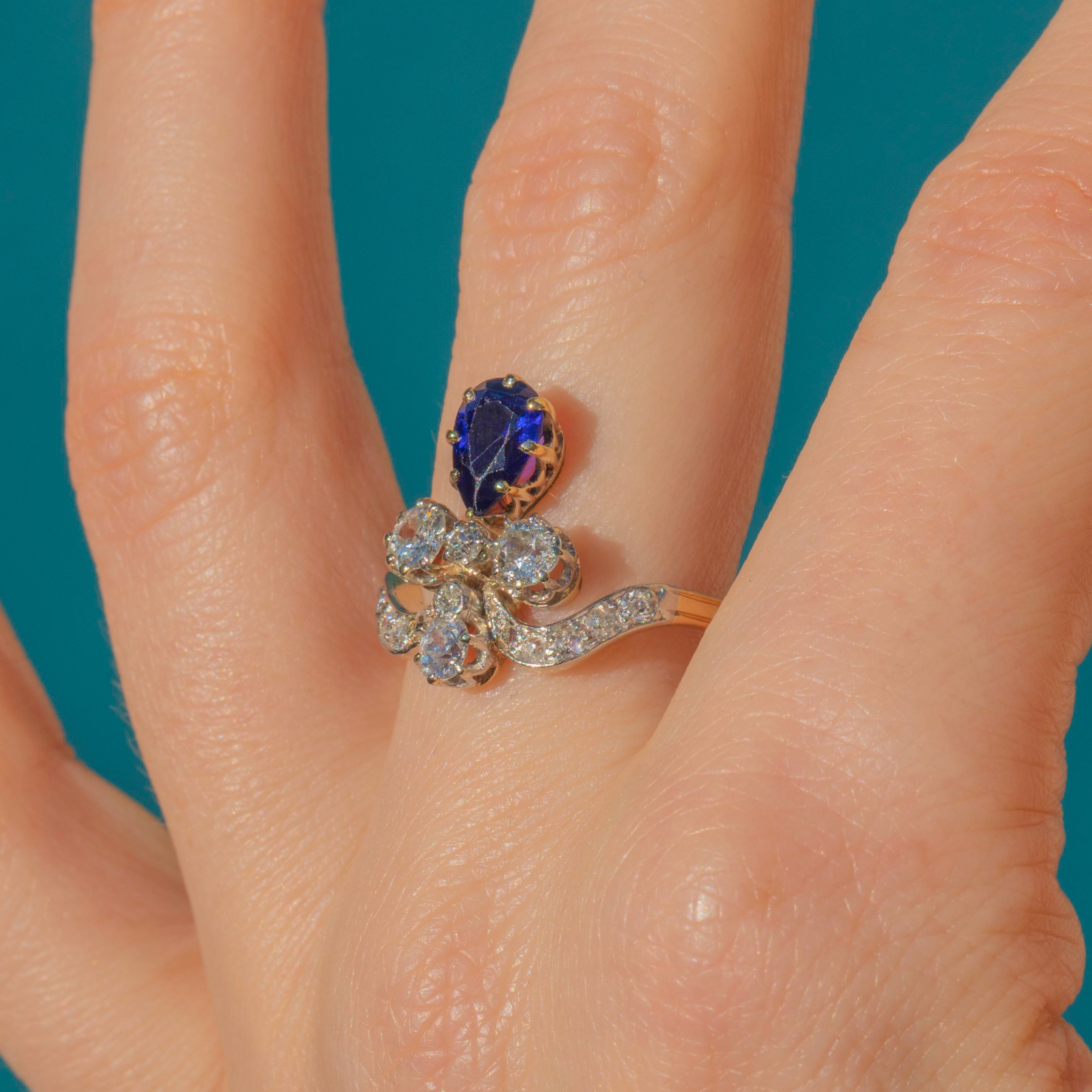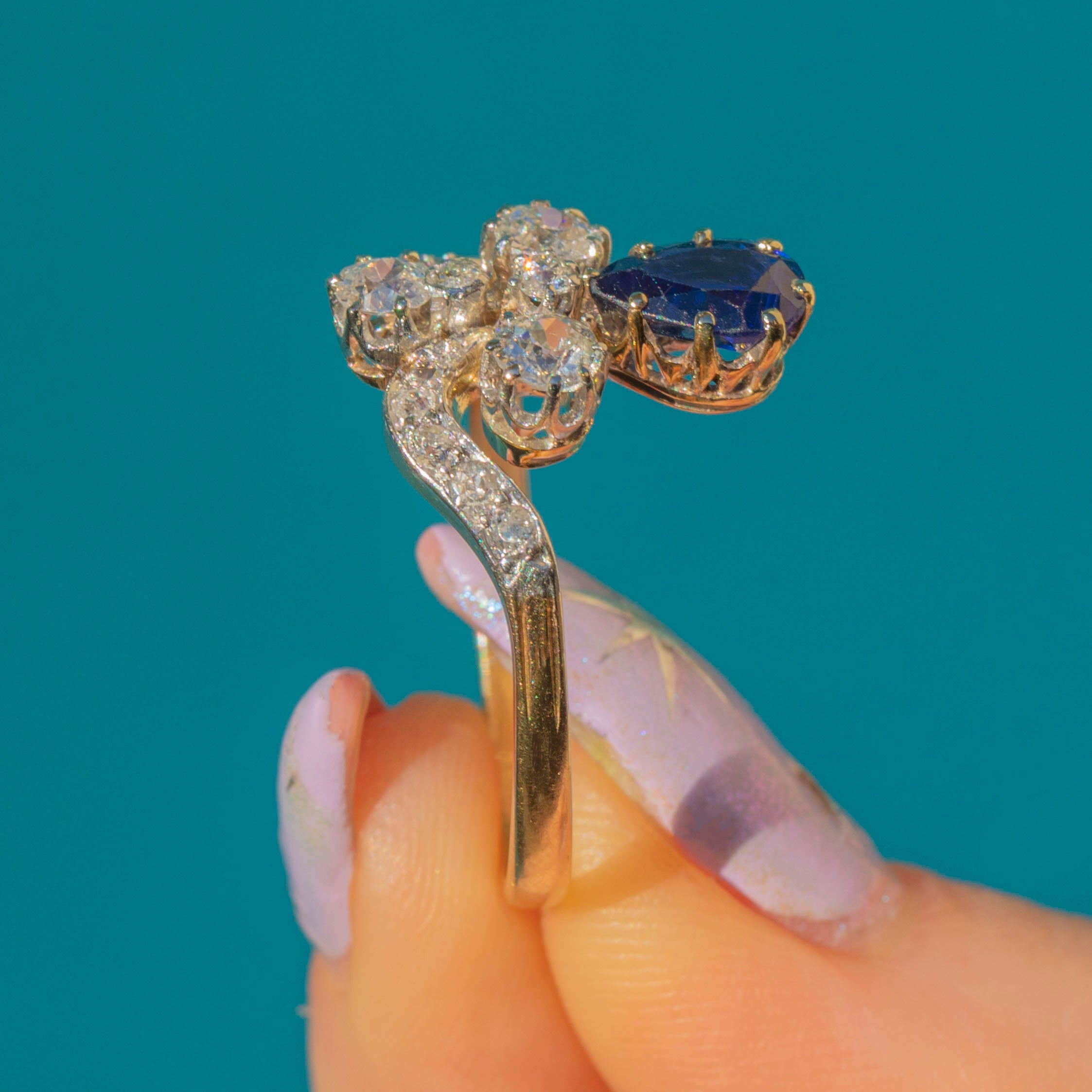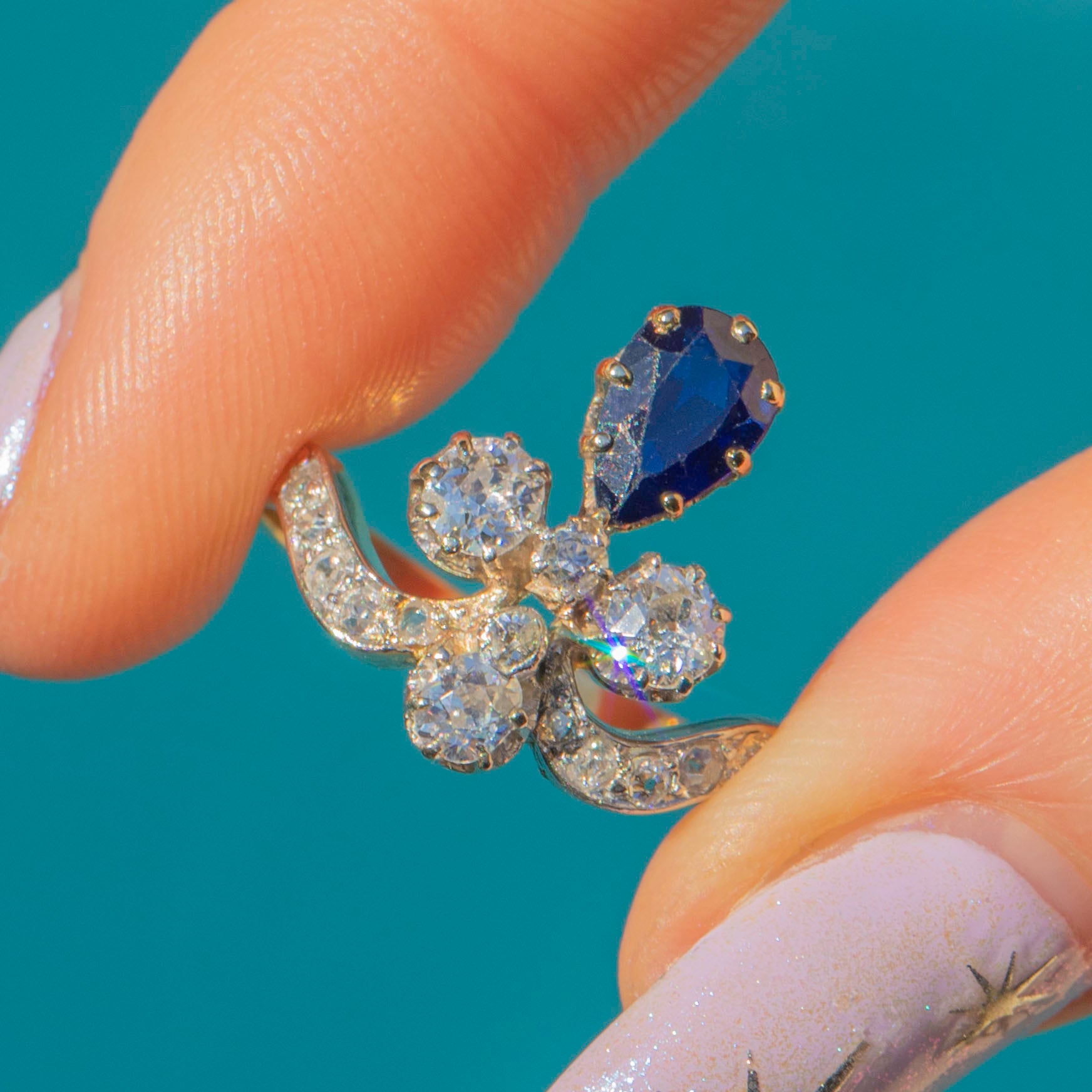 This exquisite antique 18ct Gold Sapphire & Diamond tiara ring is a true treasure, crafted in 18ct yellow Gold with elegant curves and intricate detailing. At her heart sits a stunning pear-cut 0.45ct Sapphire, her deep blue hue beautifully complemented by a sparkling array of Diamonds, totalling 0.75ct.