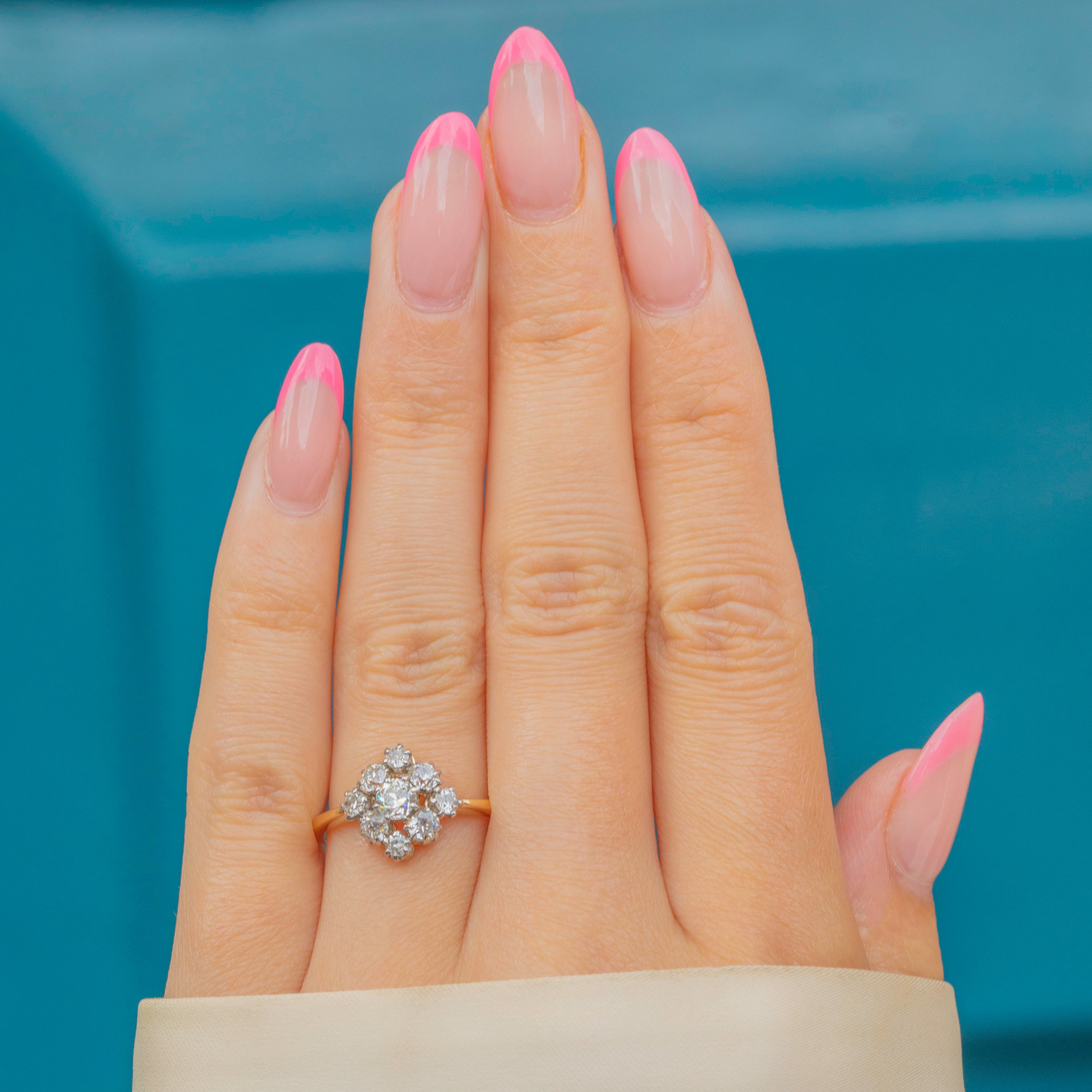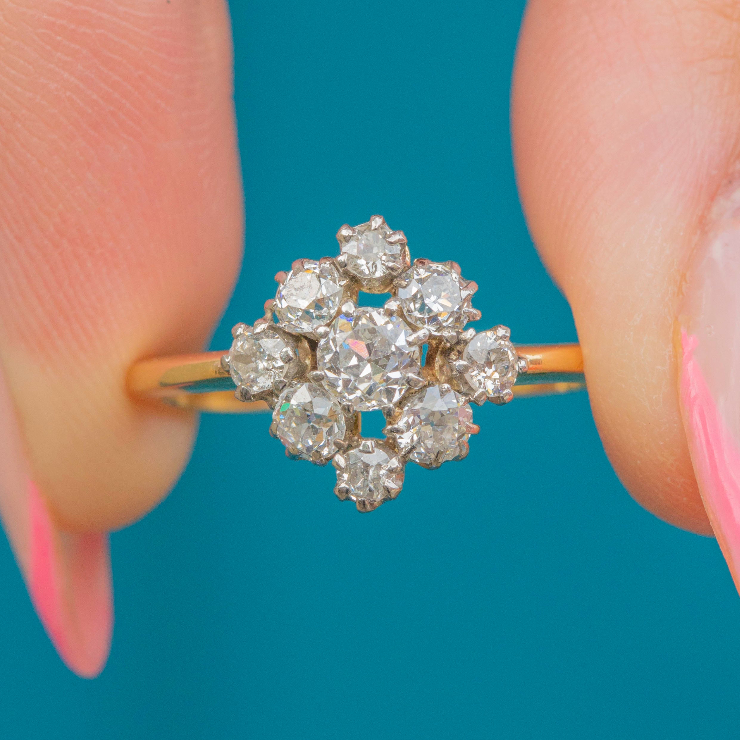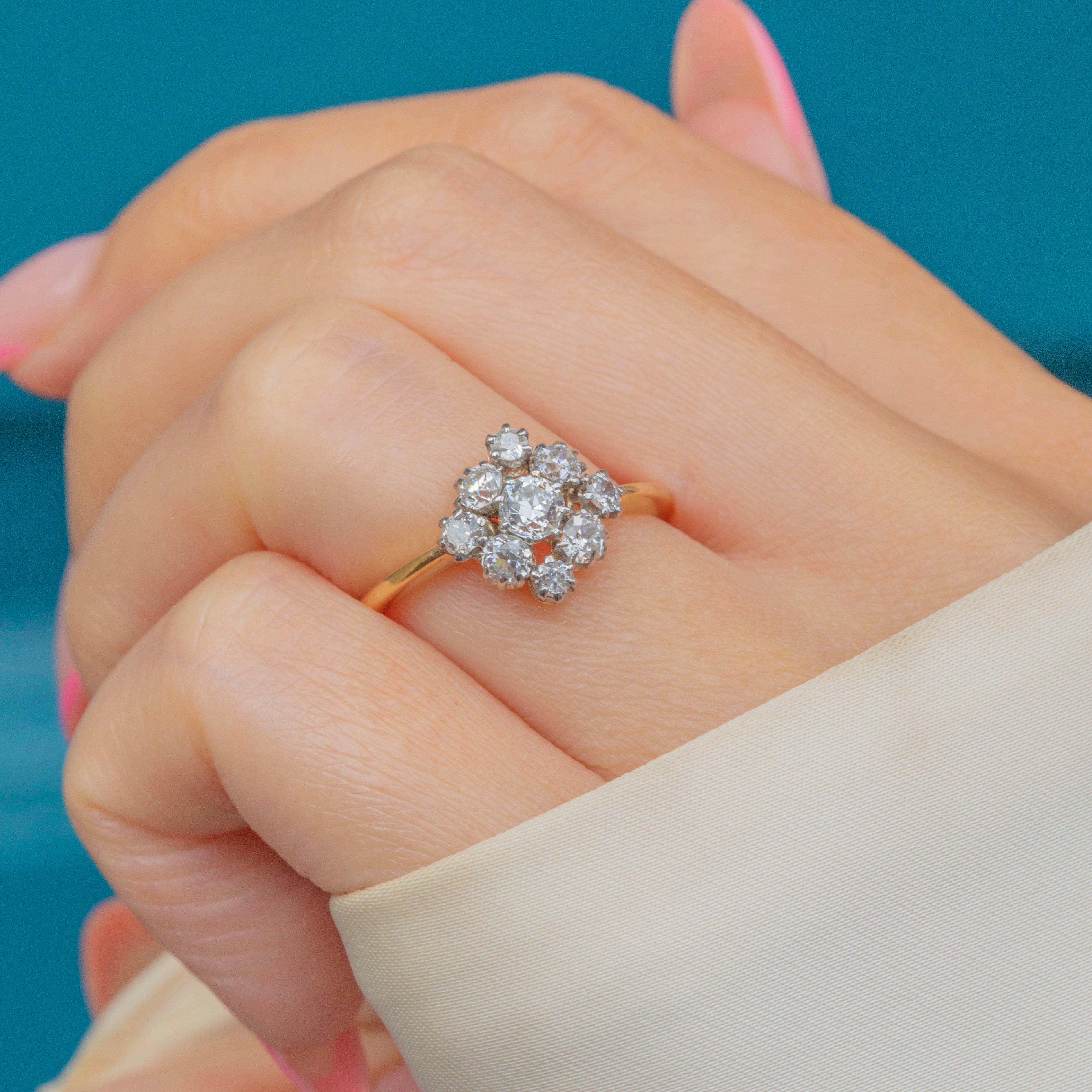 Add some luxurious sparkle to your hand with this charming 0.75ct antique 18ct Gold Old-European Diamond cluster ring! Arranged into a timeless diamond shape, the cluster twinkles elegantly in the light.
