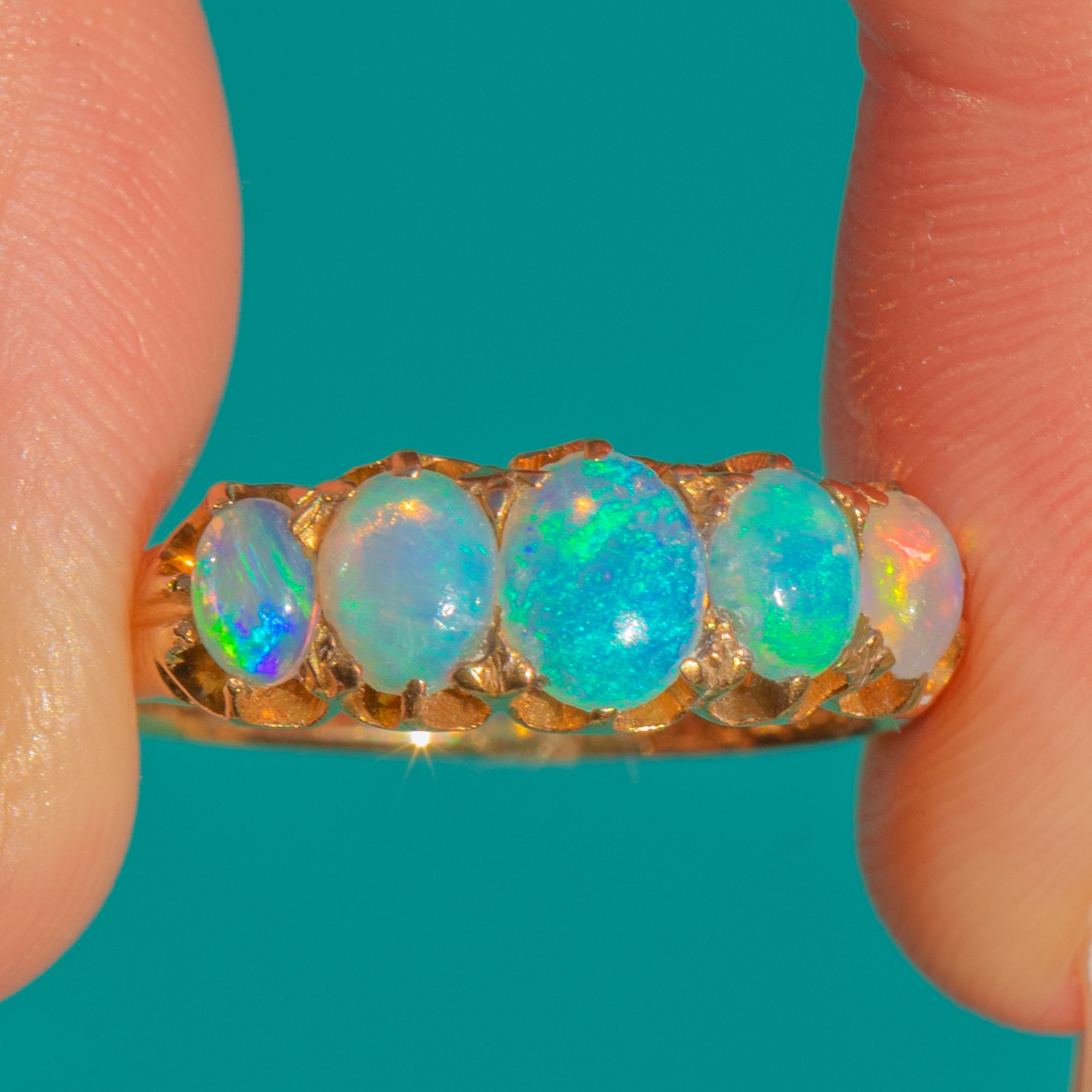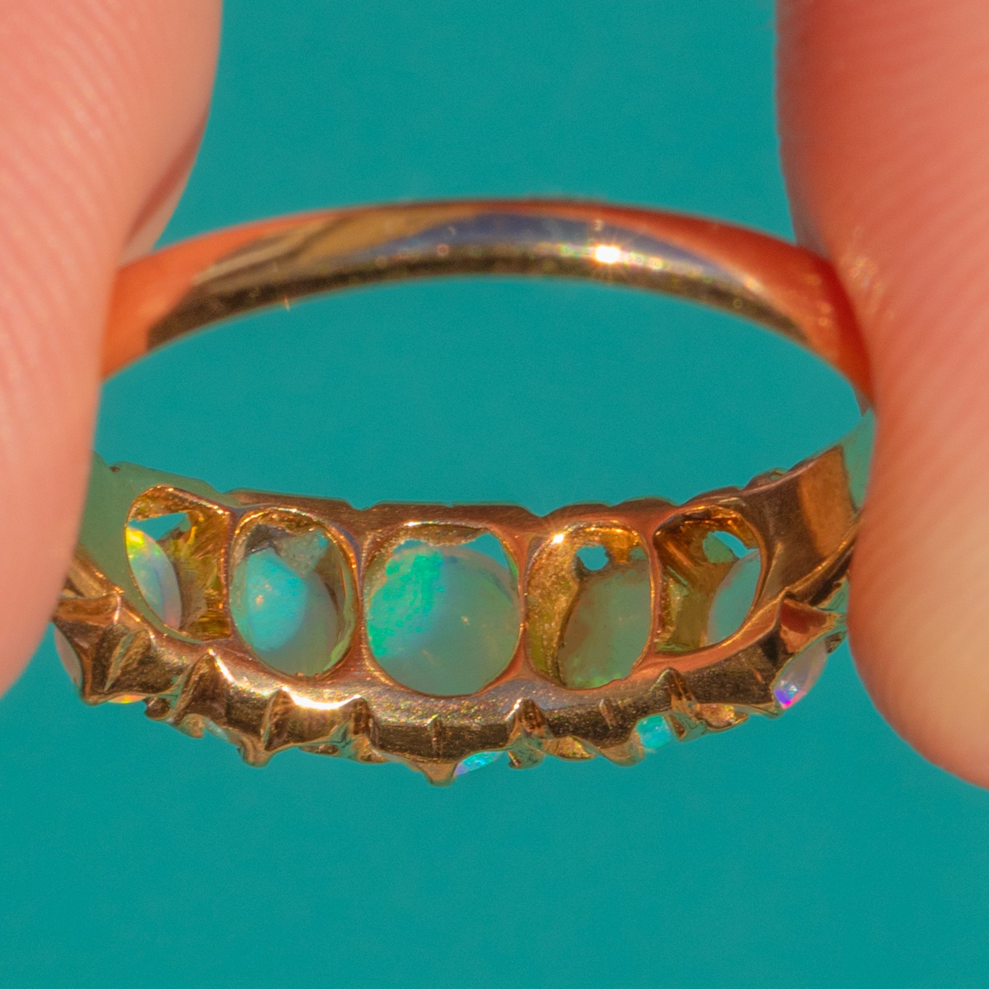 This Edwardian five stone Opal ring is a beautifully romantic piece, set with glowing natural solid Opals in a classic carved 18ct Gold gallery. The graduating Opals shimmer with soft flashes of colour, creating a lovely, fluid line of light across the finger.