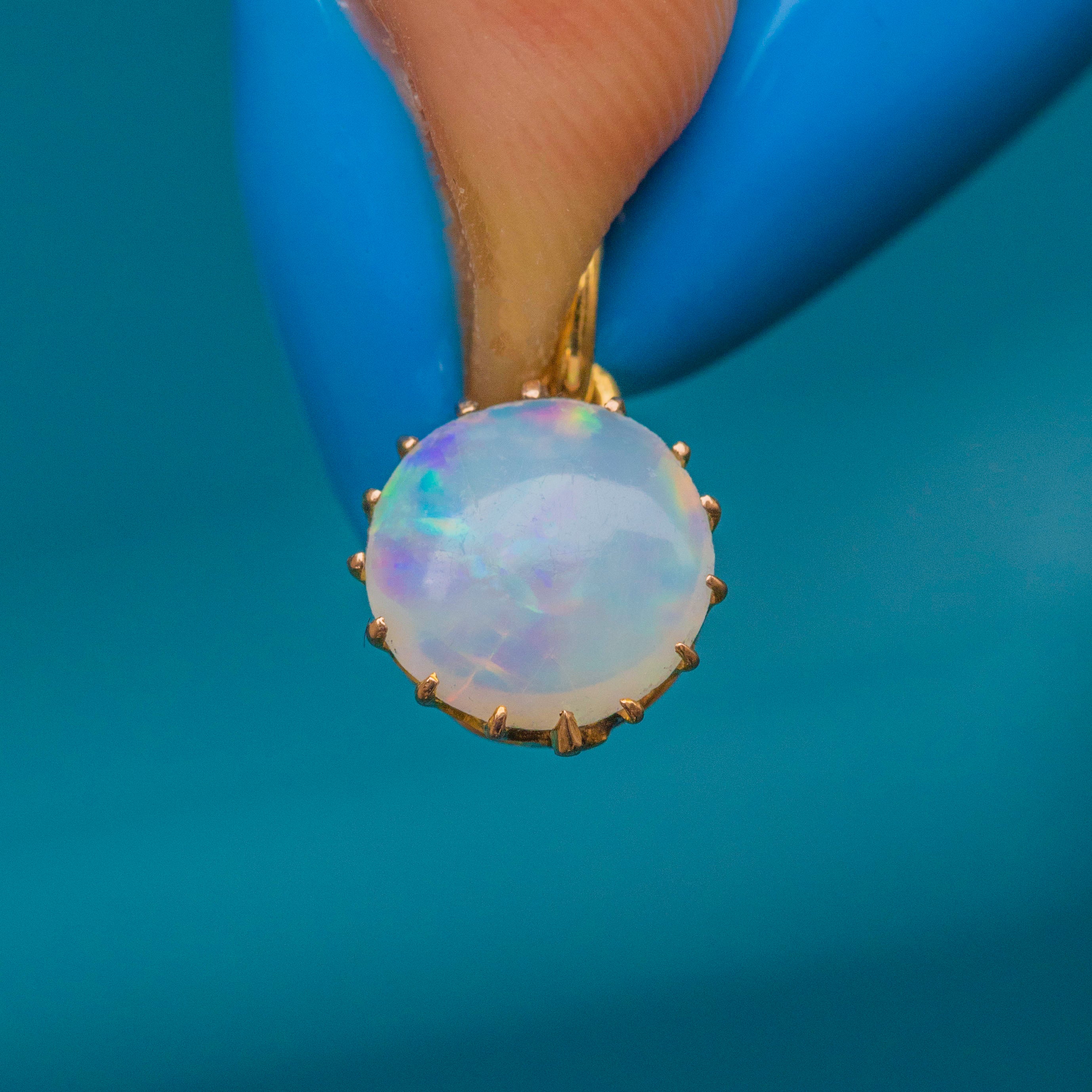 EXCELLENT. We absolutely adore this antique 18ct Gold Opal round charm! In excellent condition overall, the Opal is securely set, smooth, and has a gorgeous array of colours. The delicate Gold claw setting is buttery and the jump ring allows you to securely adorn her suspended from an antique Gold chain.
