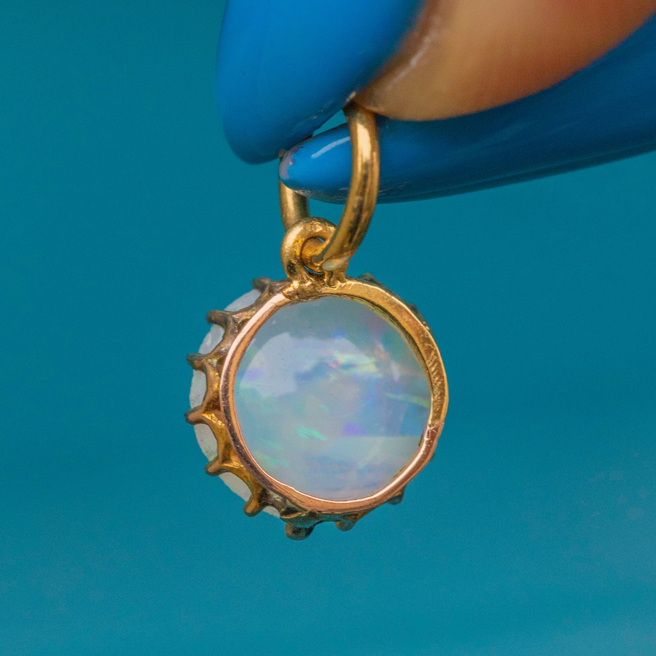 This fabulous antique 18ct Gold Opal round charm will quickly become the cutest piece in your antique jewellery collection! The mesmerising milky 0.70ct Opal bursts with zingy greens, hot pinks and sky blues akin to a pop of confetti.