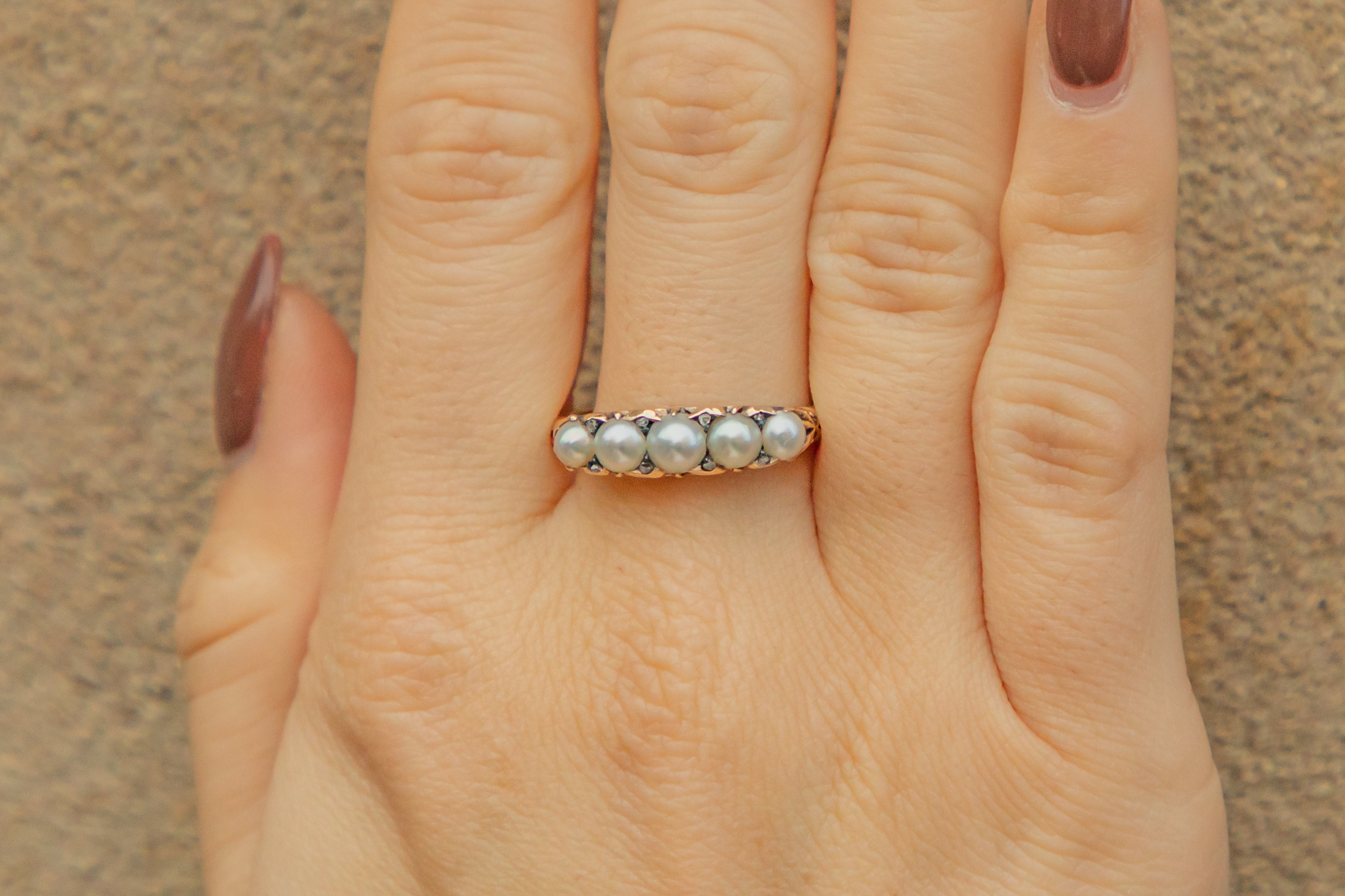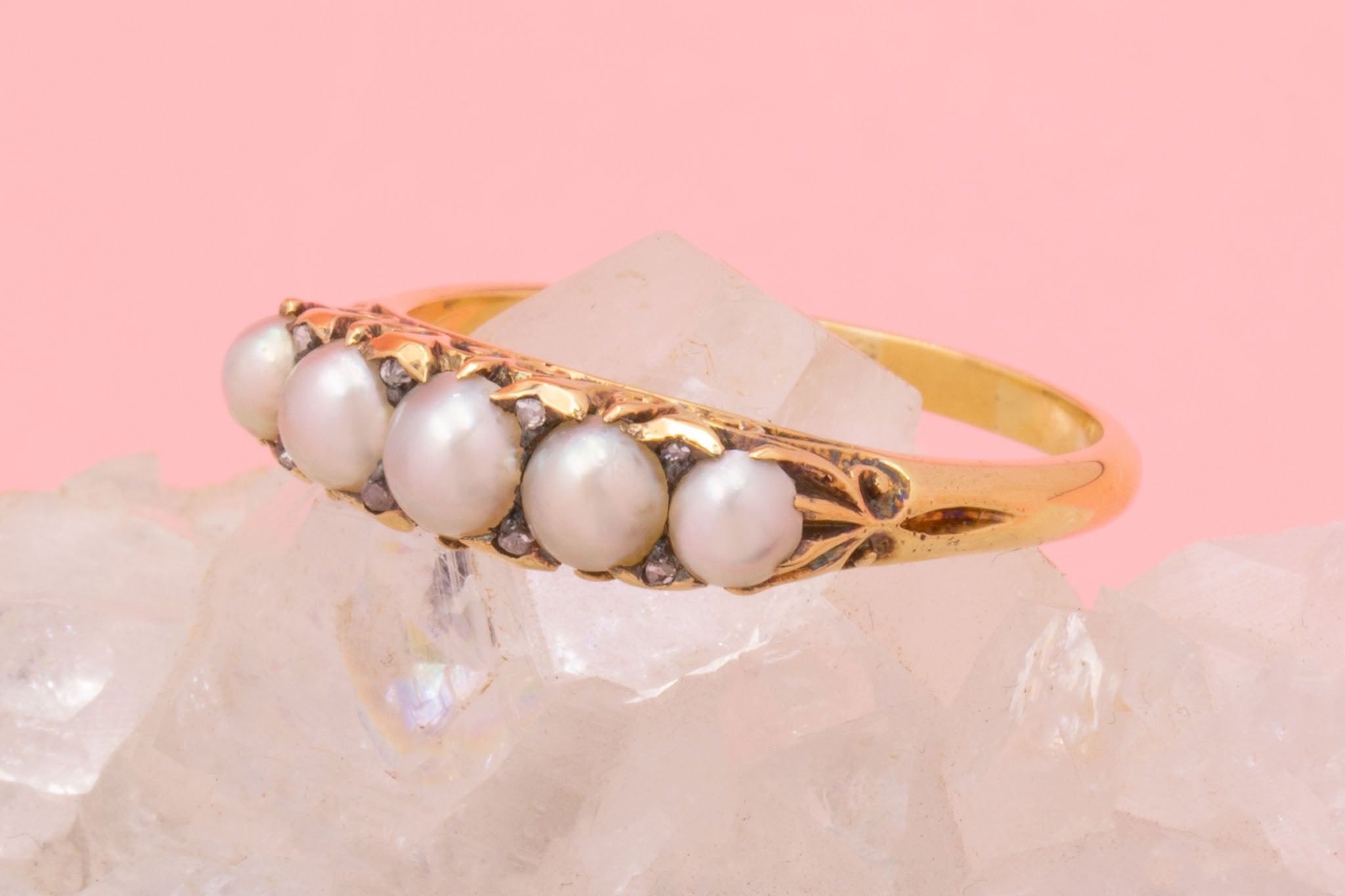 Nestled between each satin white Pearl lies a dainty rose-cut Diamond, providing a boost of sparkle. This Victorian ring has been crafted from fine quality 18ct Gold, and has wispy scrolled settings for a feminine feel!