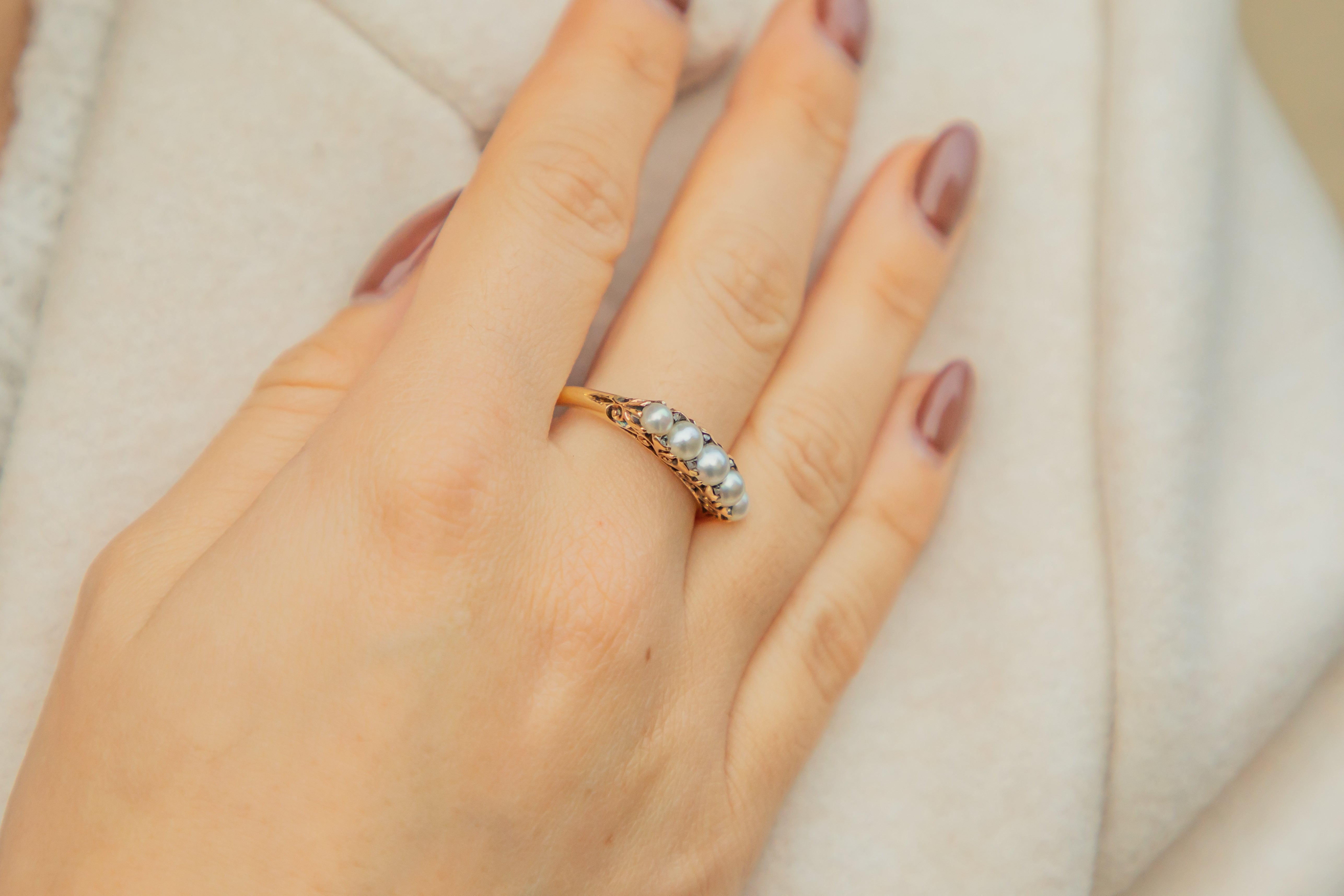 What a remarkable antique 18ct Gold Pearl half hoop ring! We adore this tasteful piece of Victorian jewellery, consisting of five subtly graduating Pearls which are soft to the touch and have a satiny finish.