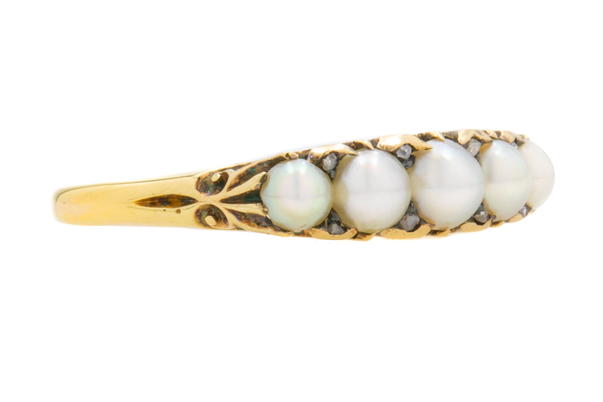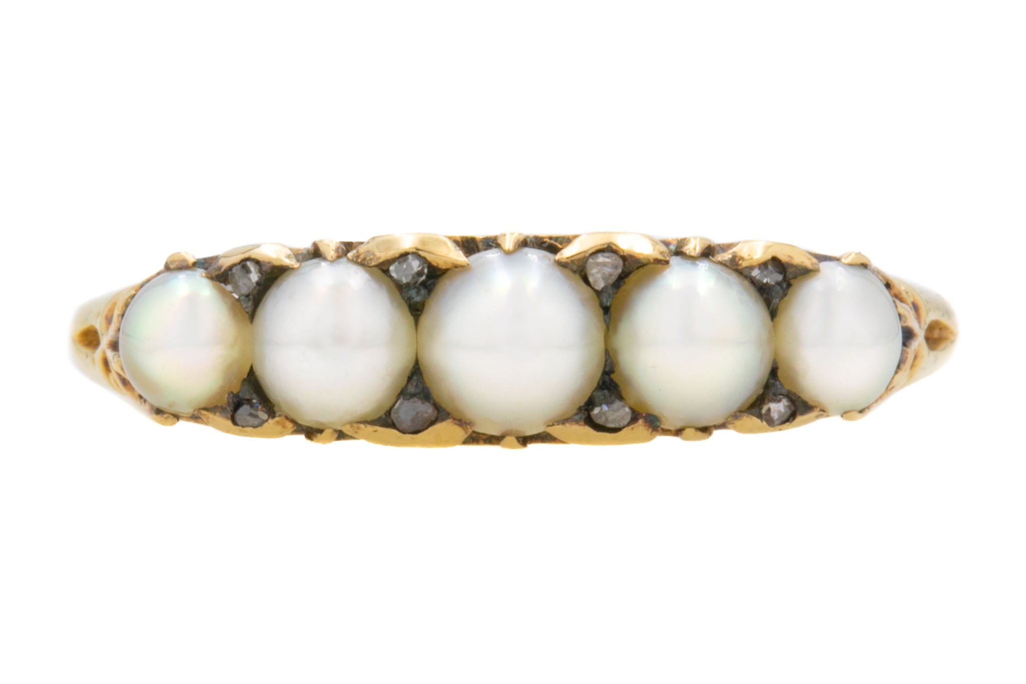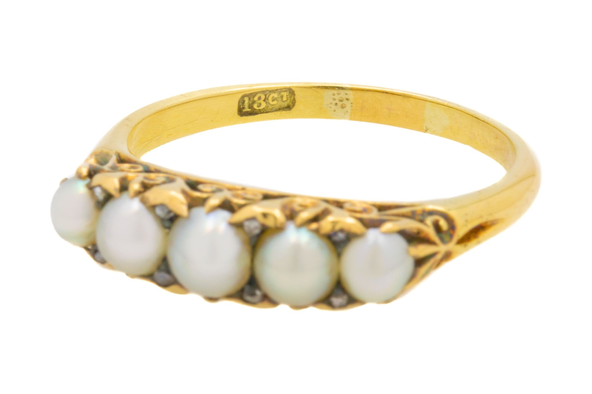 Antique 18ct Gold Pearl Half Hoop Ring, with Diamond Spacers