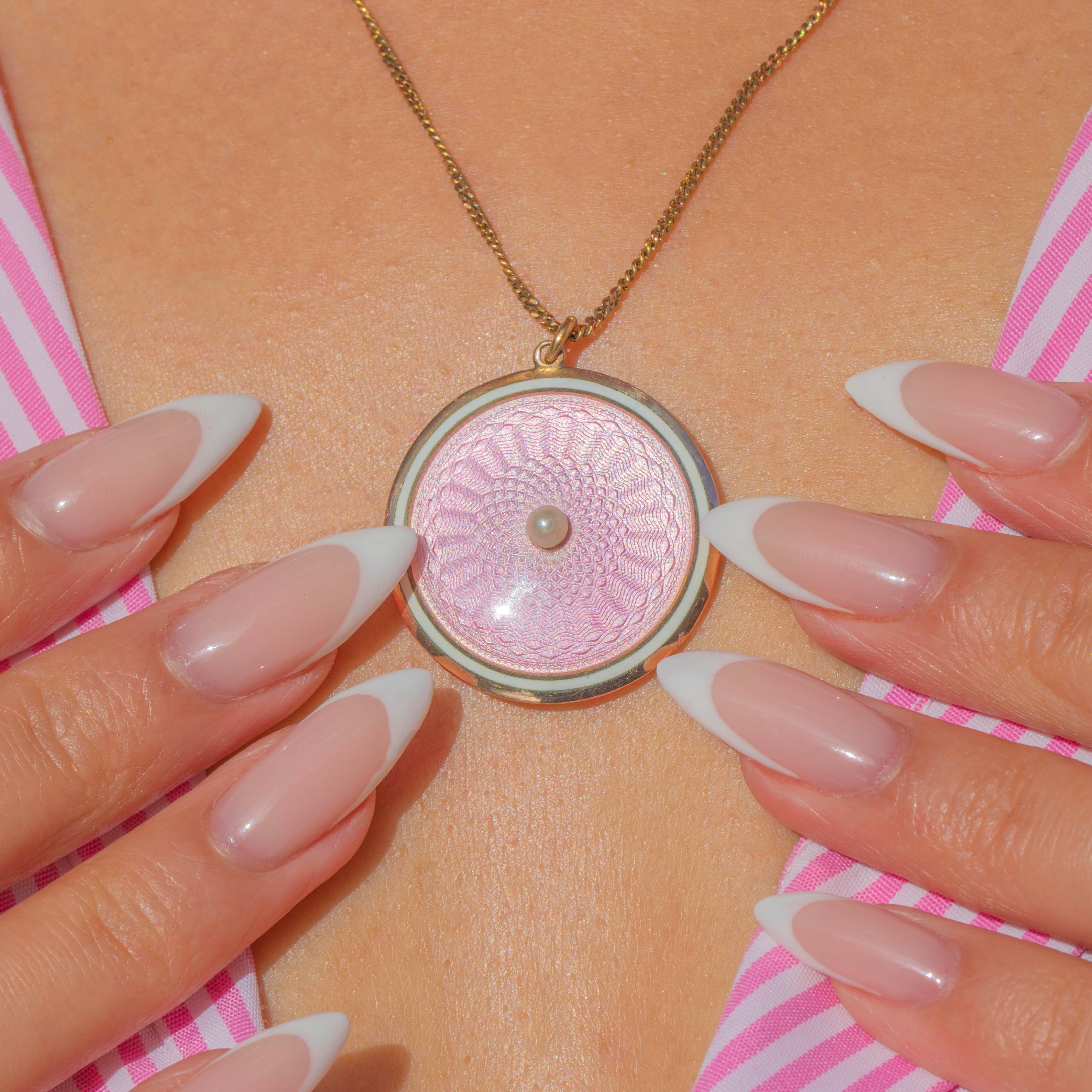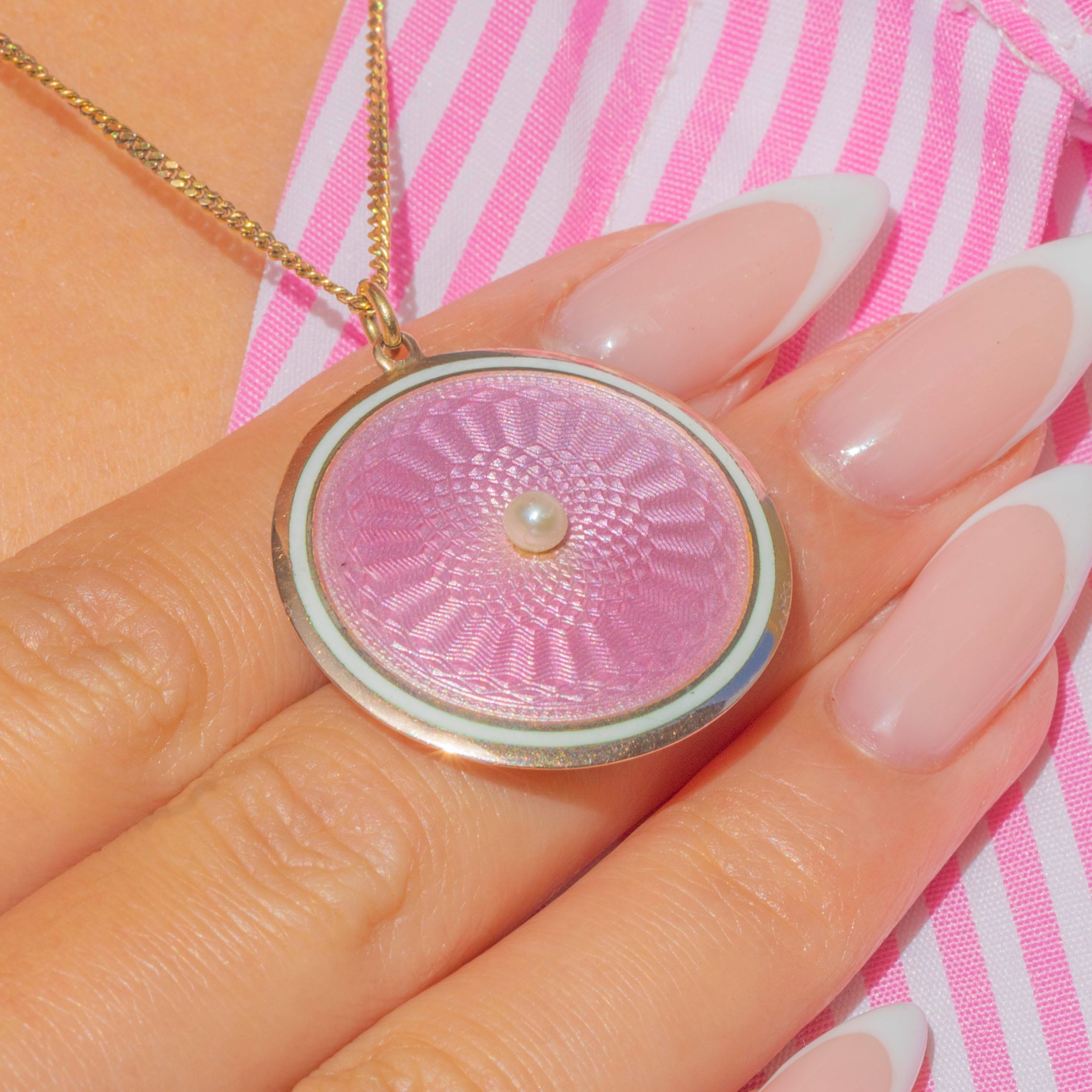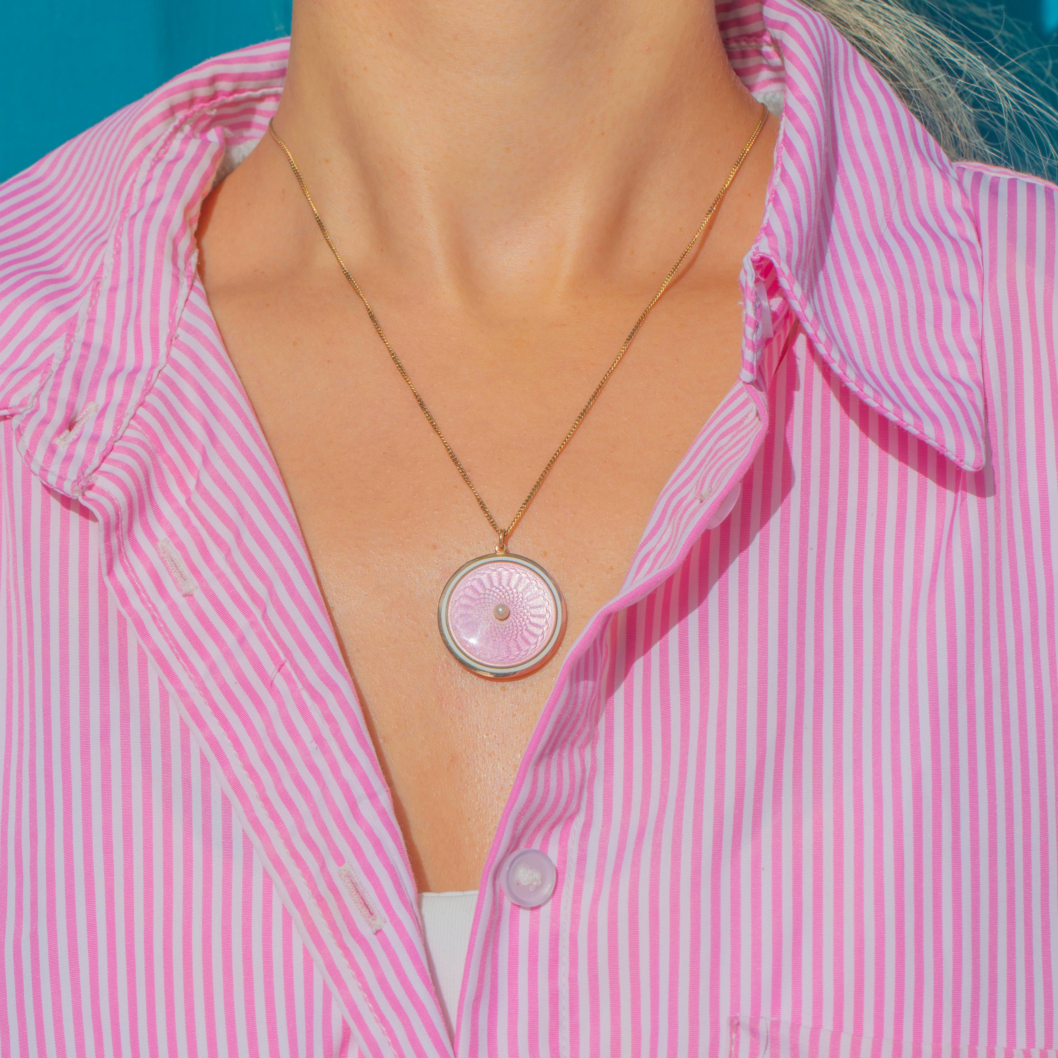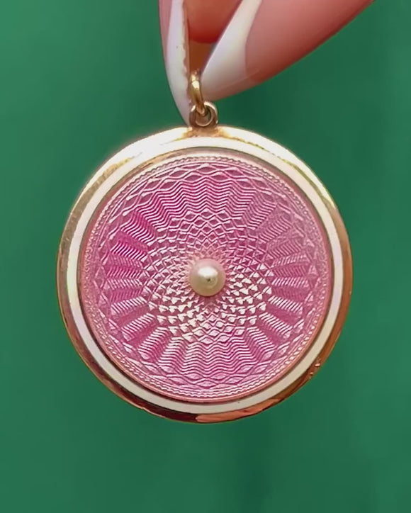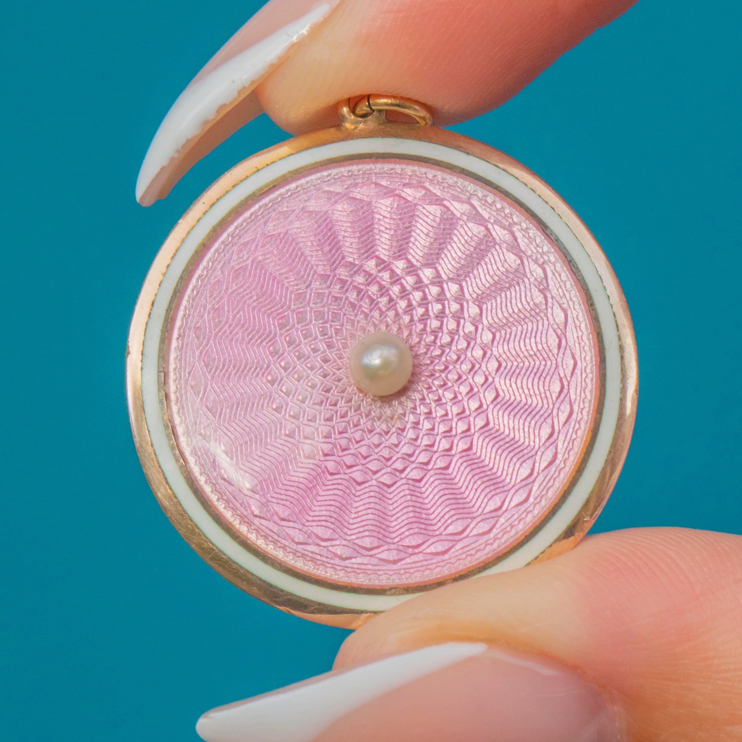 This exquisite antique locket-back pendant is a striking example of early 20th-century craftsmanship. Crafted in 18ct Gold, the pendant features pink Guilloché Enamel radiating in a starburst pattern, framed by a white Enamel border for an elegant contrast. At its centre sits a luminous natural Pearl, adding a refined focal point to the design.