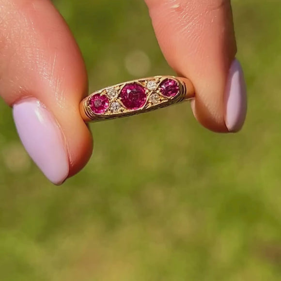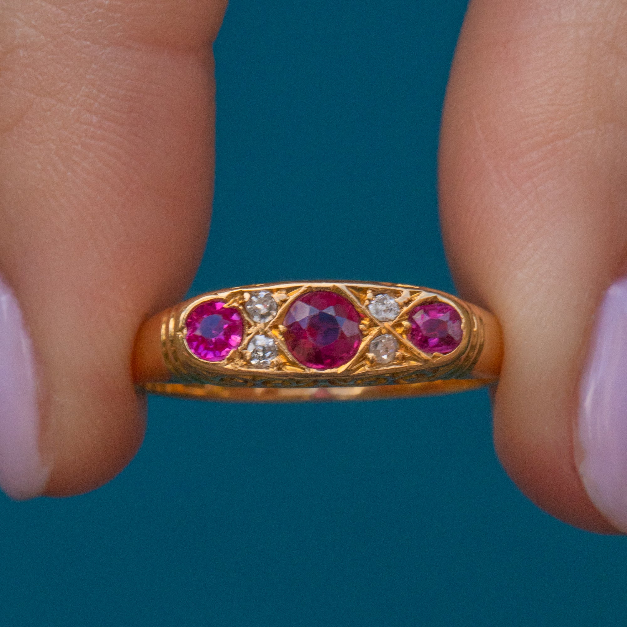 The trio of fuschia-infused Sapphires will instantly seduce you, accompanied by Diamond spacers all held proudly in a decorative scrolled gallery. The low profile of this Edwardian ring makes her ideal for stacking; she would make a pretty choice for a unique engagement ring!