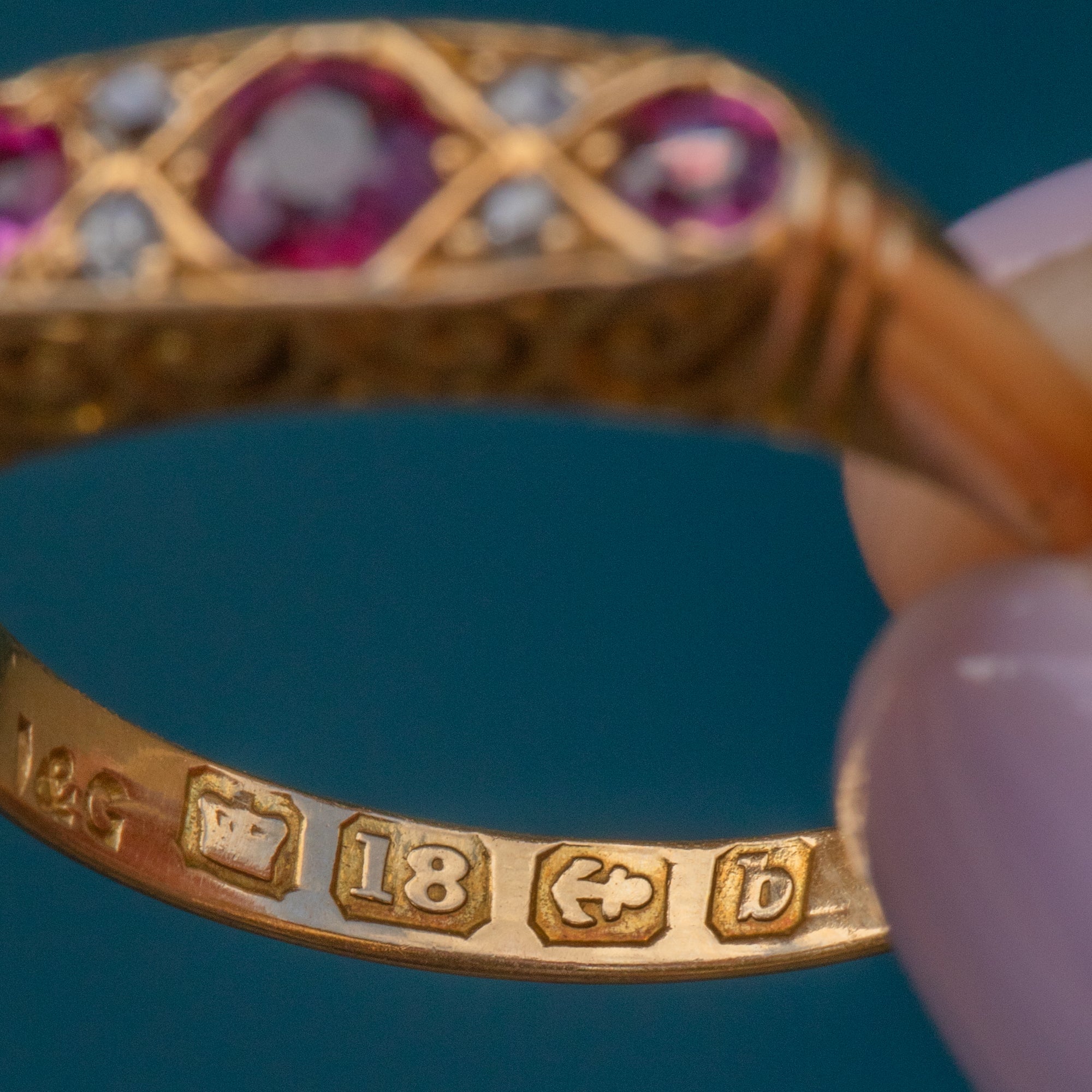 I&G Makers mark, Crown, 18, Birmingham Anchor, Date letter 'b' for the year 1901 inside band.