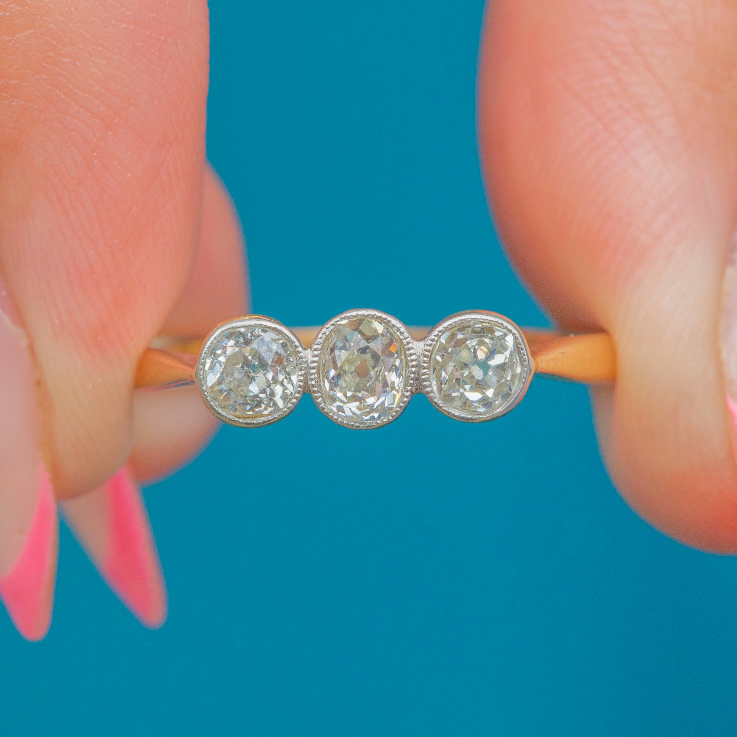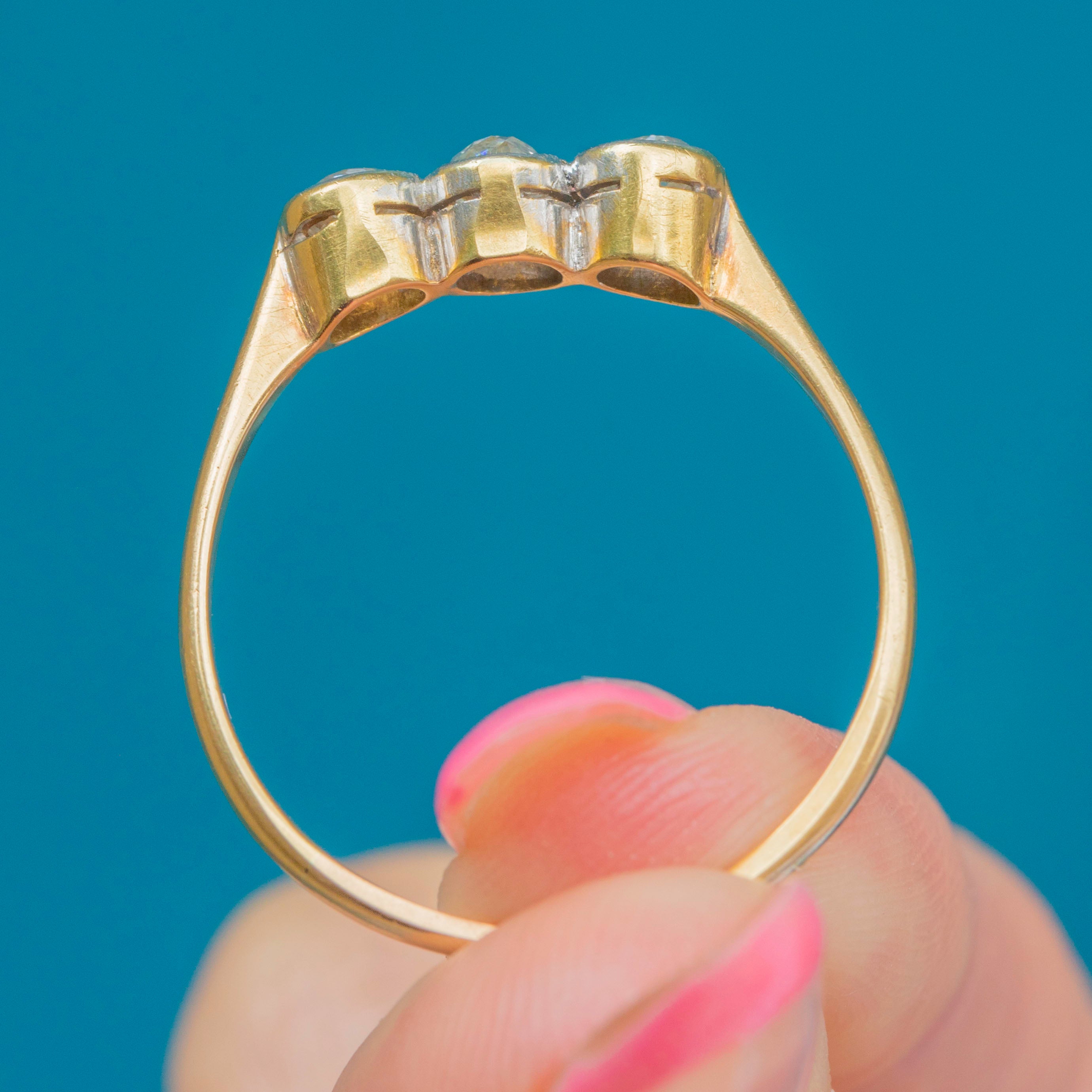 A fabulous antique 18ct Gold & Platinum bezel-set old-mine-cut Diamond trilogy ring!