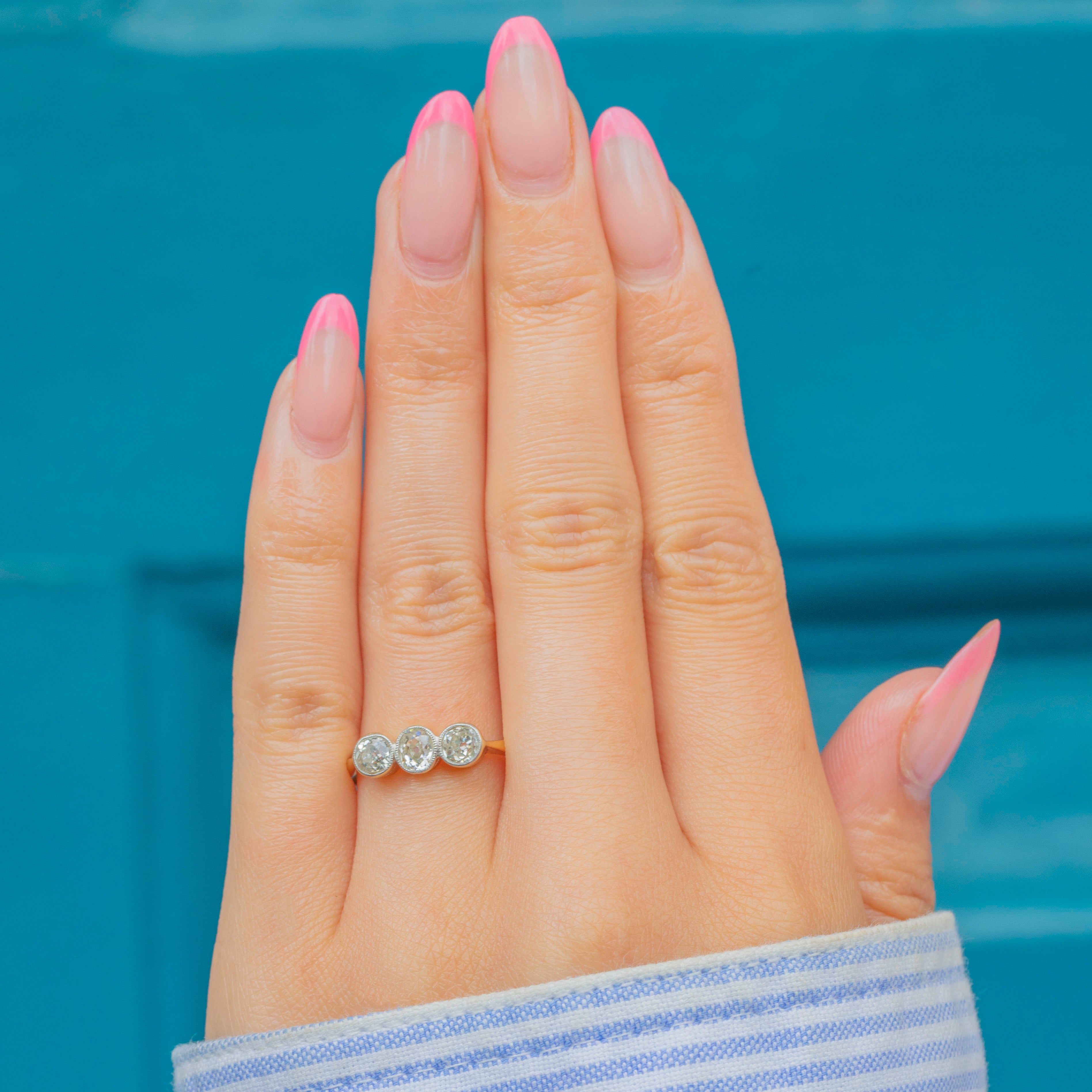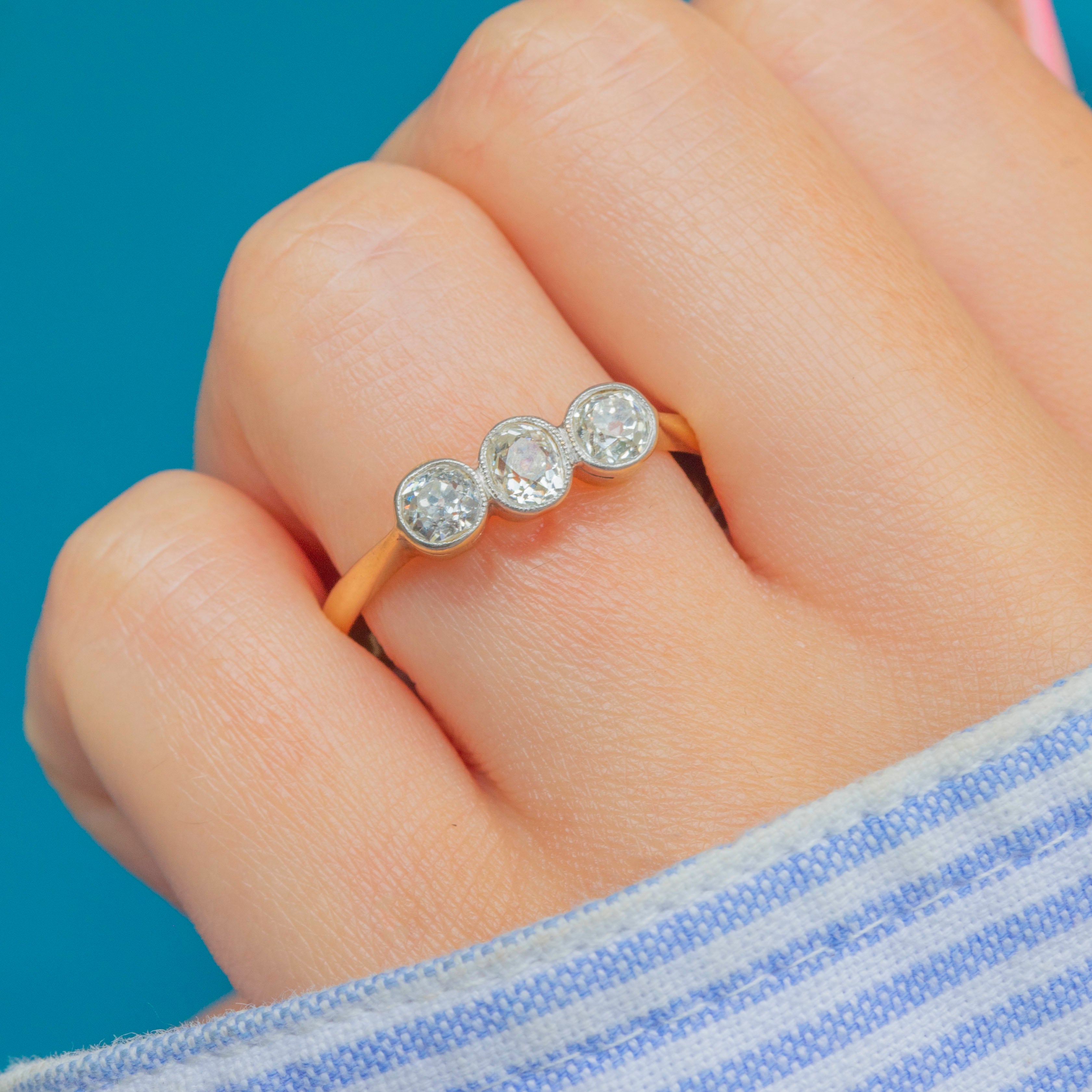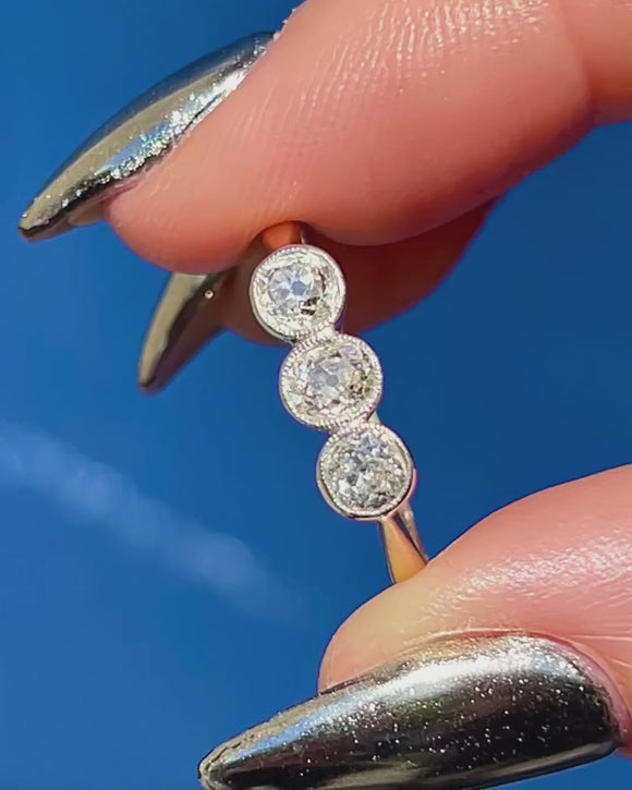 Weighing 0.54ct combined, this Art Deco ring flaunts three fabulous old-Mine cut Diamonds, each with a distinct scintillation. They are each set within lustrous Platinum bezels and rest on a buttery 18ct Gold band, making this antique Diamond ring ideal for everyday wear.