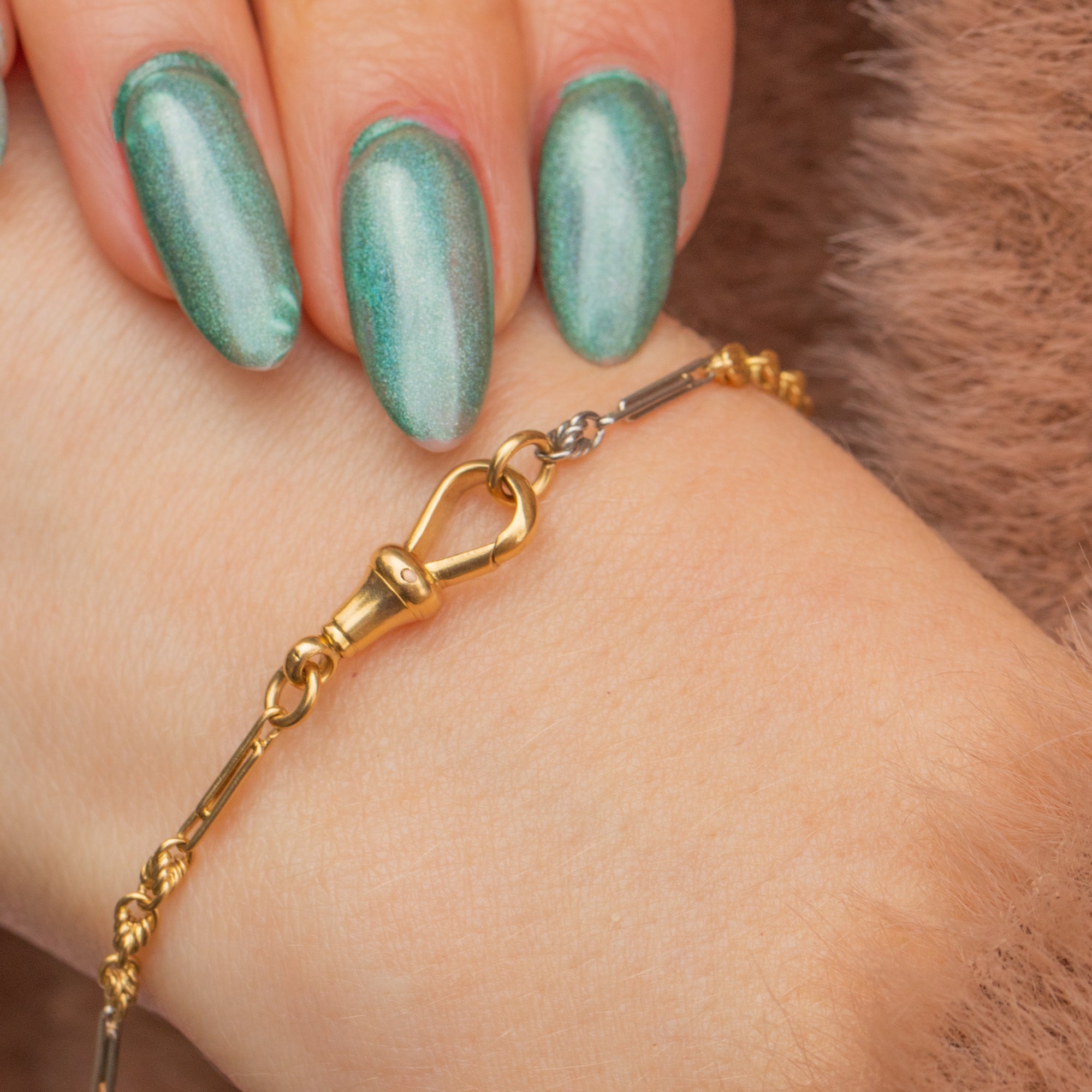 Bound together by a dog-clip attending to all your charm-holding needs, this Art Deco bracelet will beocme an everyday essential. Packing a serious punch, this luxurious piece provides enough of a statement to be worn as a stand alone piece!