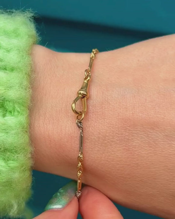 This antique 18ct Gold and Platinum bi-colour bracelet will be the hot topic of conversation as she adorns your wrist! Platinum and Gold lover's knots and paperclip links are entwined to form her 7.5" length; the contrast of mixed metals is what will set your collection apart from the rest.