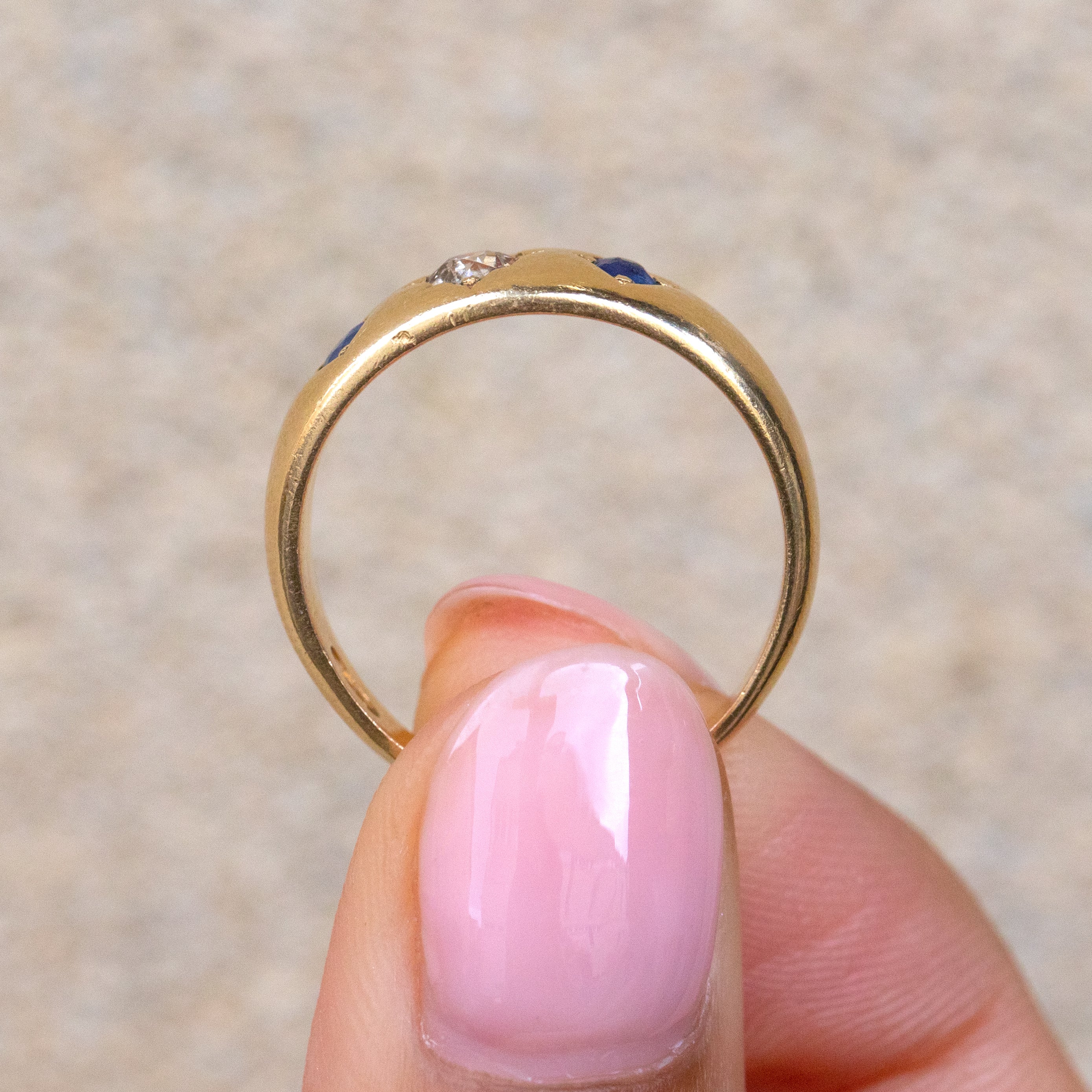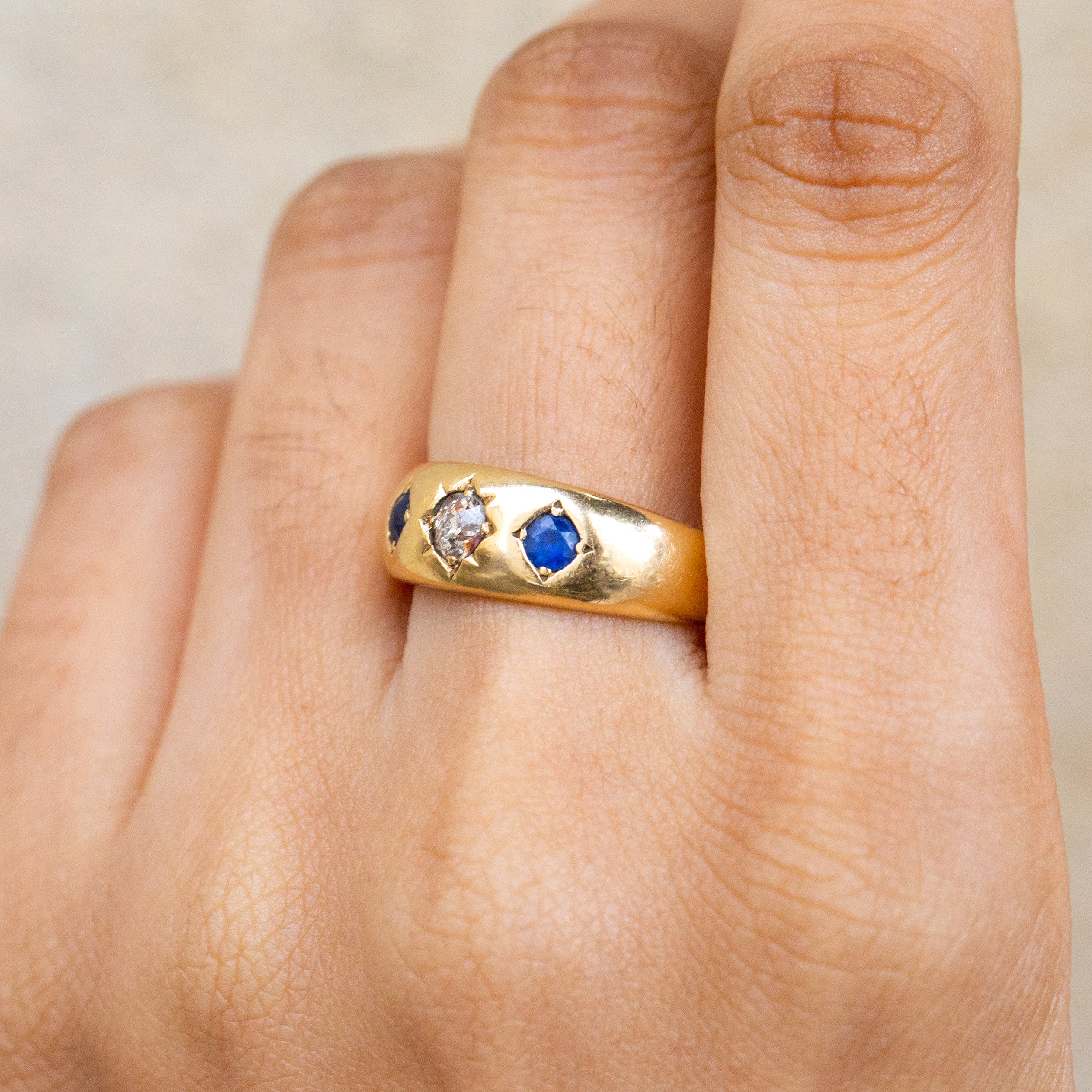 Like a scene from a midnight sky, this antique 18ct Gold Sapphire Diamond gypsy ring will fulfil all your celestial dreams! A scintillating Old-Mine cut Diamond is positioned at her centre flanked by two unmissable Sapphires, exuding royal blue tones from each hand-cut facet.