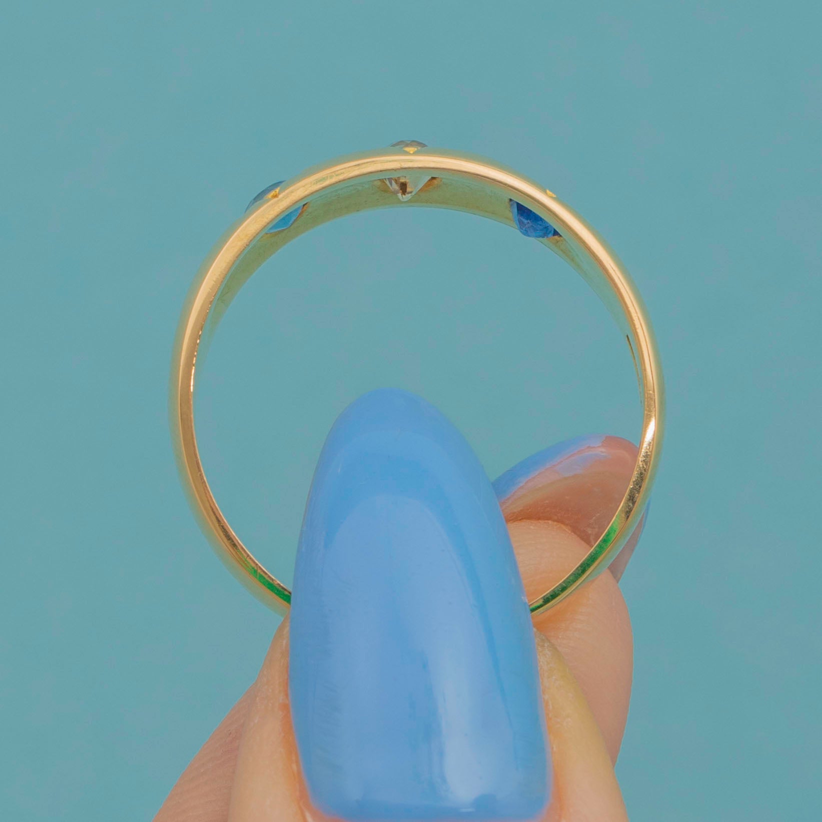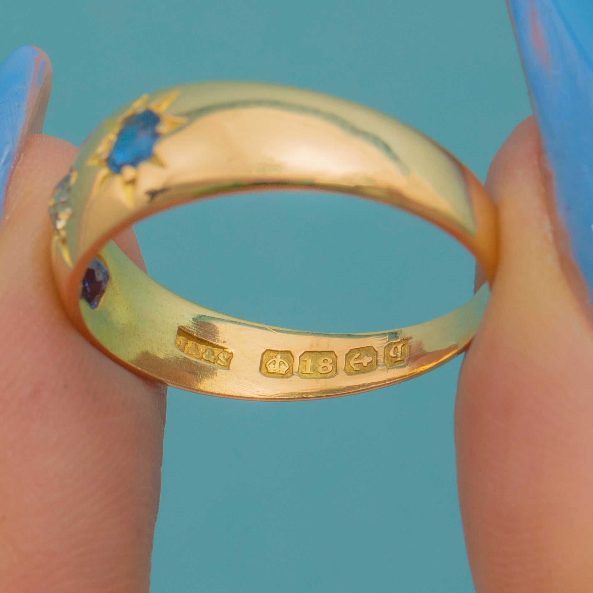 VERY GOOD-EXCELLENT. This antique 18ct Gold Sapphire Diamond gypsy ring is in wonderful condition. The Gold is saturated throughout and the band has retained its form well, with only some very minor age-related wear. The gemstones are all free from any chips or fleabites, each one securely nestled within its flush setting. Complete with a full set of antique hallmarks, this early 20th-century ring will make a fine addition to your collection!