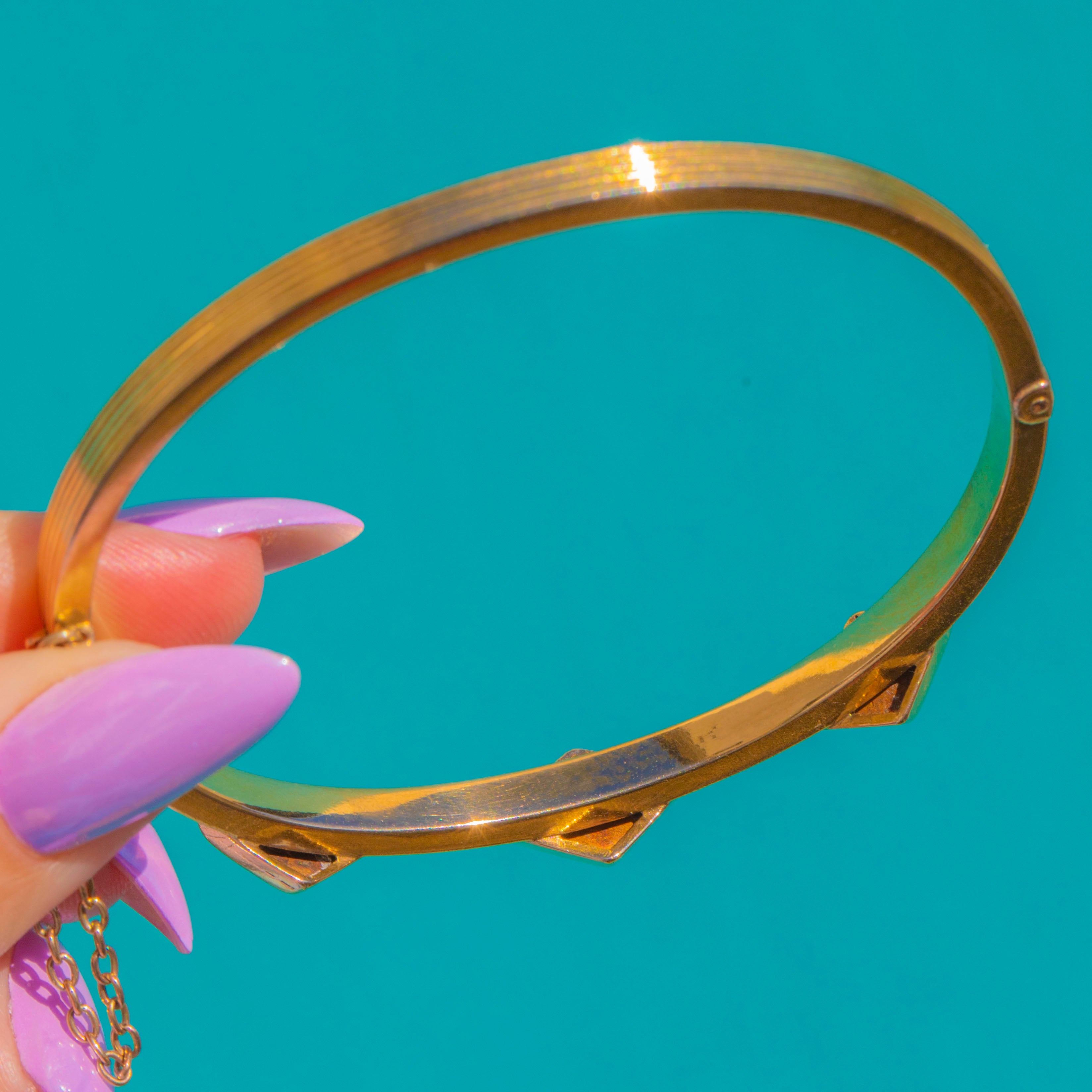 Practical as it is elegant, the bangle secures with a neat clasp and a 9ct Gold safety chain for added peace of mind. A timeless accent that stacks seamlessly or sings solo, it carries the poise and polish we love from the late 19th century.