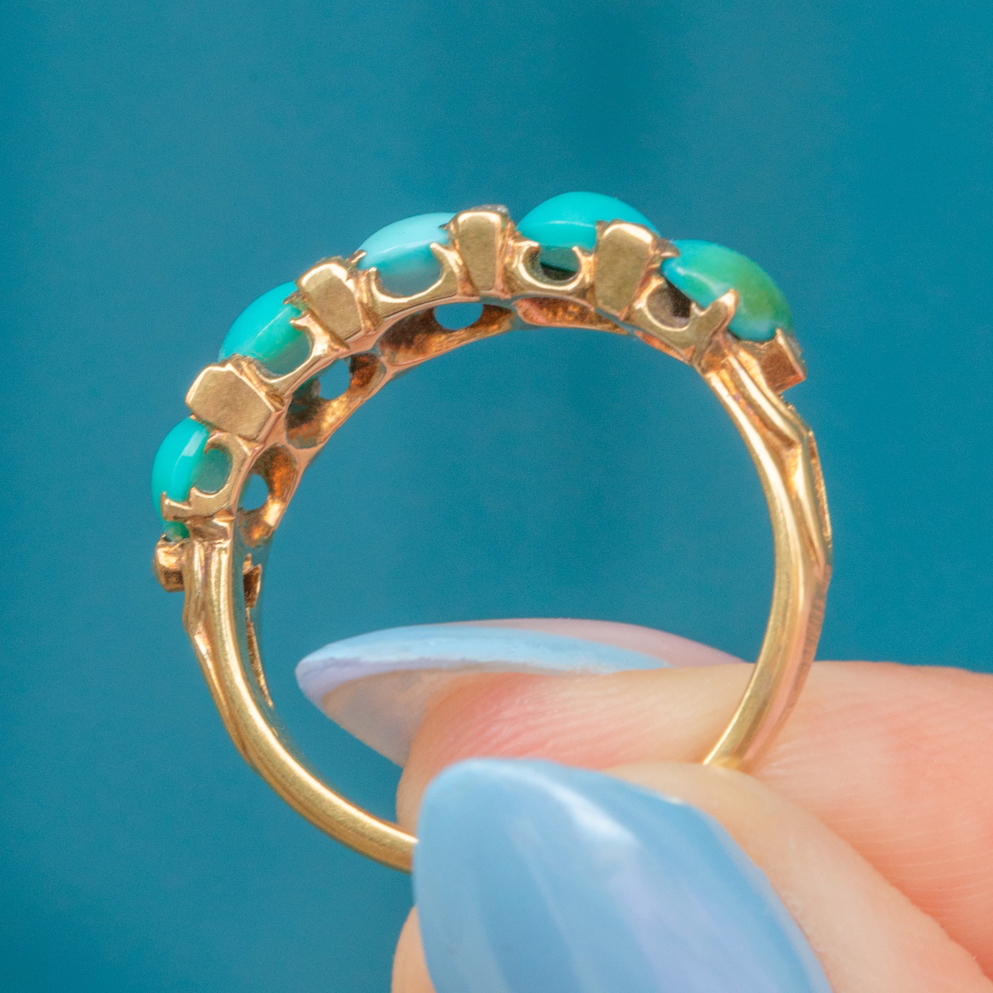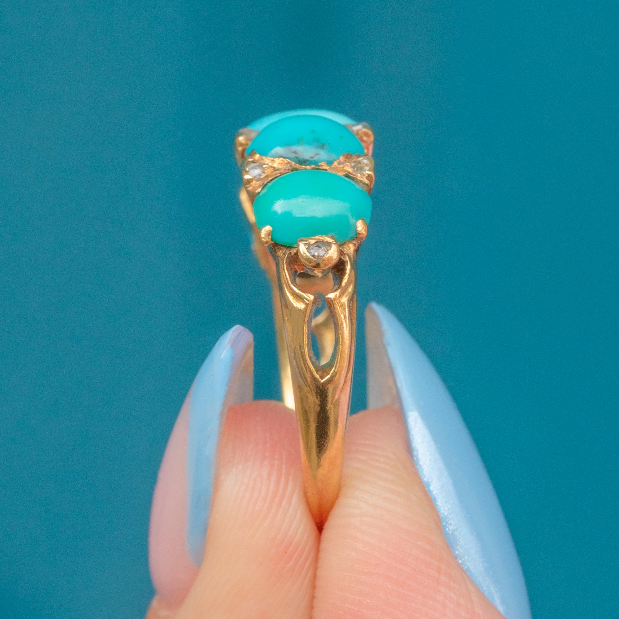 A striking Victorian Turquoise ring, with rose-cut Diamond spacers for added sparkle. A classic Victorian combination, this 18ct Gold ring provides the finger with great coverage due to its half-hoop design.