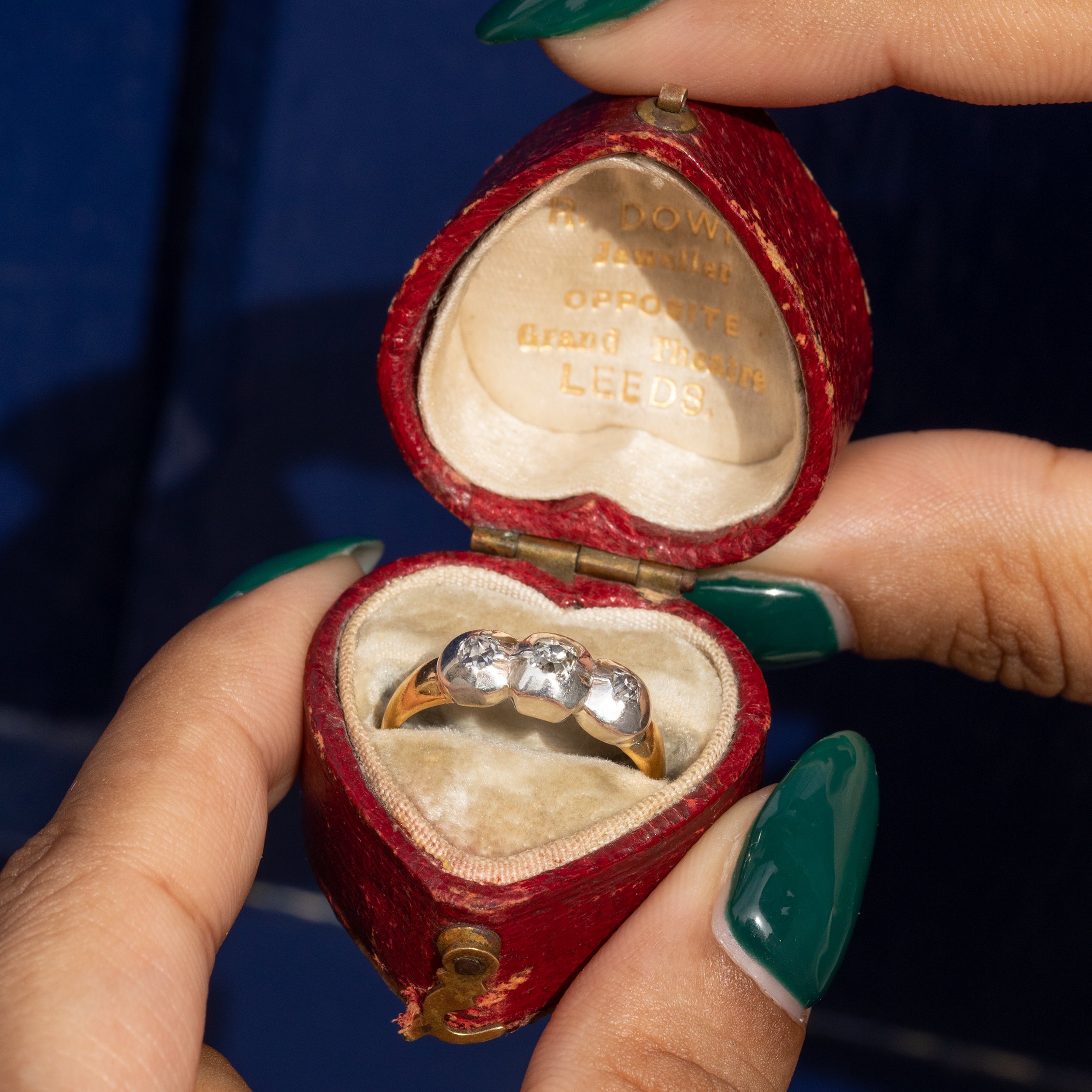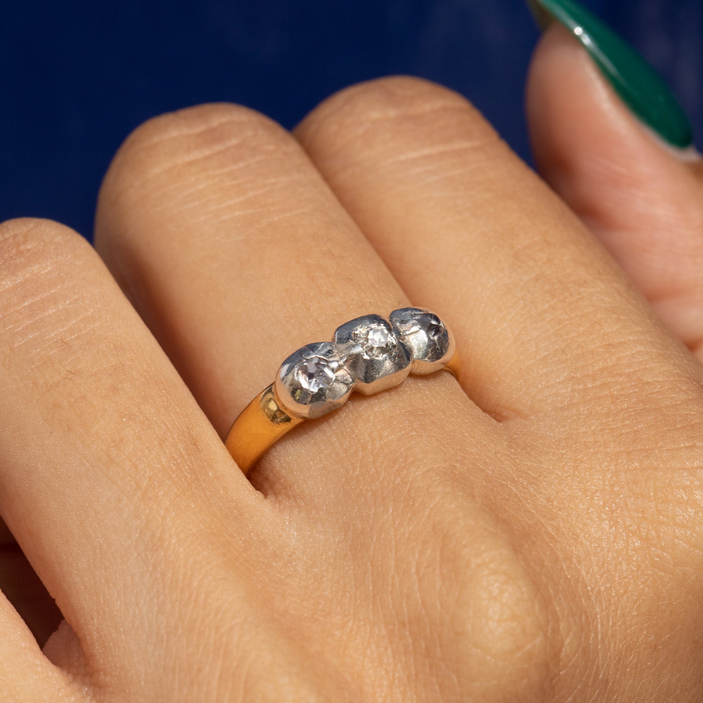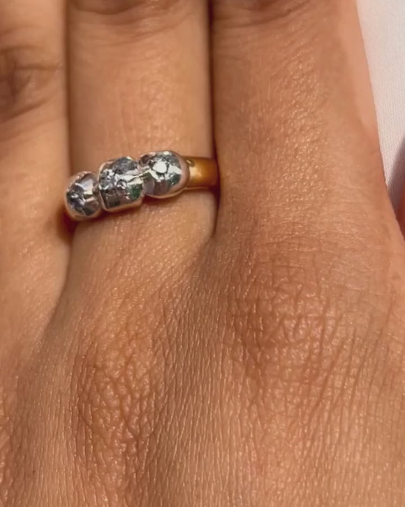 VERY GOOD TO EXCELLENT. This antique 18ct Gold table-cut Diamond three stone ring is in fabulous condition. The Diamonds have a beautiful sparkle and are held securely within their Silver setting, free from any nibbles. The 18ct Gold is buttery and the band is robust, the inside of the band has obscured hallmarks that have been lost over time from wear. The Silver settings are lustrous with only minor surface wear, but rest assured that the Diamonds are securely set. The band is sturdy and smooth, allowing you a comfortable fit. With proper care and maintenance, this ring will last for generations to come!