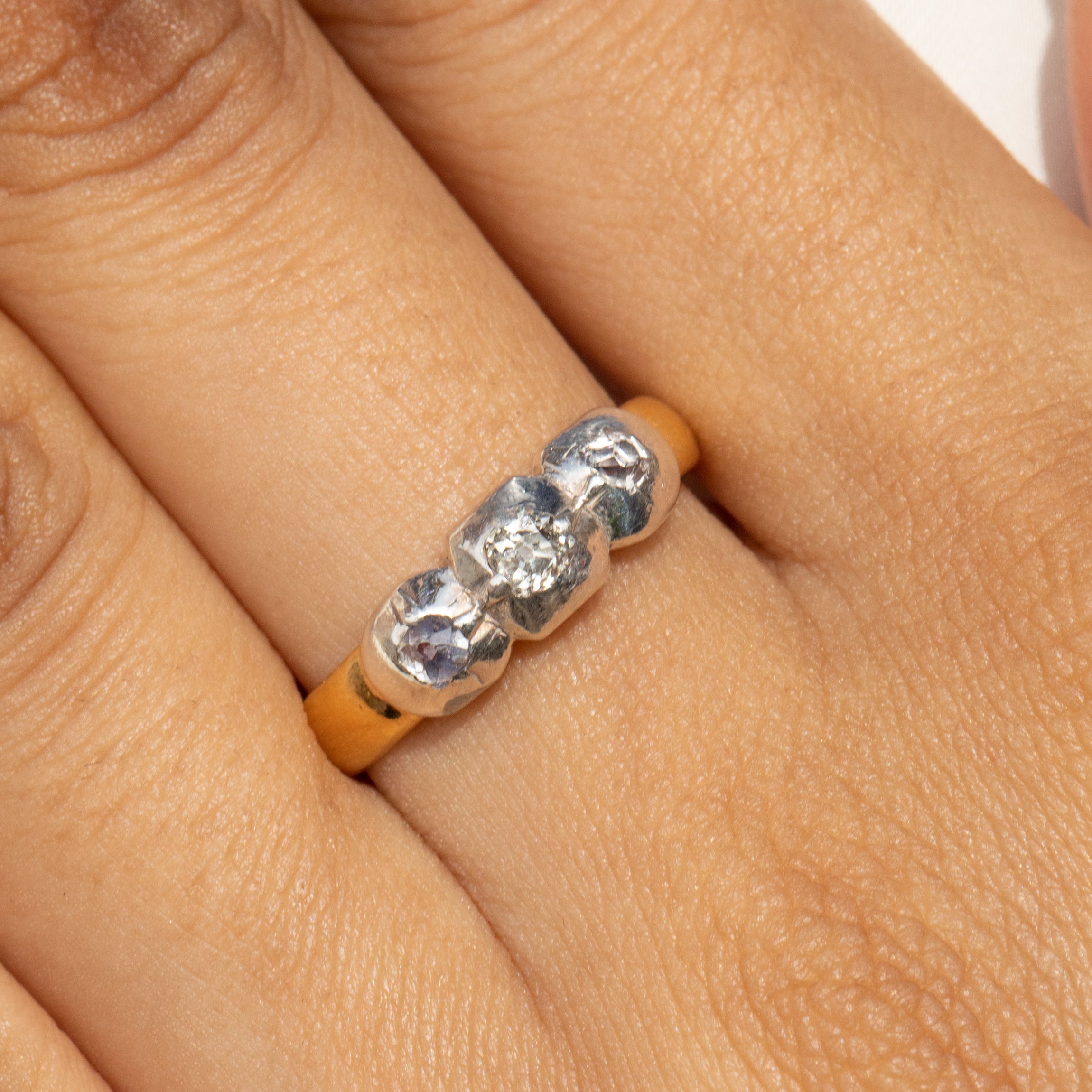This early 20th-century trilogy ring displays three table-cut Diamonds in a Silver setting, giving it a celestial ambiance and adding a touch of elegance to any ring collection.