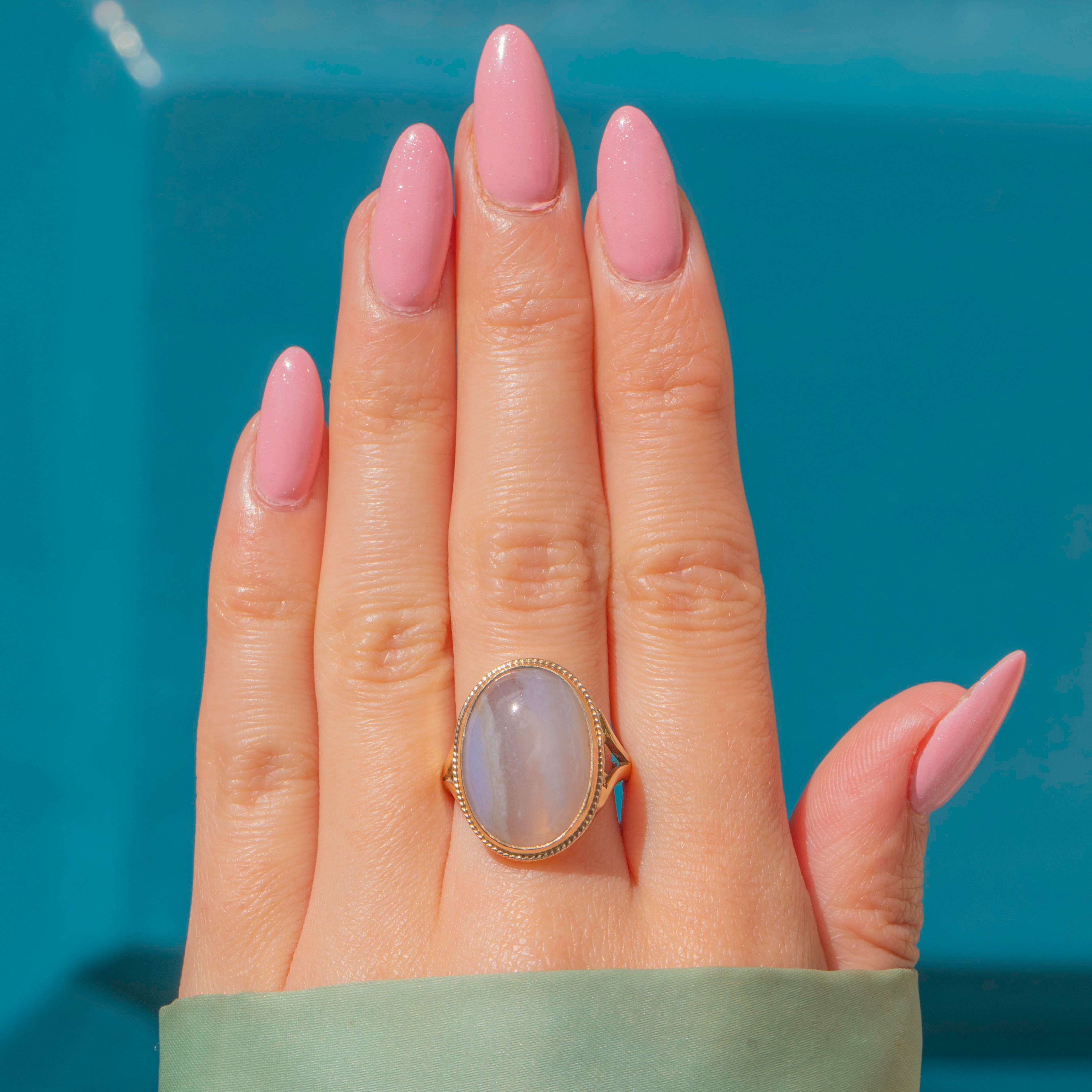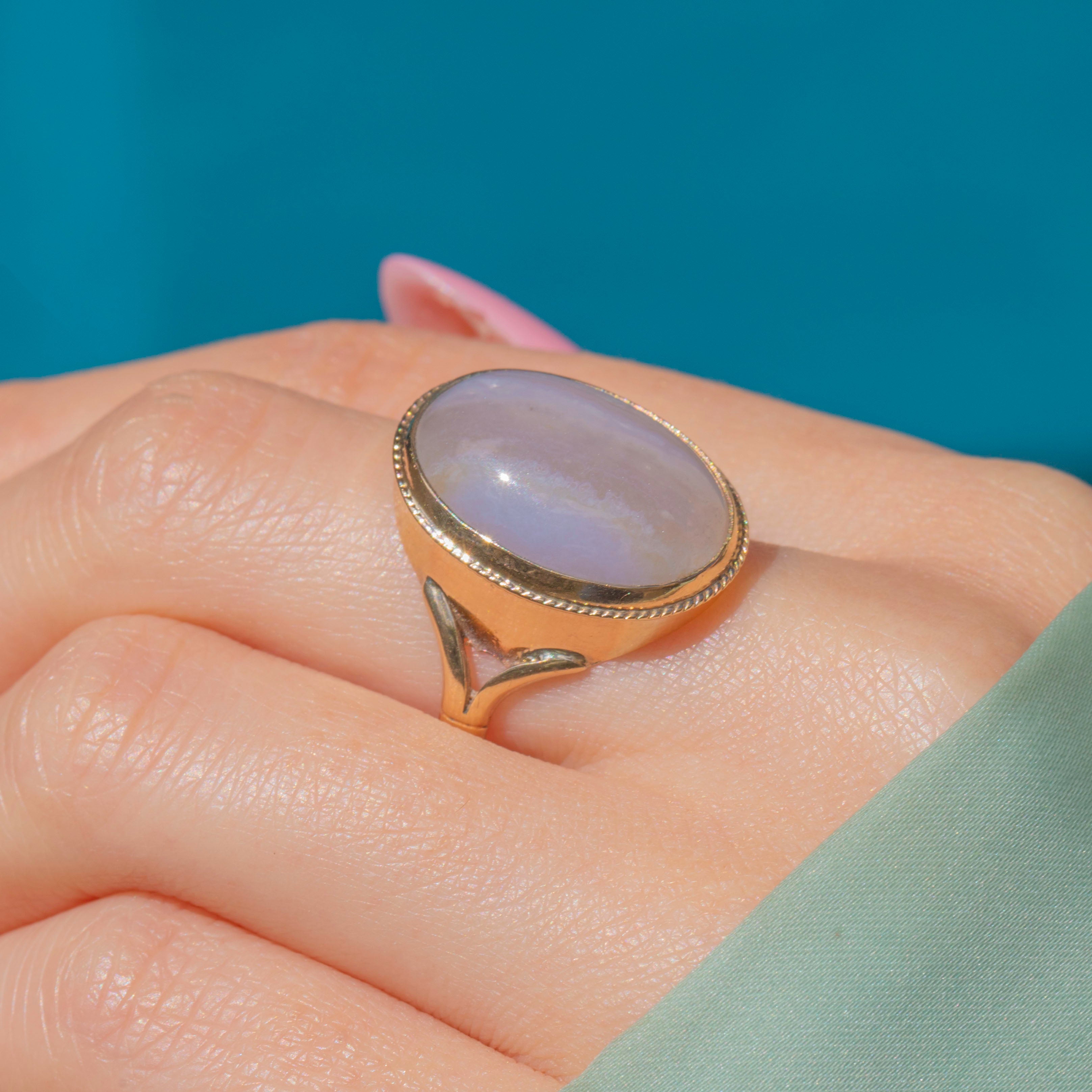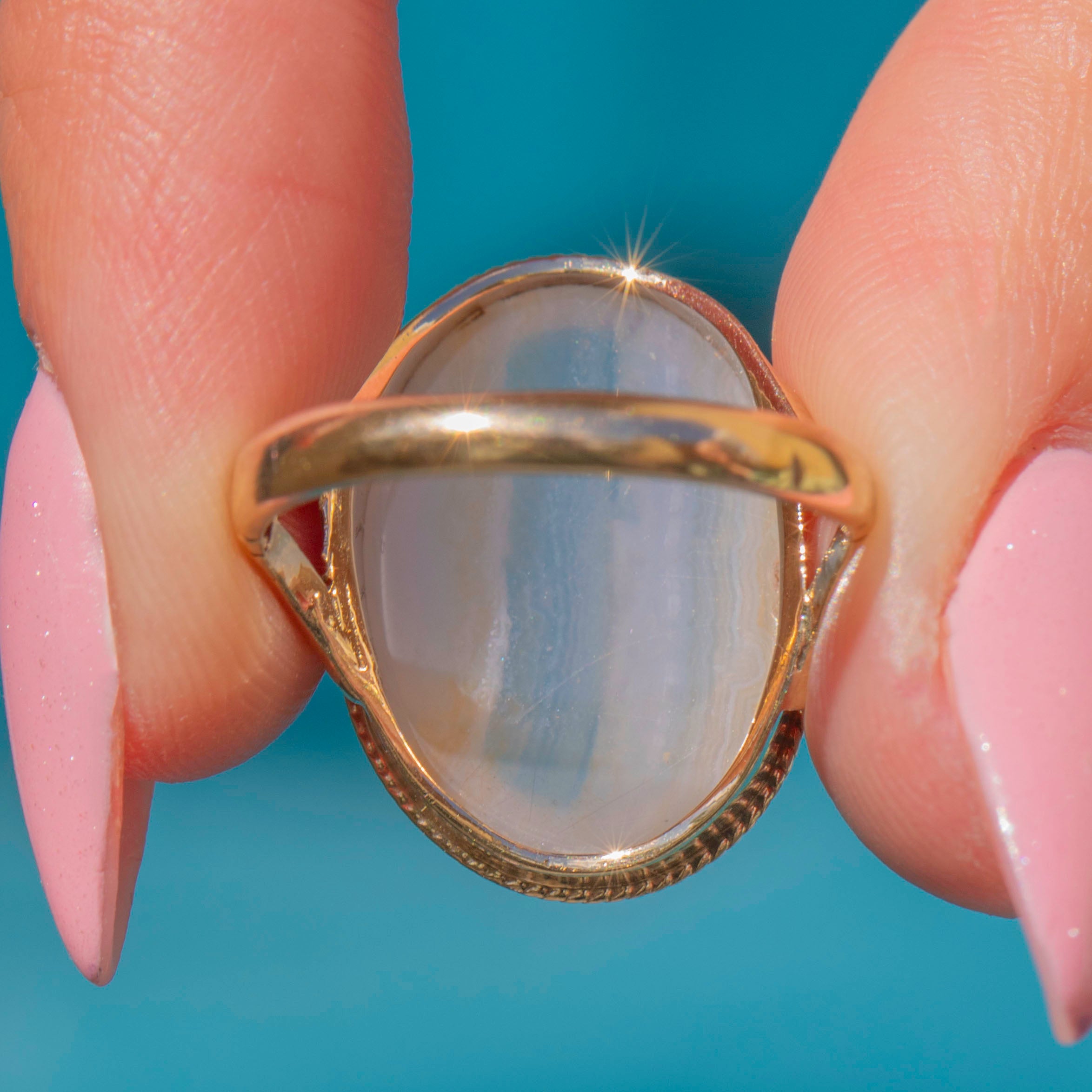 In her centre sits a large pastel blue-lilac Agate stone, adorned by creamy banding, akin to the surface of Neptune. She is encircled by a glossy 9ct Gold bezel, with subtle rope detailing for a textured, elegant finish.
