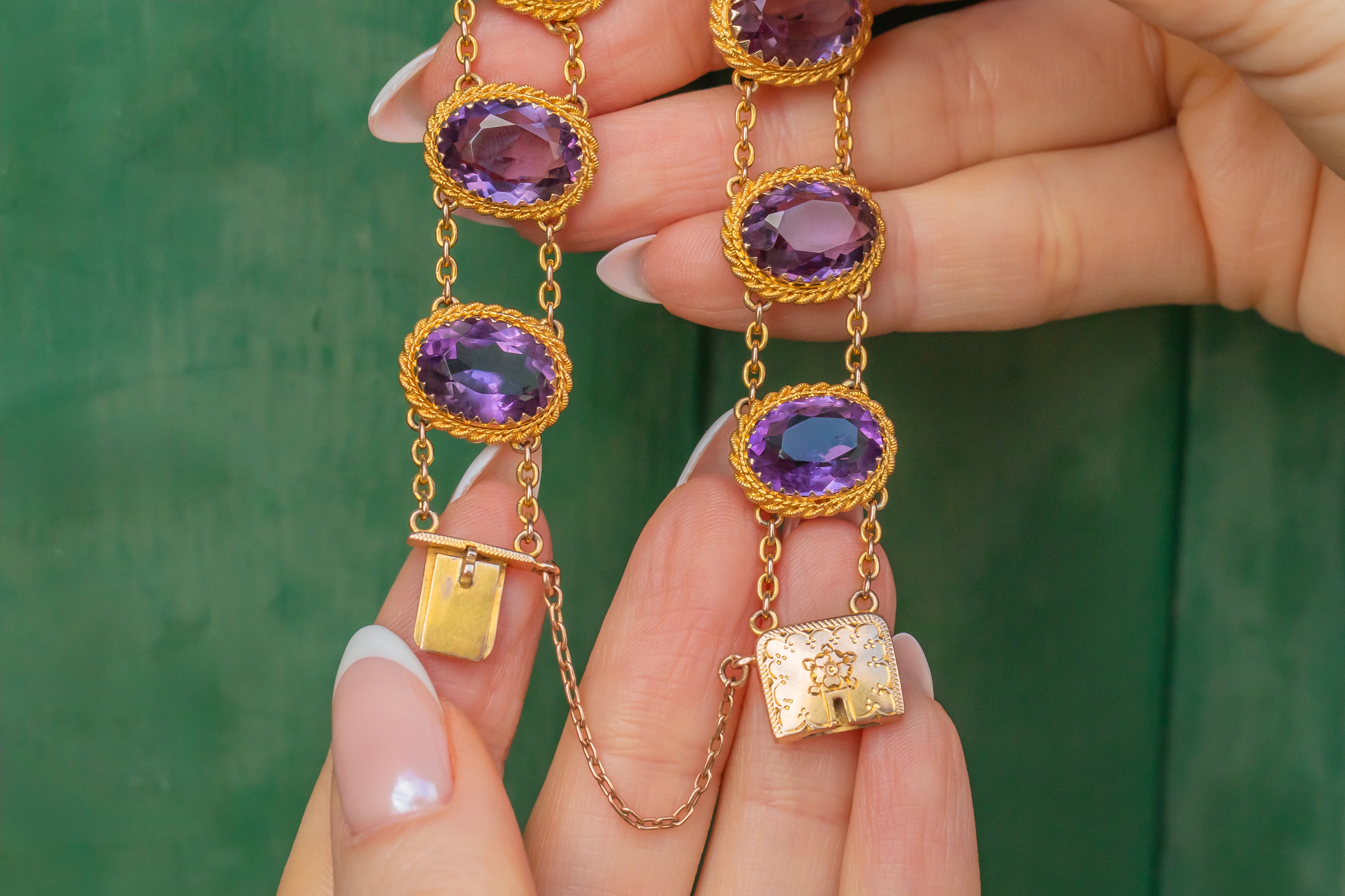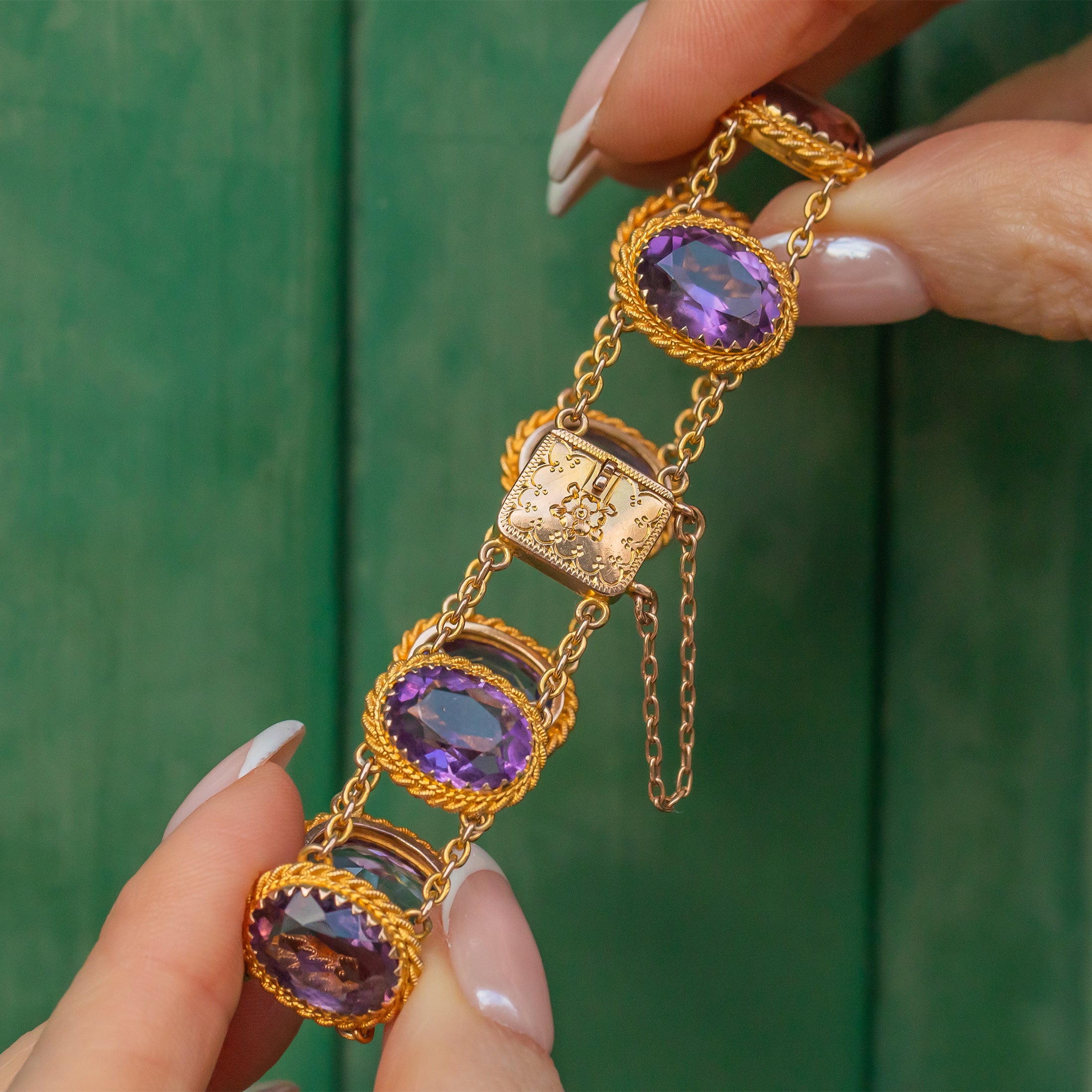 EXCELLENT. We are pleased to present this antique 9ct Gold Amethyst bracelet in excellent condition! Each Amethyst is present and secure, with a consistent vivid purple hue. The chain is firmly affixed to each setting, creating a lovely fluidity throughout the piece, allowing her to caress any wrist she adorns. The clasp shuts with a firm 'click' and with a safety chain, she comes with an extra layer of security so you can wear it with confidence!