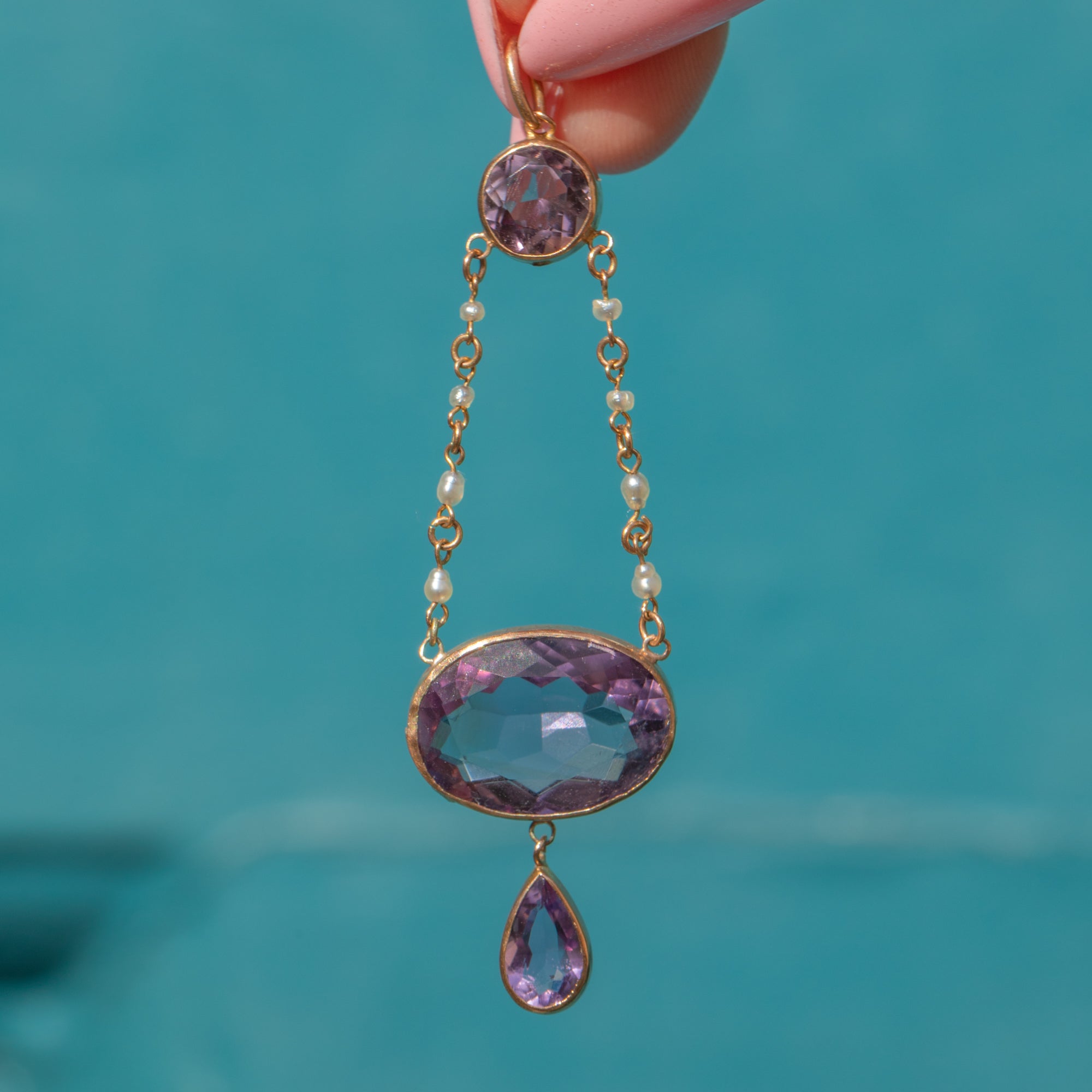 Antique 9ct Gold Amethyst Pearl Drop Pendant, 6.06ct