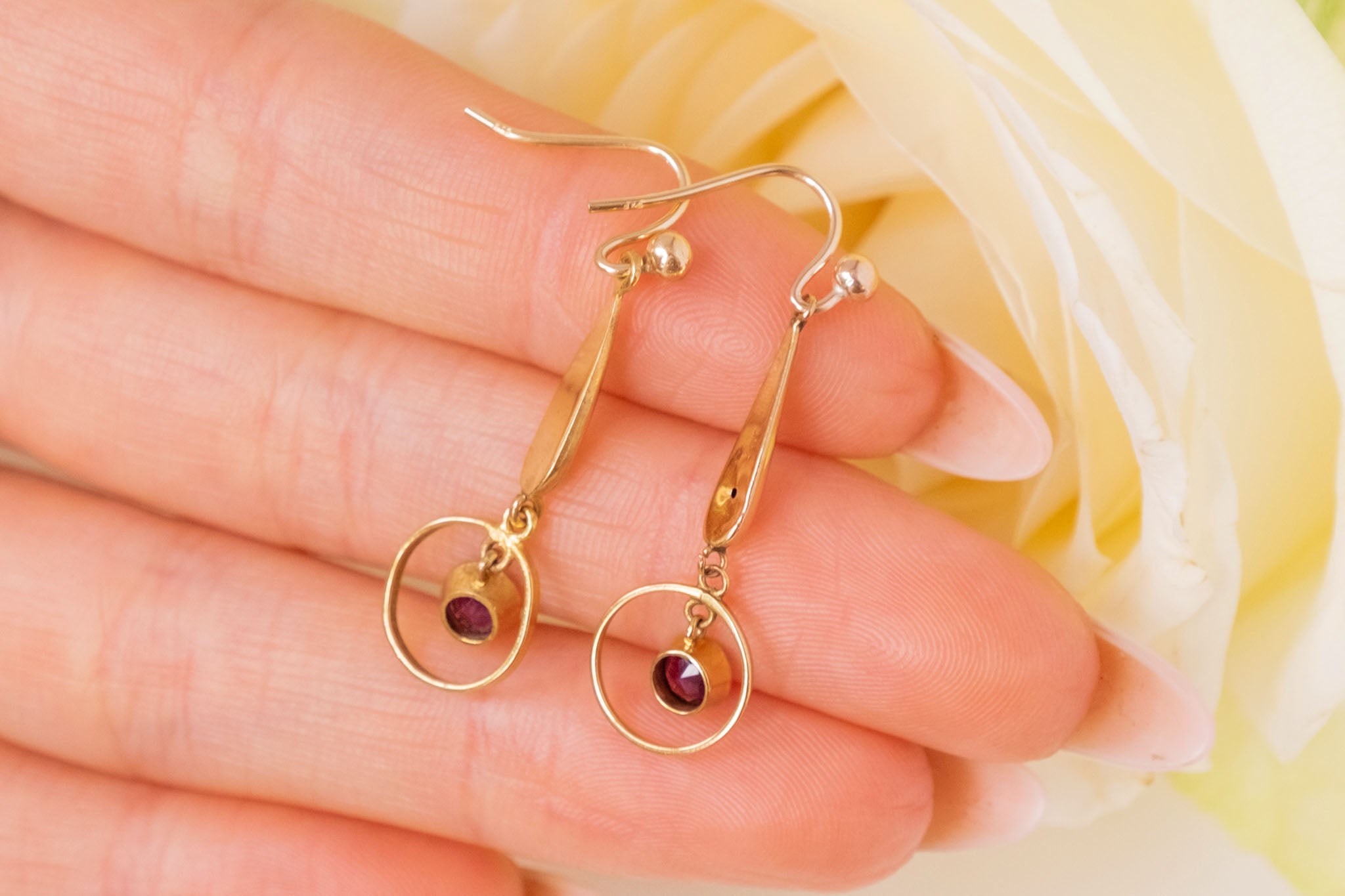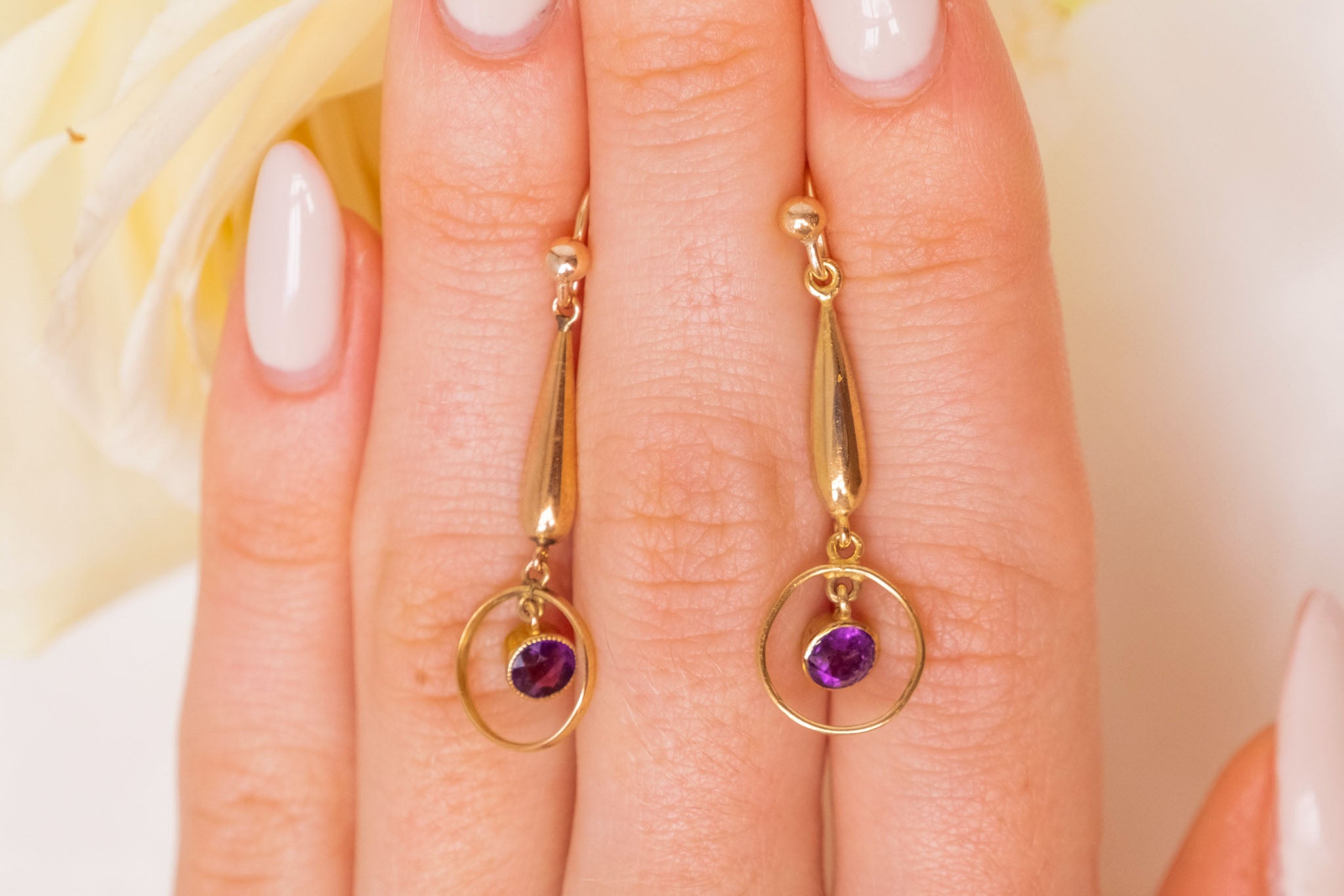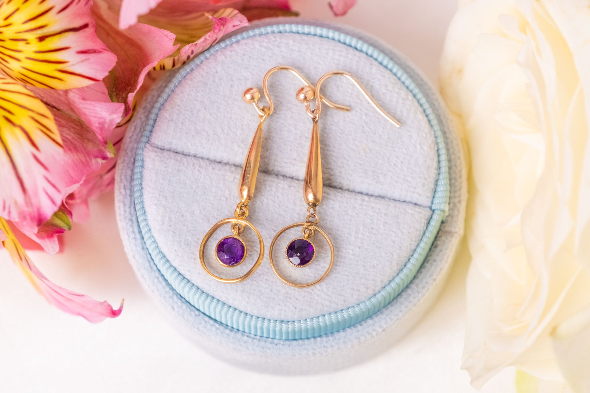 The most delightful pair of antique 9ct Gold Amethyst target drop earrings! Poised at the bottom of these lovely ladies is a violet Amethyst encompassed by traditionally Edwardian 'target' design, orbiting around their settings.