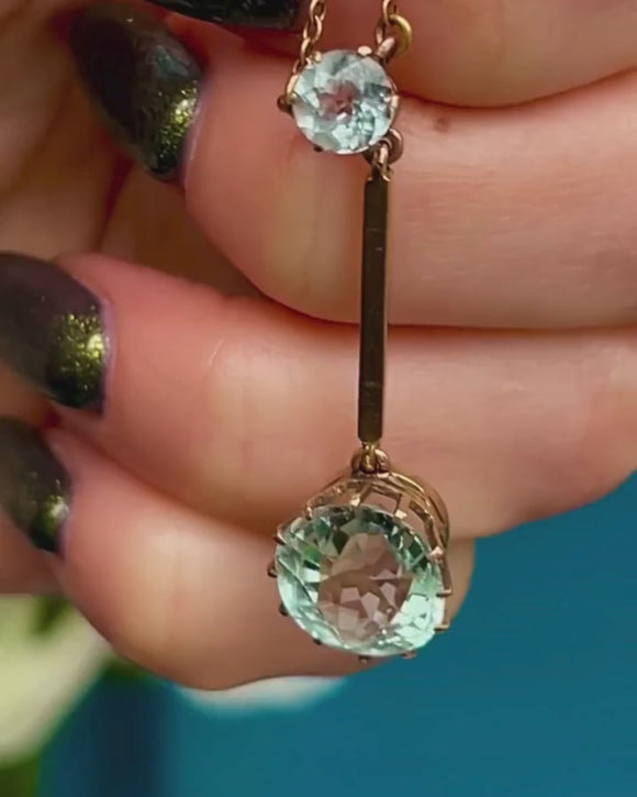 VERY GOOD. This antique 9ct Gold Aquamarine drop necklace is offered in very good condition. Both Aquamarines are held securely within their 9ct Gold setting, with each claw present. The bottom Aquamarine has some very small fleabites to some facets, but these are only noticeable under close inspection. The Gold is buttery with only some minor discolouration throughout, commensurate with age. The links are all securely connected and the bolt ring is in perfect working condition allowing you to wear this antique Aquamarine necklace with absolute confidence!