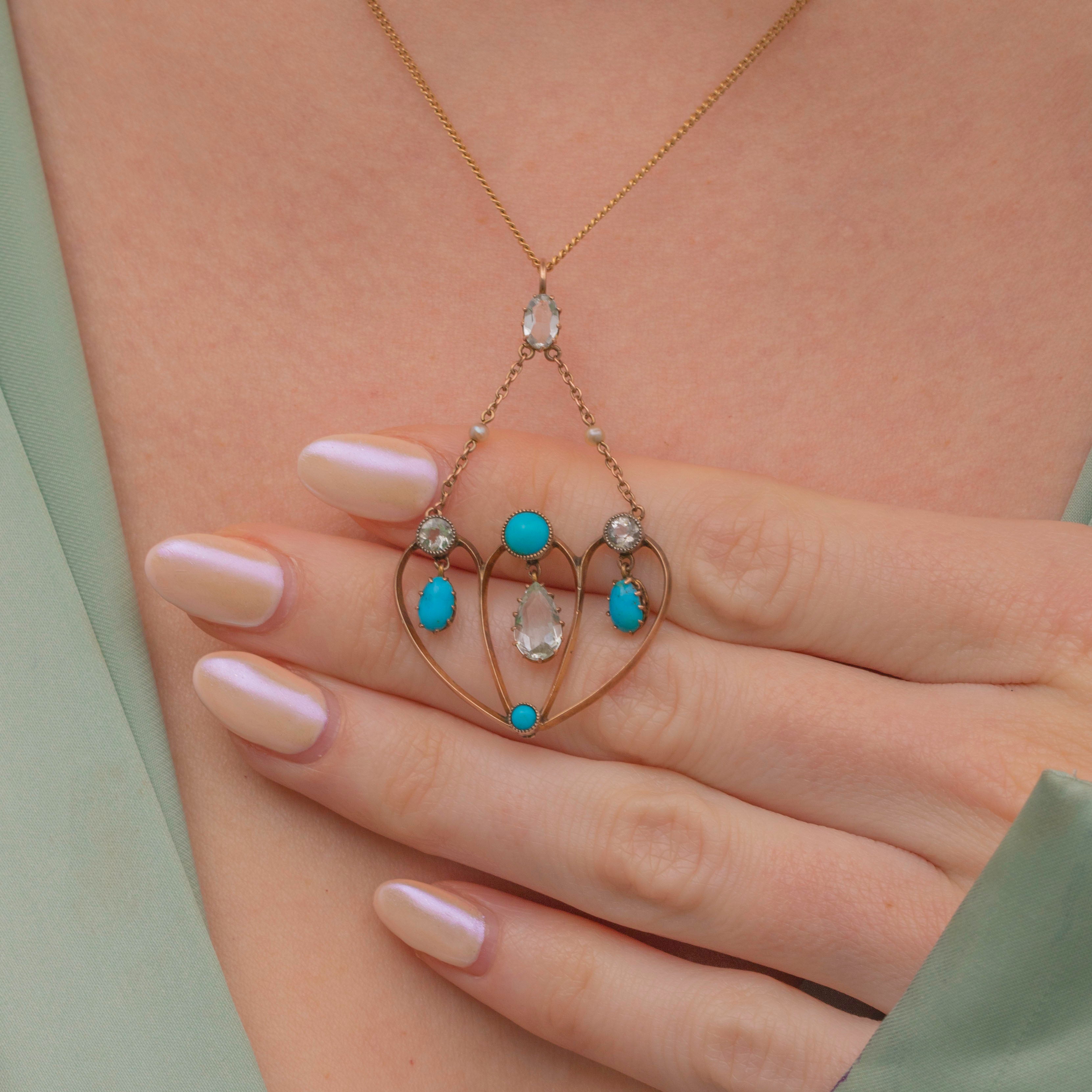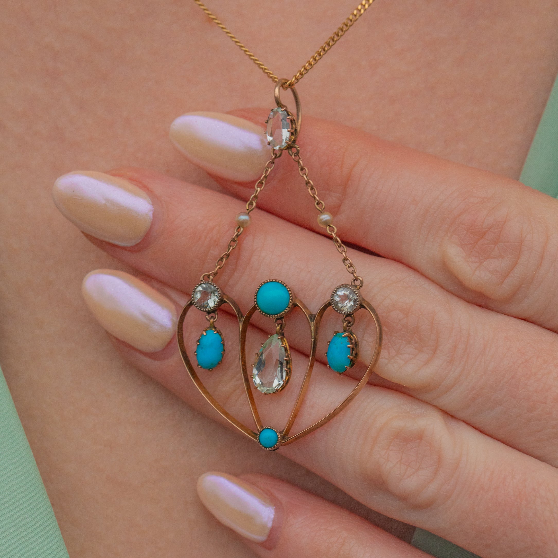 VERY GOOD. This antique 9ct Gold Aquamarine Turquoise pendant is in very good condition. The Gold has a lovely buttery hue with only minor age-related surface wear and has remained structurally sound. The Turquoise are smoothly domed and securely set, with no chips or scuffs visible. There is a minor scuff on one of the Aquamarines, but the remaining three are pristine and they have all remained secure within their settings. The trace links are firmly connected and the Pearls are pristine. Promising many more years of wear, this Victorian pendant will make a superb addition to your collection!