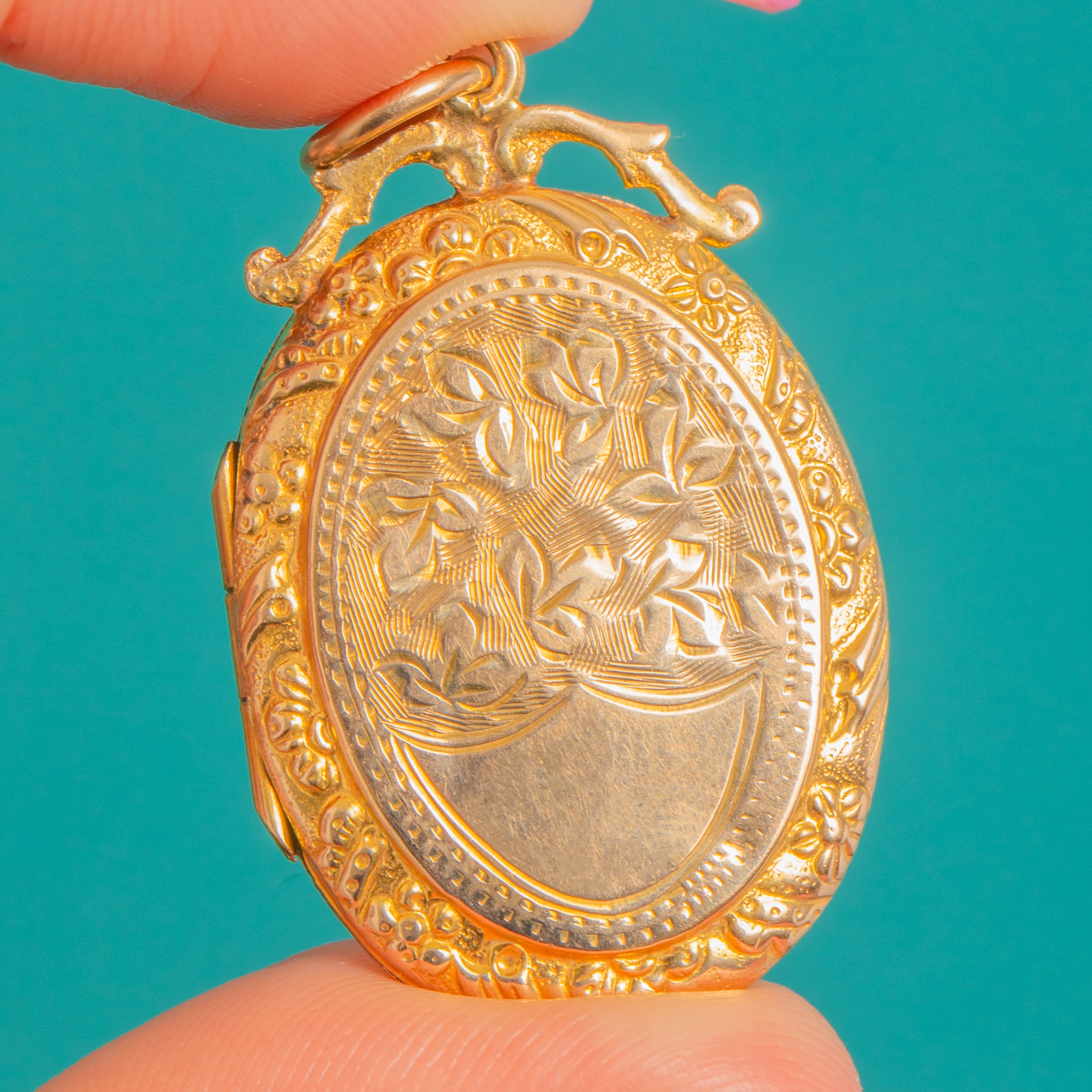 This ornate Victorian locket is a romantic keepsake in warm 9ct Gold back and front, richly detailed and framed by raised foliate and beaded ornament. The oval face is beautifully composed, with delicate scrollwork and a charming bow-like surmount to the bail that adds a softly feminine flourish.