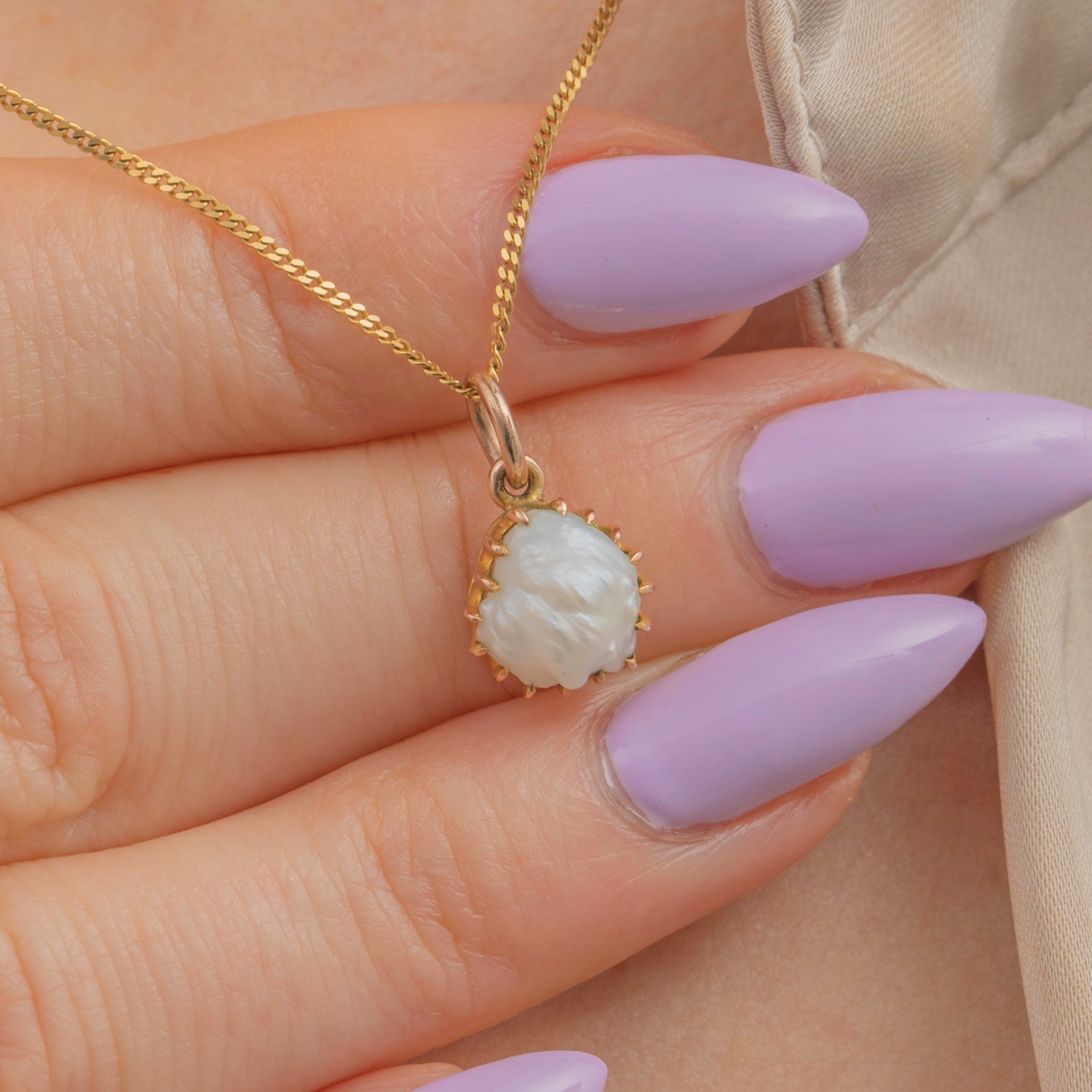 EXCELLENT. This antique 9ct Gold Baroque Pearl charm is in divine condition. Her Pearl has a naturally irregular form and beautiful luminosity, and is securely set within 9ct Gold claws. The Gold is bright and buttery, free from damage. She will easily suspend from a fine chain!